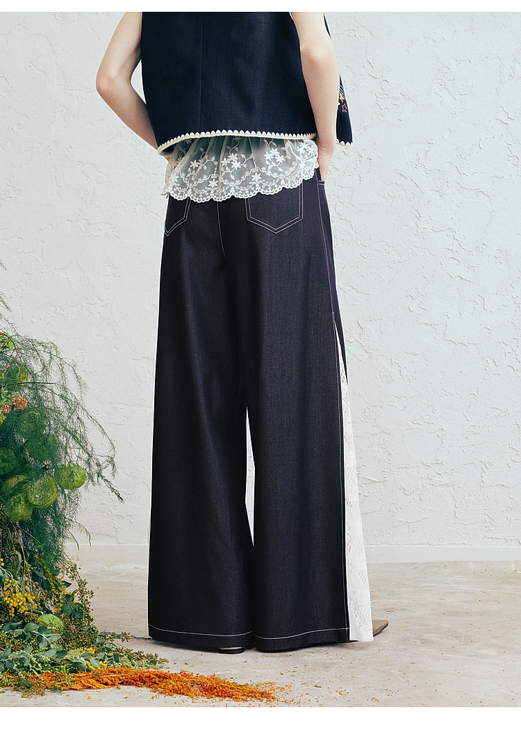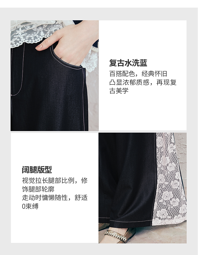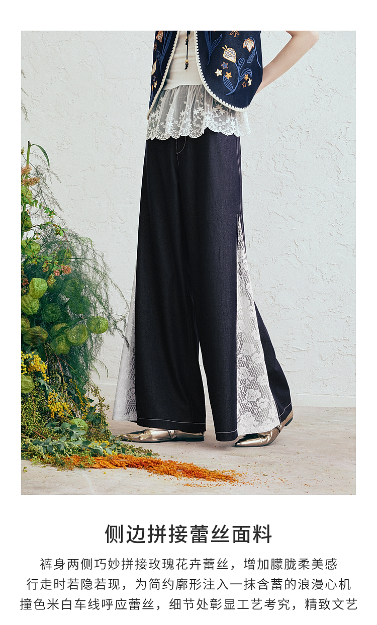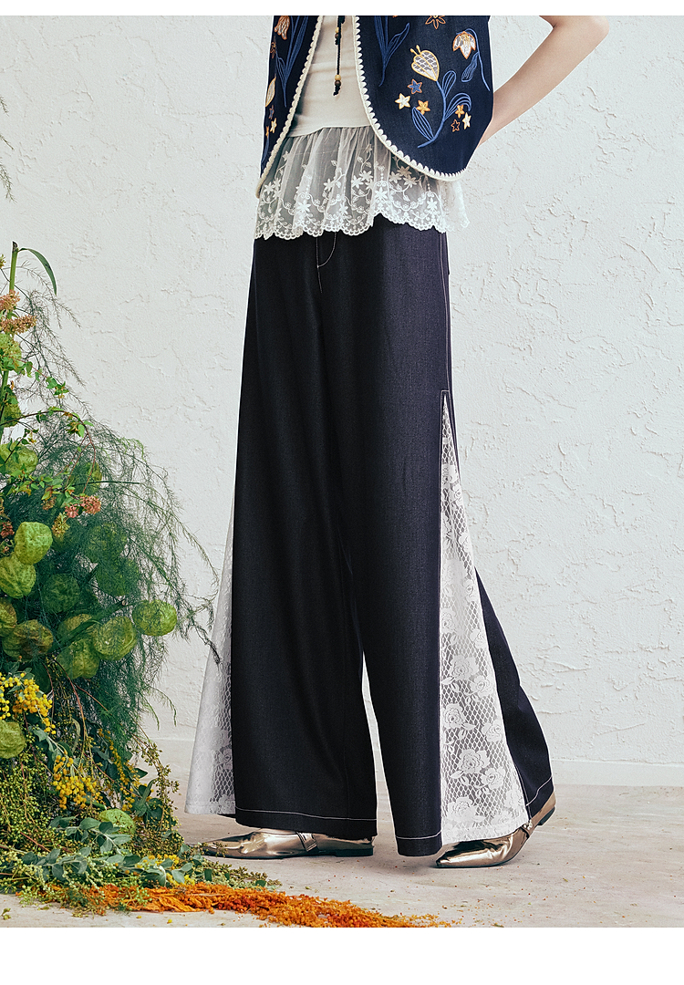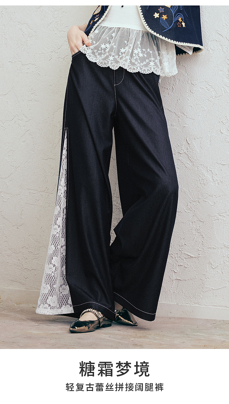 两三事 糖霜梦境 2026春季新款复古蕾丝拼接阔腿休闲裤女宽松