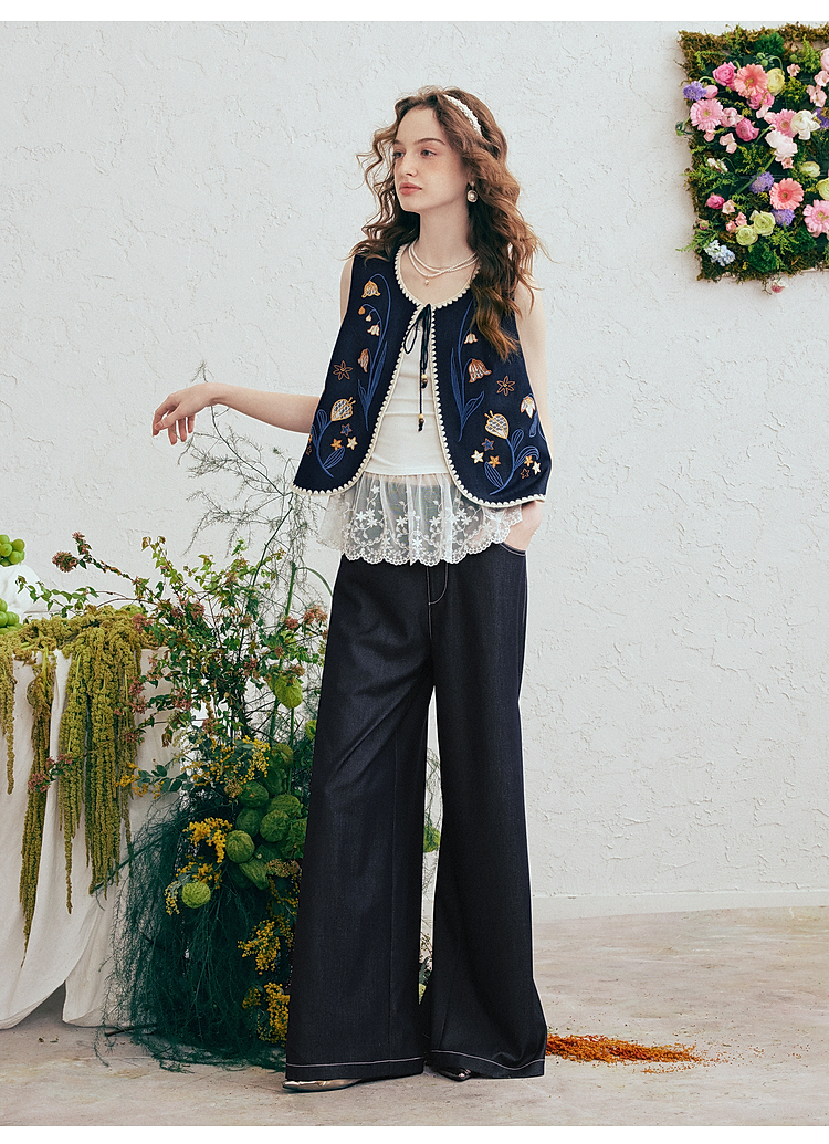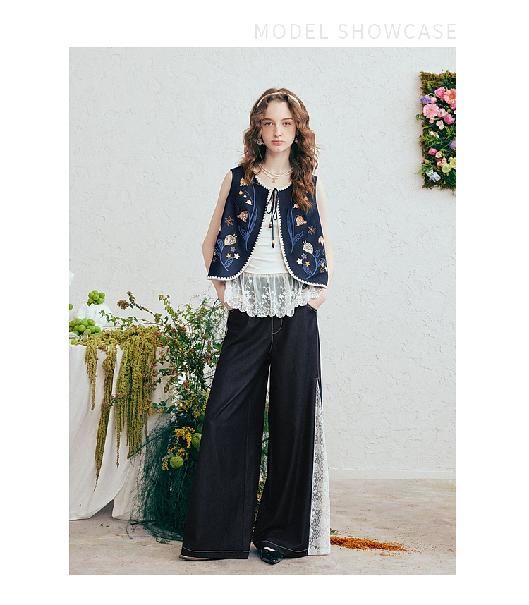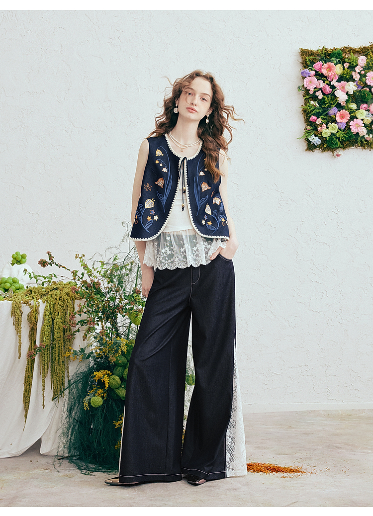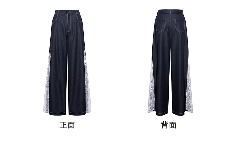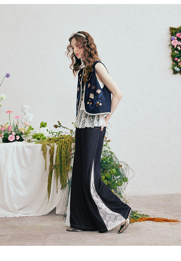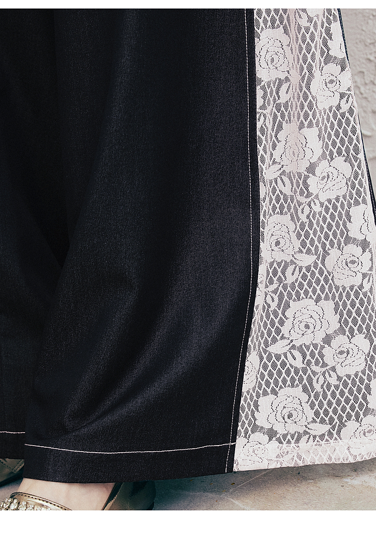 两三事 糖霜梦境 2026春季新款复古蕾丝拼接阔腿休闲裤女宽松