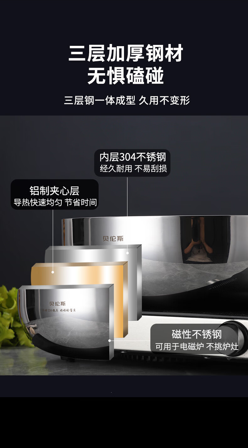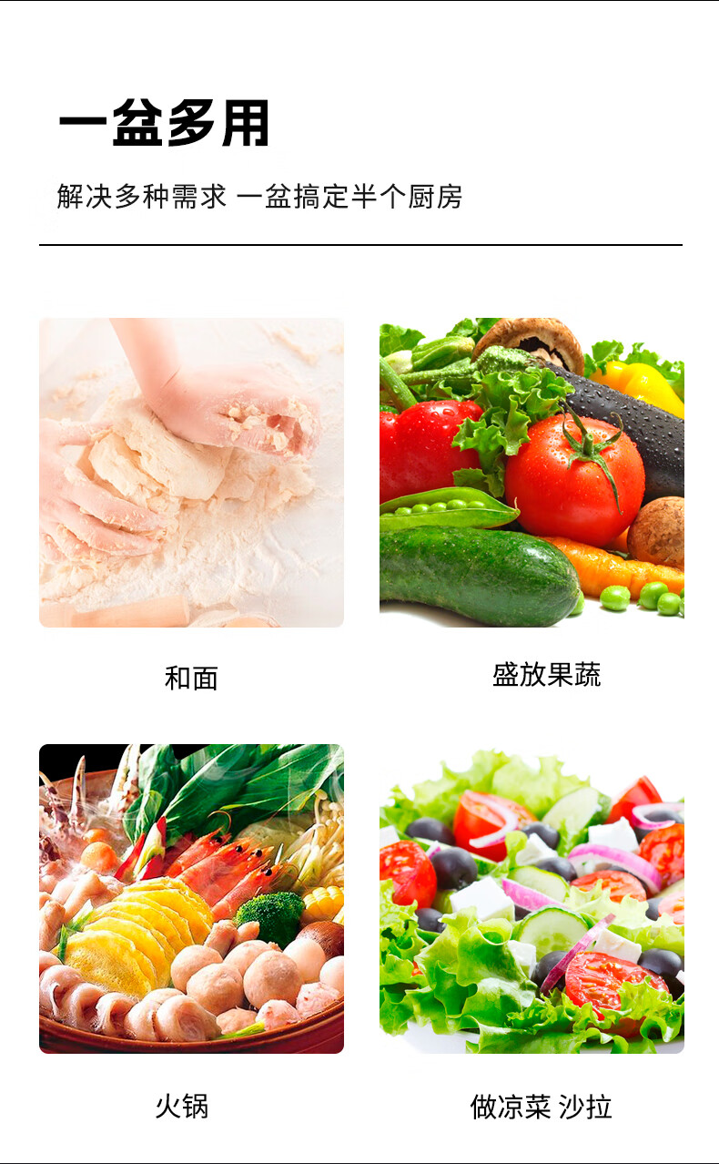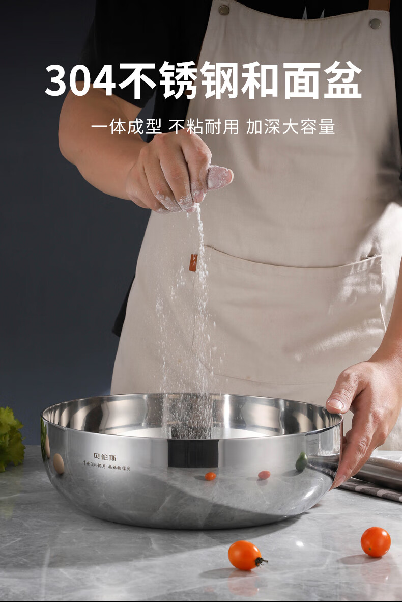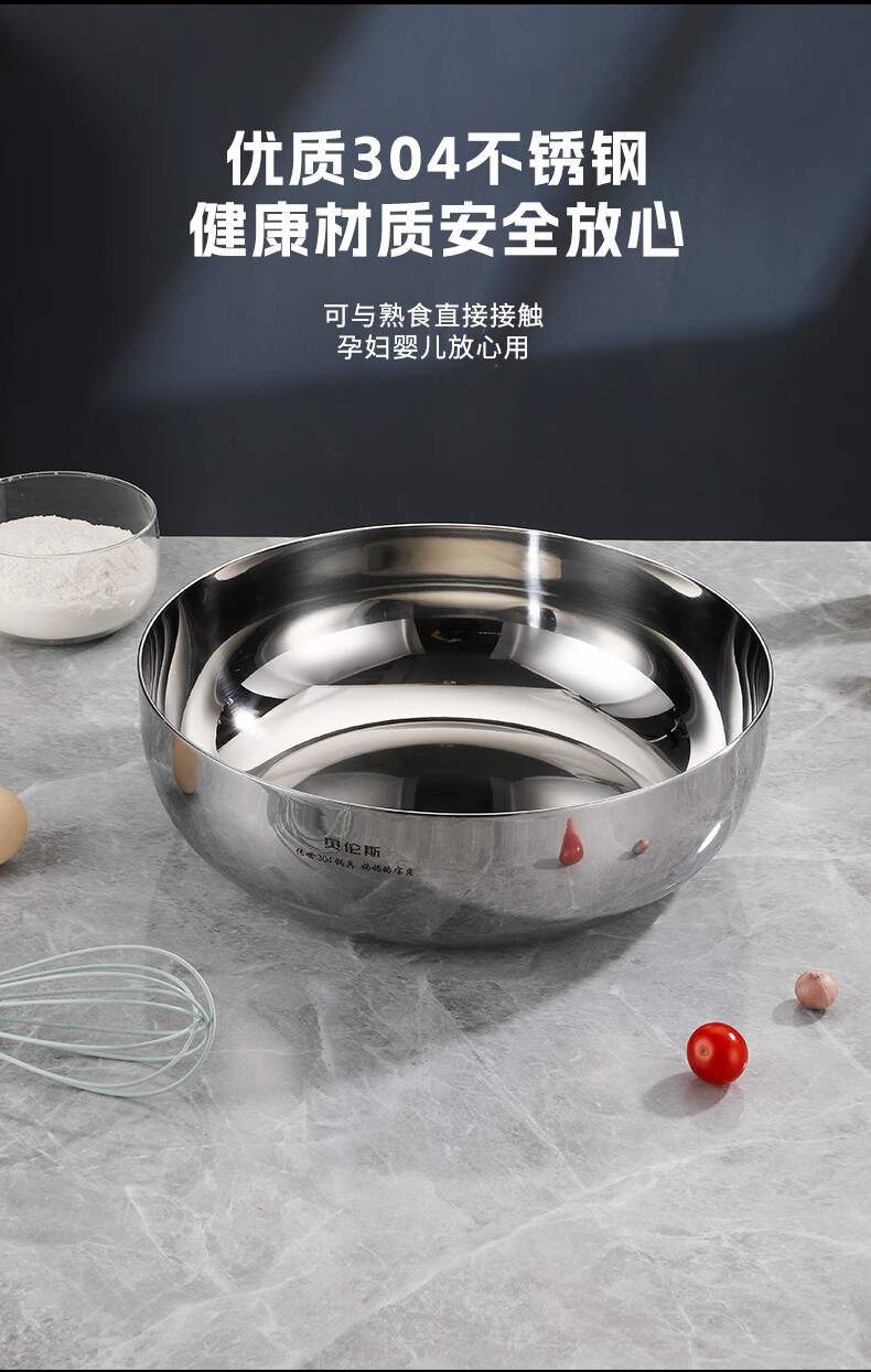 贝伦斯加厚304不锈钢和面盆厨房专用洗菜和面打蛋揉面发面盆 32cm和面盆 1个 带盖