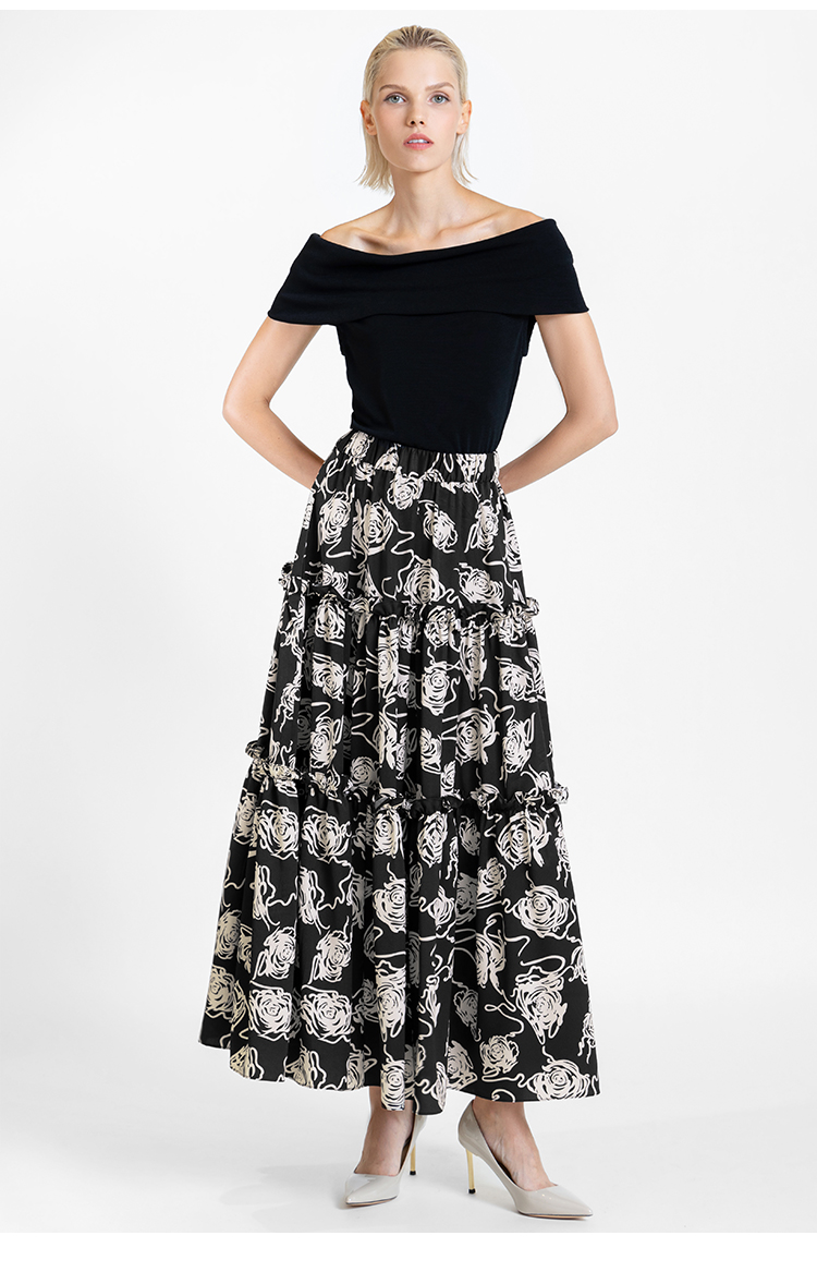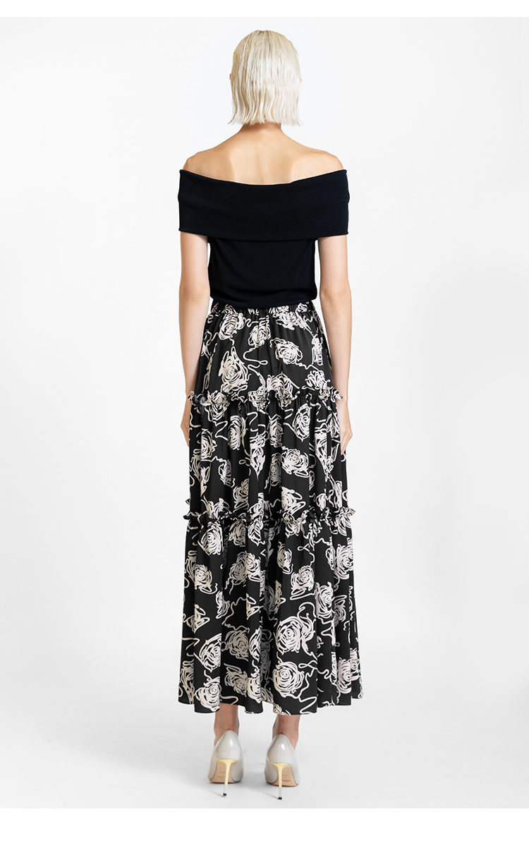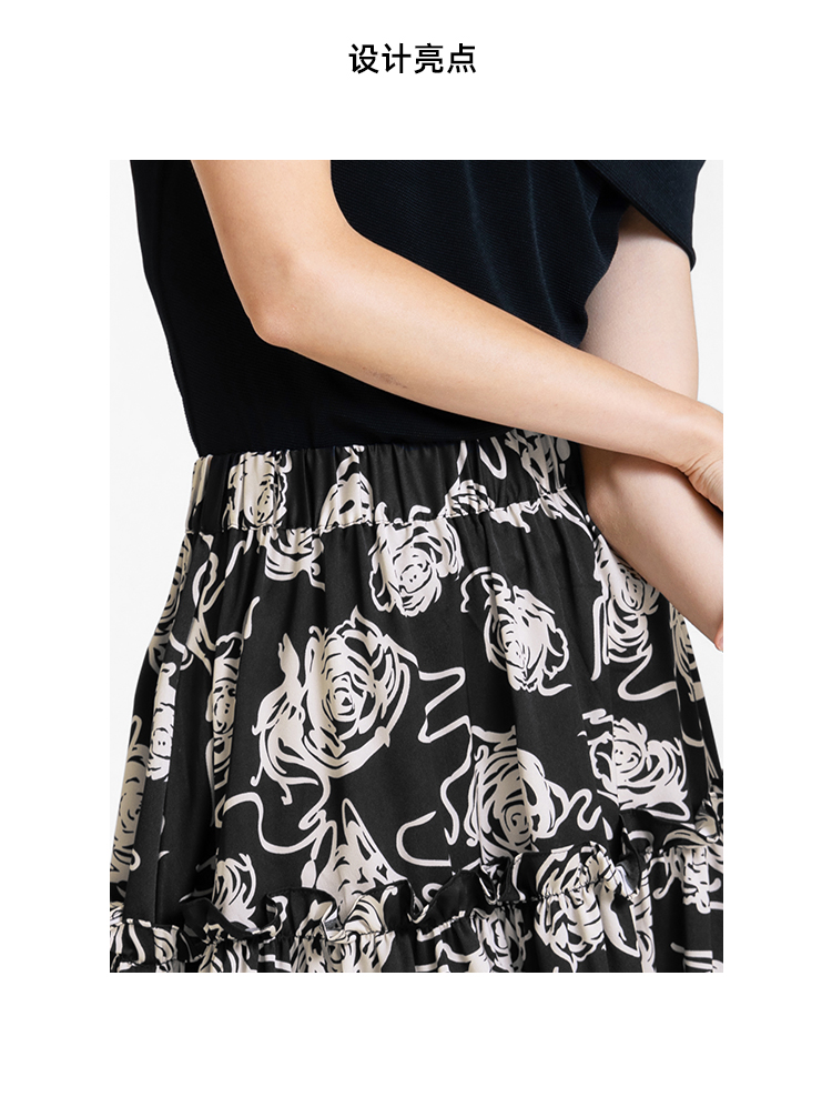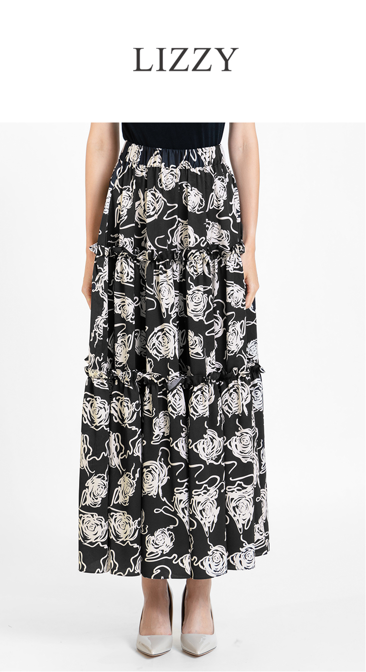 LIZZY 法式优雅玫瑰花海印花高腰中长款大摆a字半身裙7708