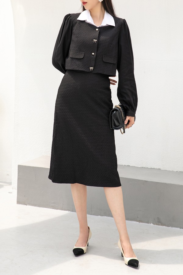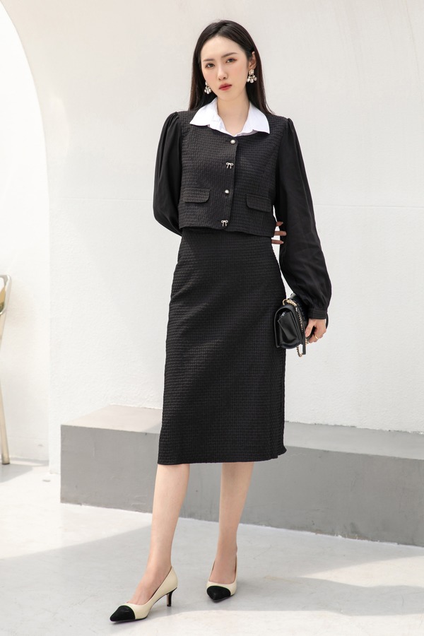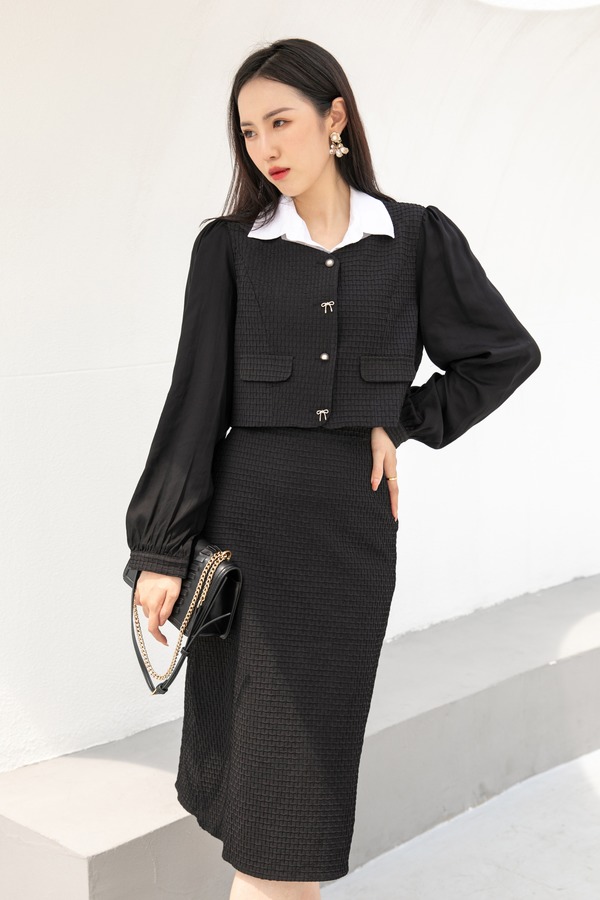 Le Malene 小香风方领拼接短款外套半裙套装 14480