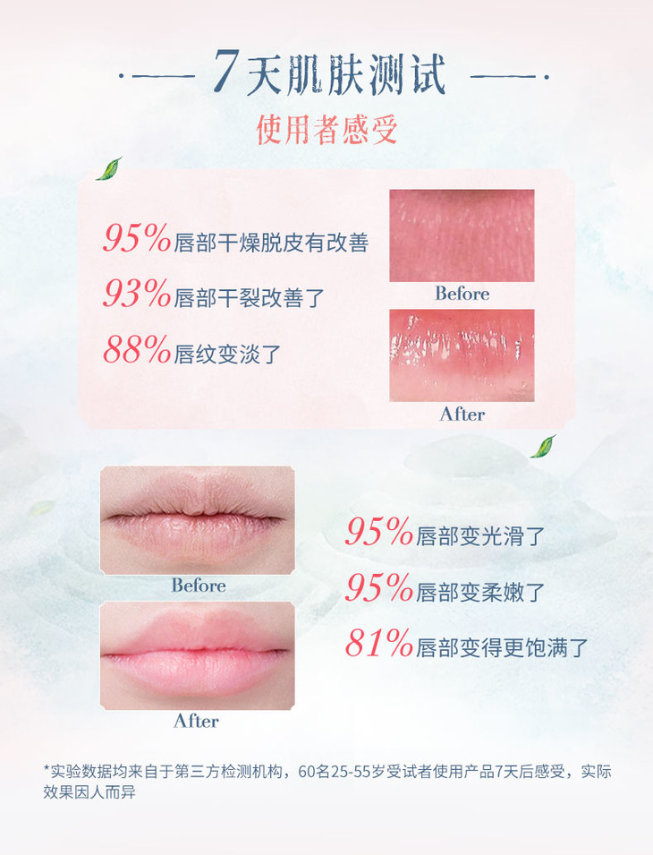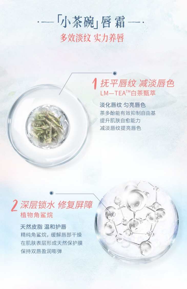 添加白茶、龙井茶以及角鲨烷成分,全力出击,有效改善唇部缺水问题,干燥的嘴皮一整个包裹住了,变得水嫩丰盈~