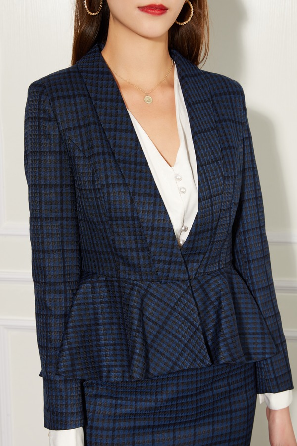 Le Malene 荷叶摆格纹外套包裙套装 11066