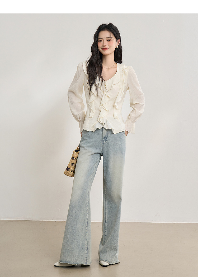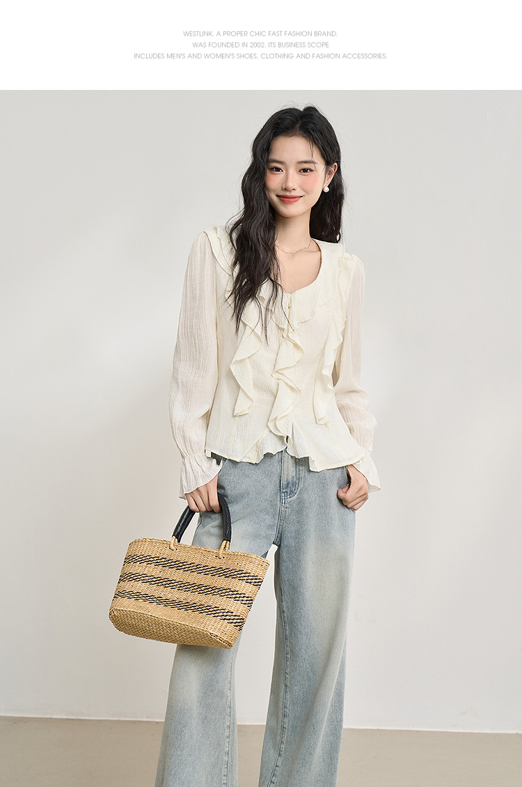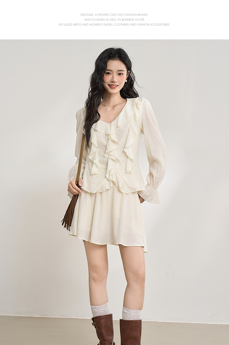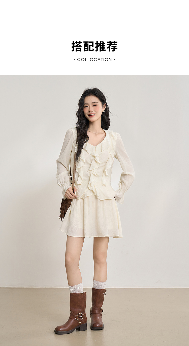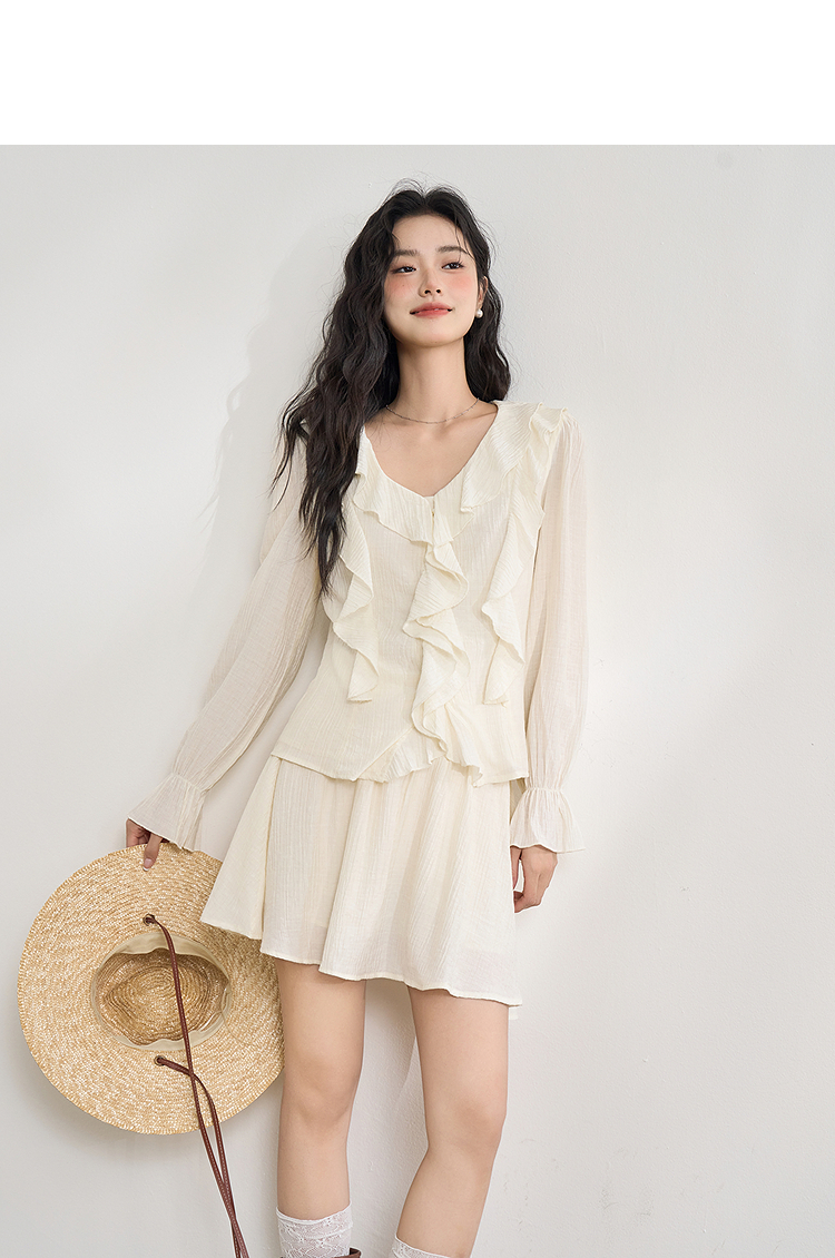 法式甜美肌理感套装女夏季荷叶边V领衬衫搭短裙两件套V0650263