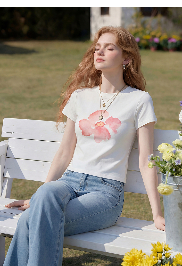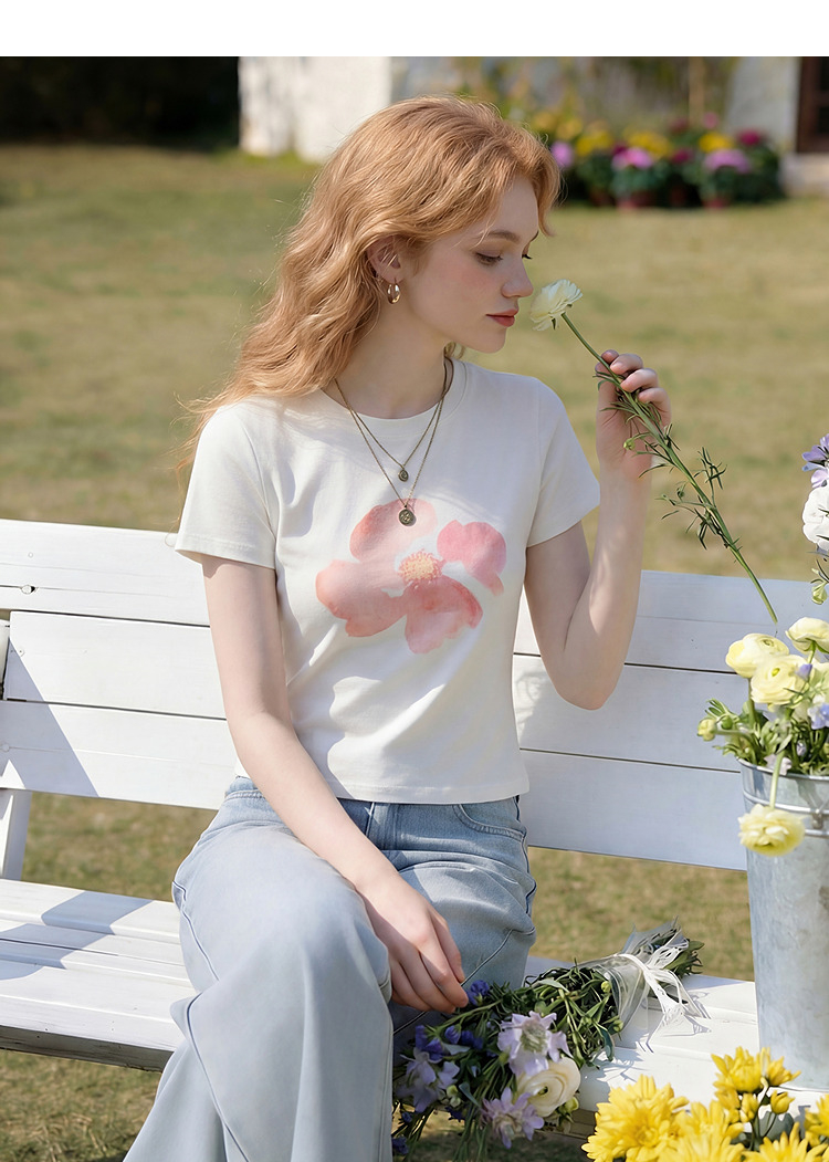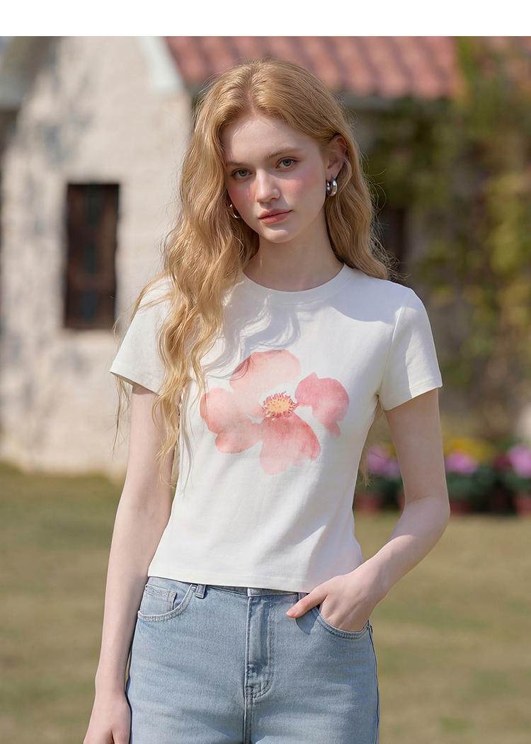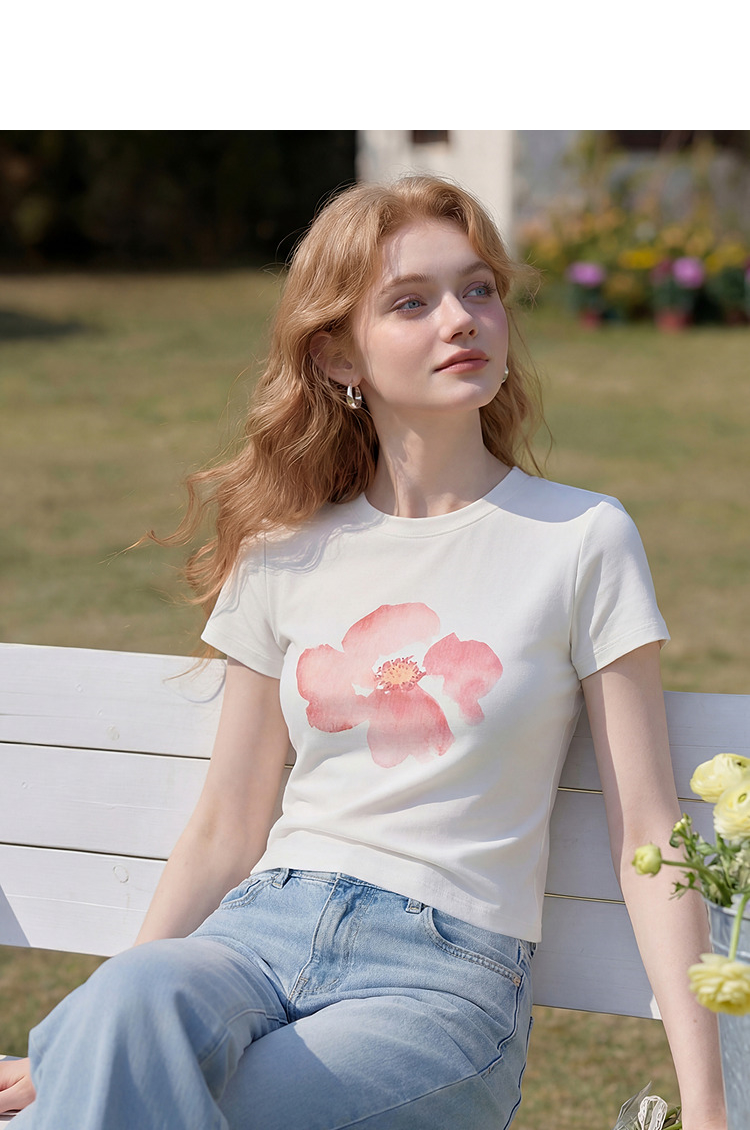西遇2026夏新款水彩花卉印花短袖T恤女宽松休闲百搭显瘦白色上衣E0060273