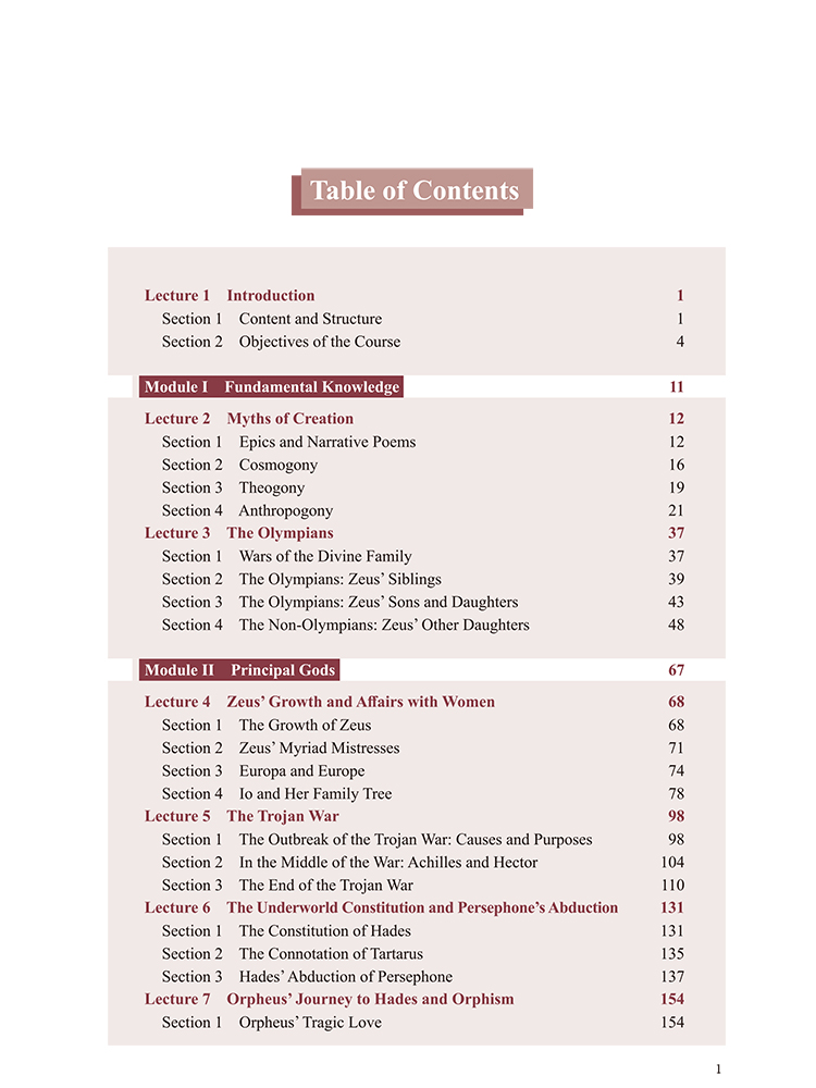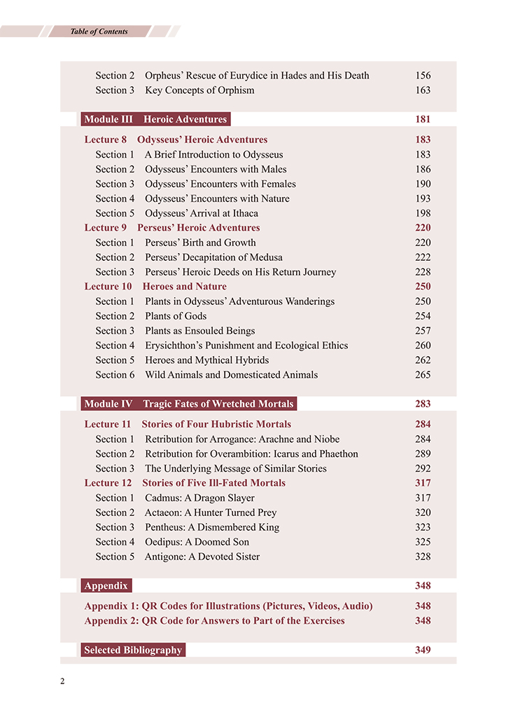 本教材共分为4个模块:第一模块是基础知识部分,围绕创世神话和神祗谱系展开,重点突出奥林匹斯诸神;第二模块是主神故事,主要围绕与天神宙斯和冥神哈德斯相关的神话故事展开;第三模块是英雄故事,主要围绕奥德修斯与帕尔修斯的故事展开,其间也涉及另一位主神波塞冬;第四模块是凡人故事,主要涉及来自王室与平民阶层的凡人的故事。四个模块由12章构成,除第1章之外,其余11章皆由导语、故事讲述与解析、文化影响、关键名称、课后习题五部分构成。本教材除了通过内容依托学习,帮助学生掌握英语技能和了解古希腊罗马文化,更突出了文明互鉴的导向,融入了中西方文化比较的内容,力求让学生在互鉴性学习中增强文化自信。