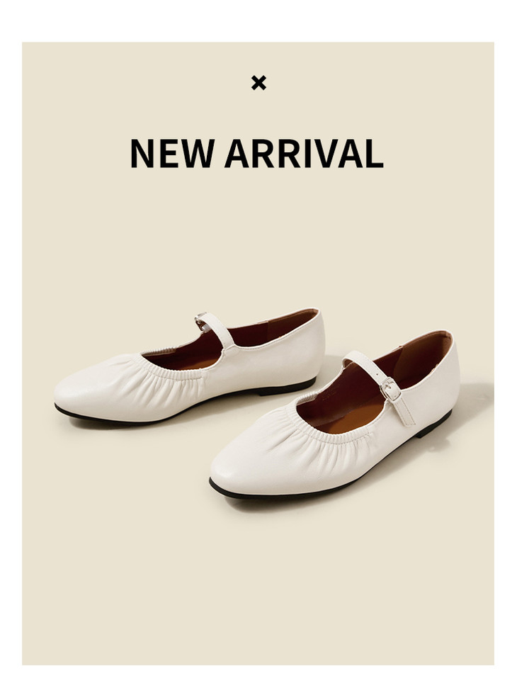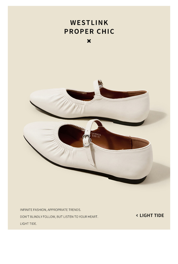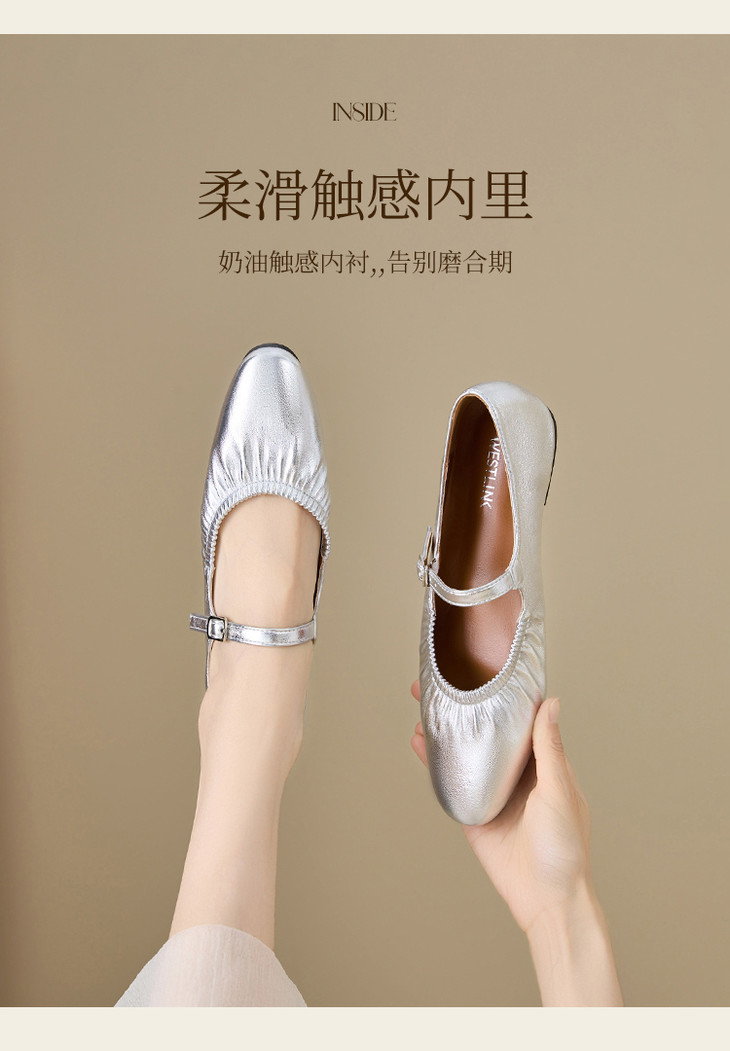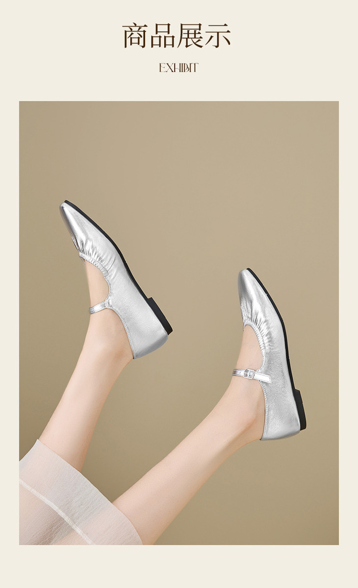 西遇法式单鞋女新款秋季褶皱圆头浅口软底平底鞋银色玛丽珍鞋V1456902