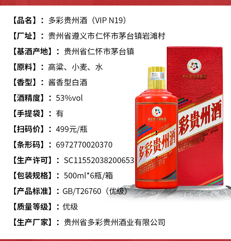 多彩贵州酒VIP N19 53度酱香型白酒 整箱6瓶*500ml包邮