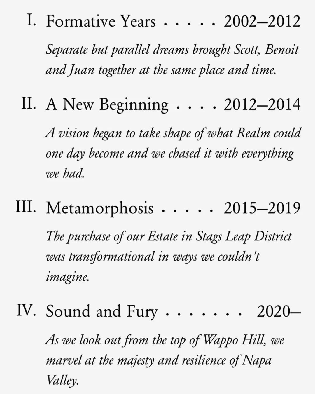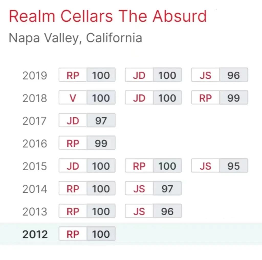 这酒,有的叫它睿梦(Realm),有的叫秘境。这是纳帕谷膜拜新贵,能跟哈兰(Harlan)、寇金(Colgin)、施睿徳(Schrader)一较高下。成立21年,拿下12个帕克满分!