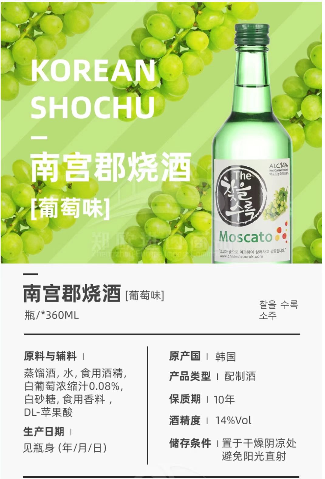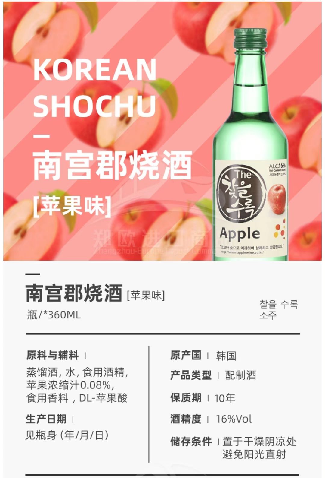 【中欧班列直供】韩国果酒烧酒 原装进口南宫郡配制酒-草莓味/ 橙子味 /苹果味 /桃子味/咖啡味 /葡萄味14%Vol 360ml/瓶