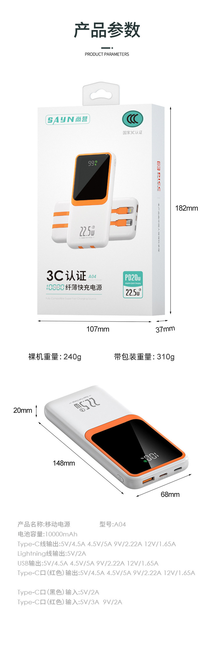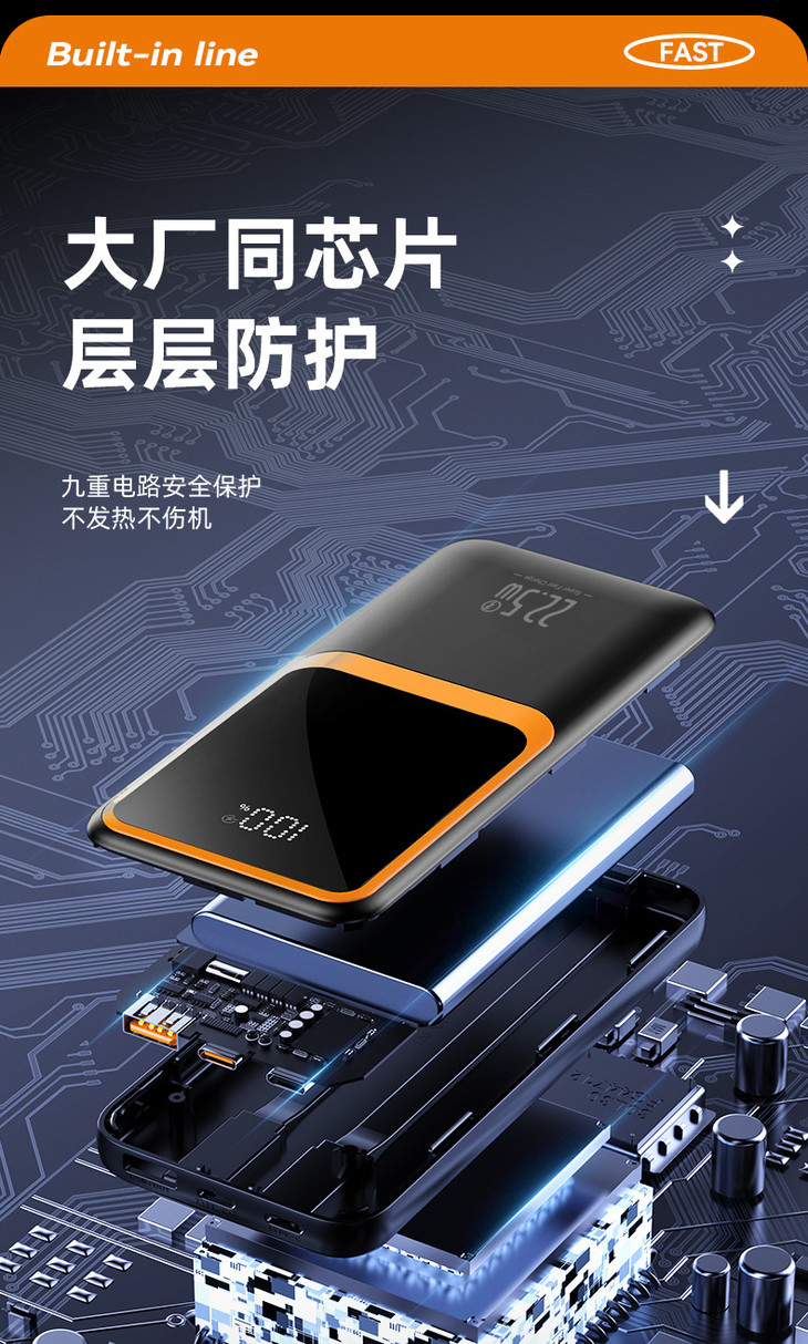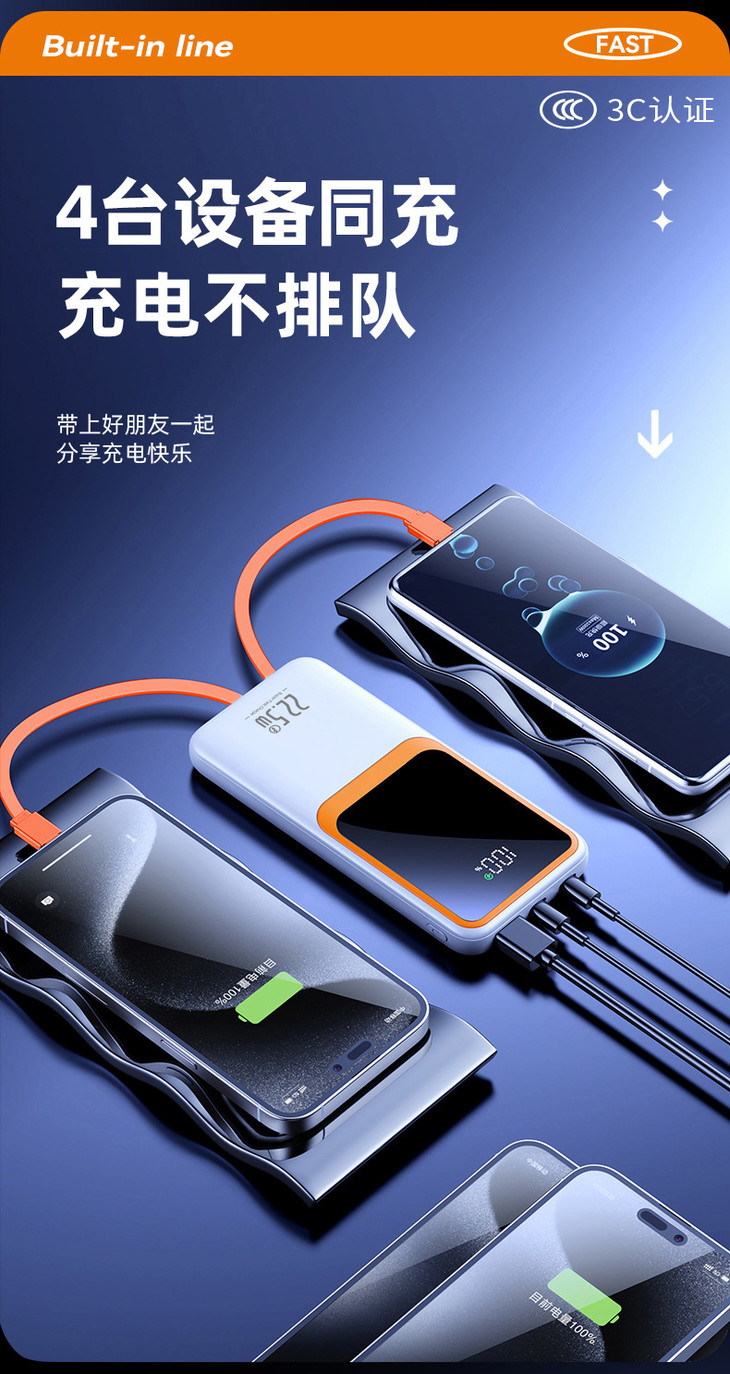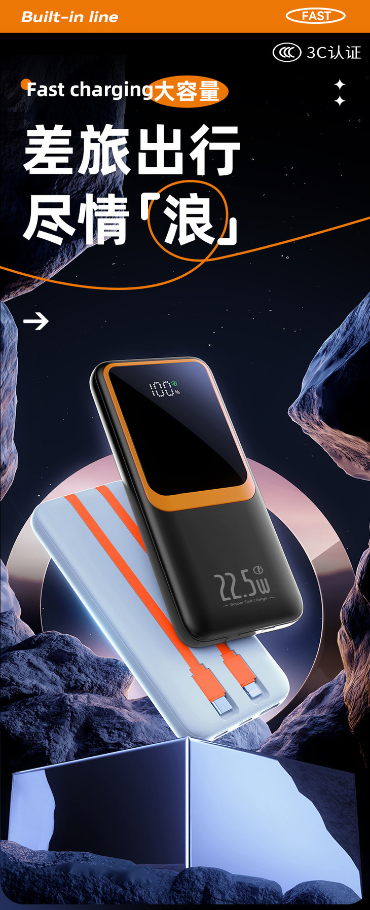 「1万毫安!3C认证」10000毫安快充移动电源22.5w自带线数显充电宝数码配件