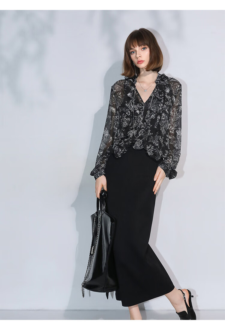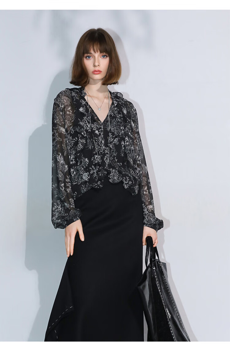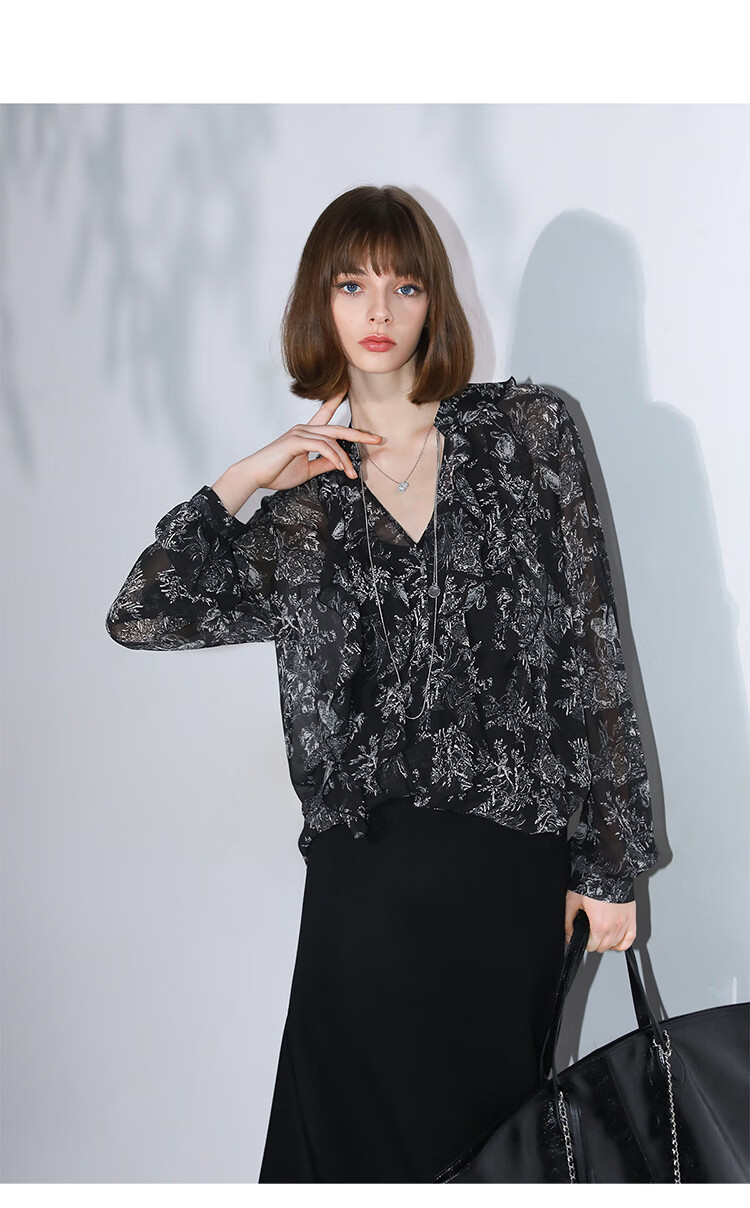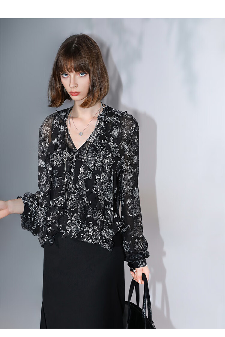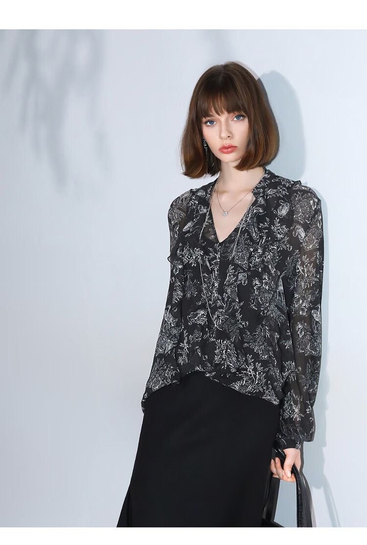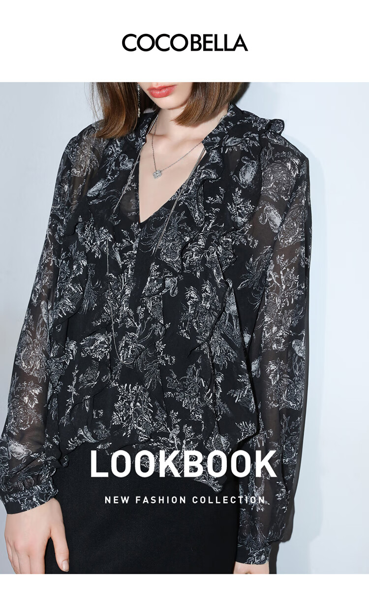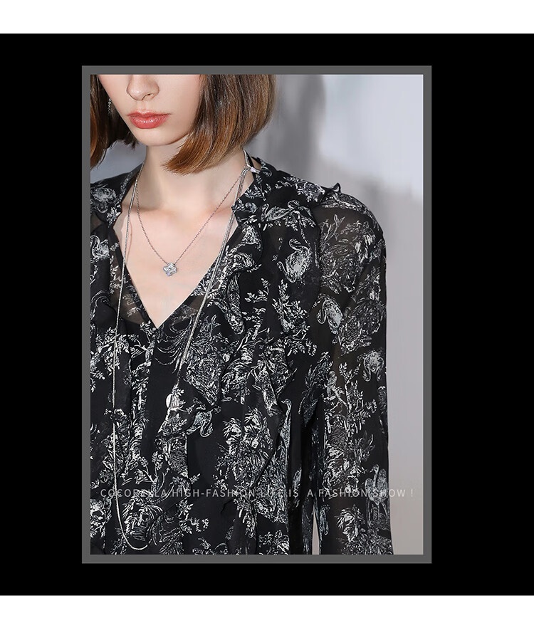 COCOBELLA立体荷叶领印花气质衬衫女秋V领内搭雪纺衫SR3039B