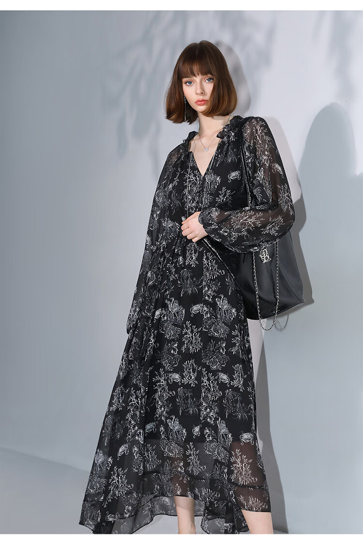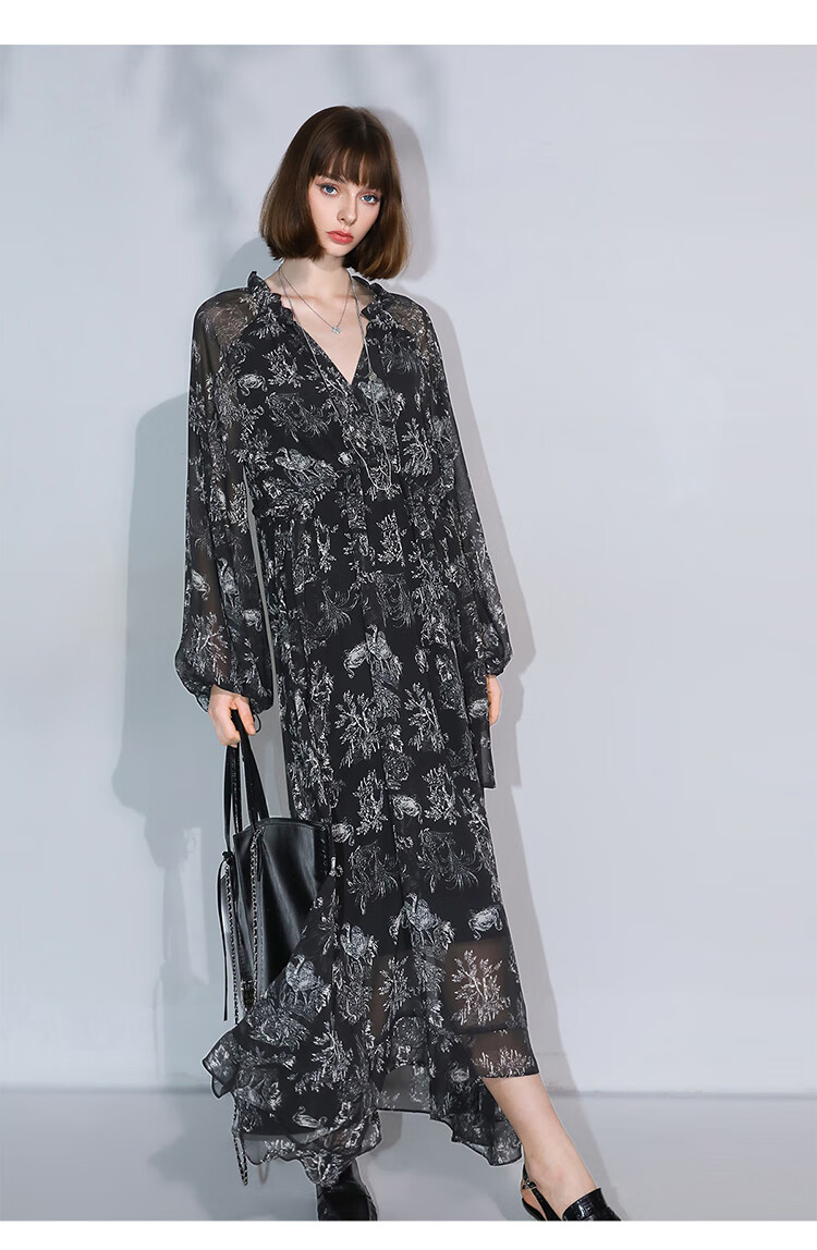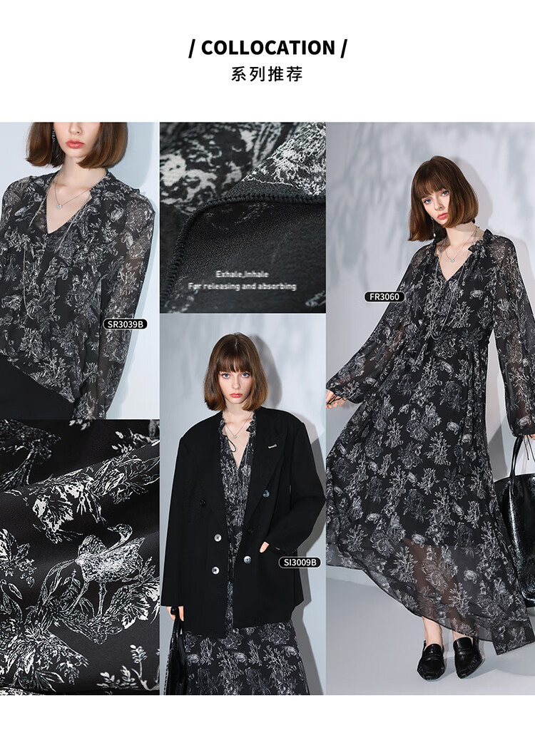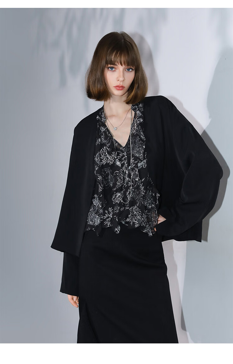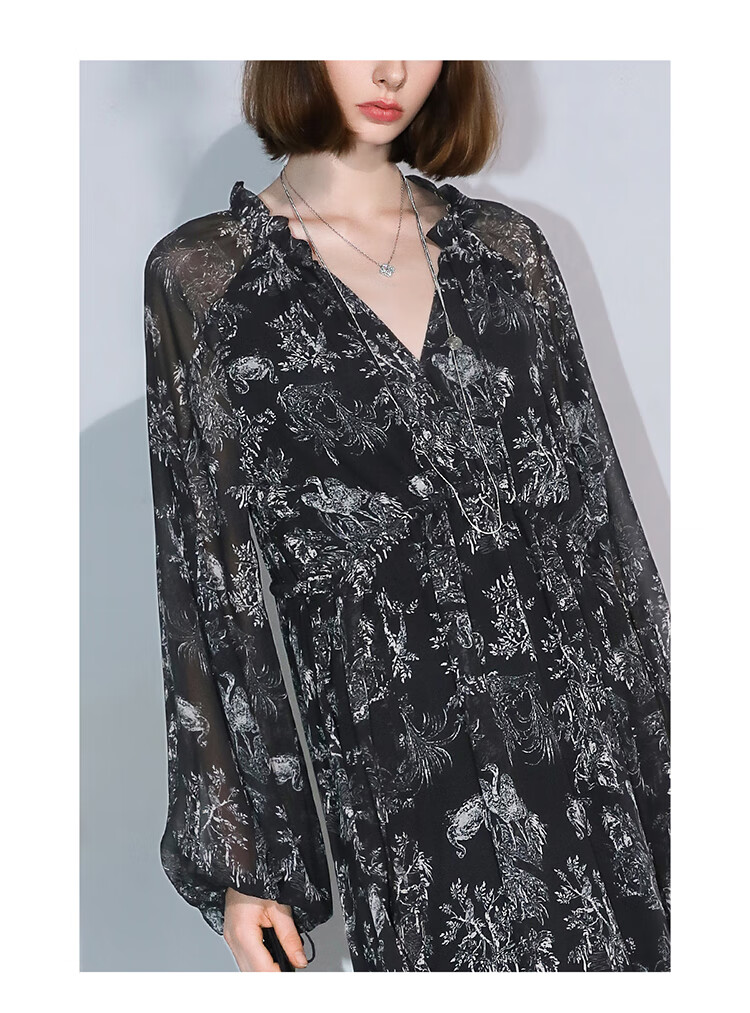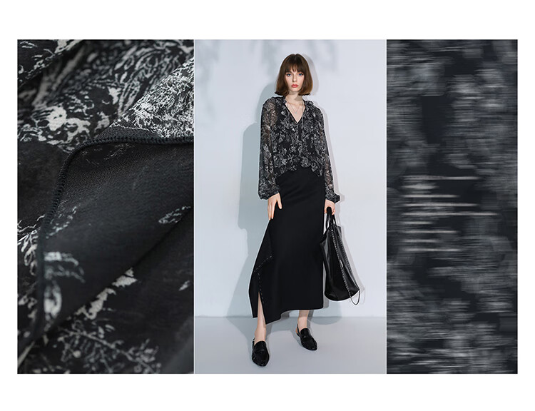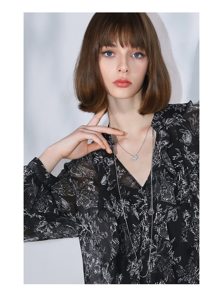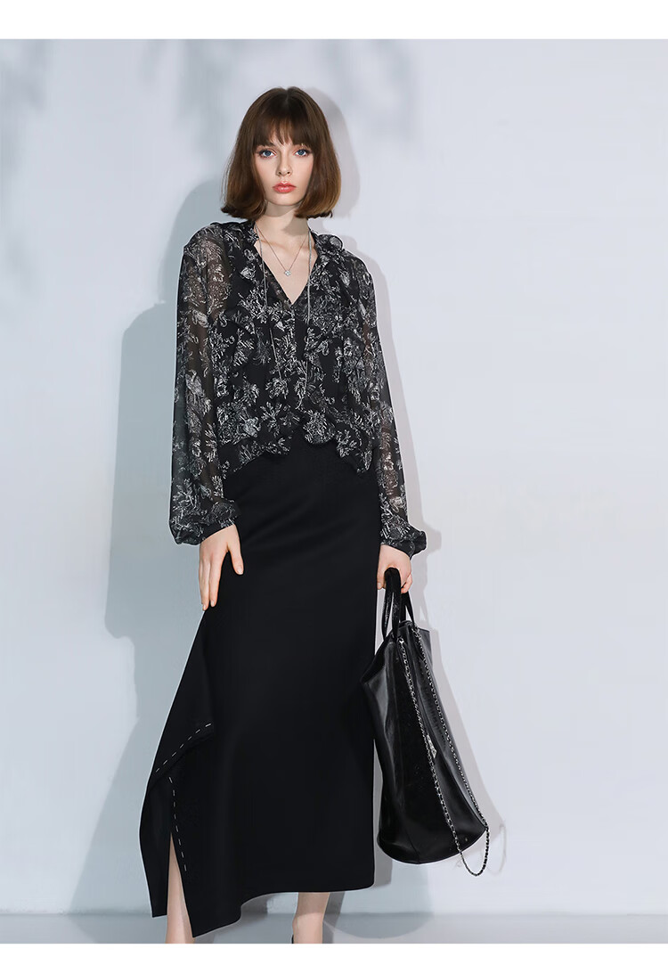 COCOBELLA立体荷叶领印花气质衬衫女秋V领内搭雪纺衫SR3039B