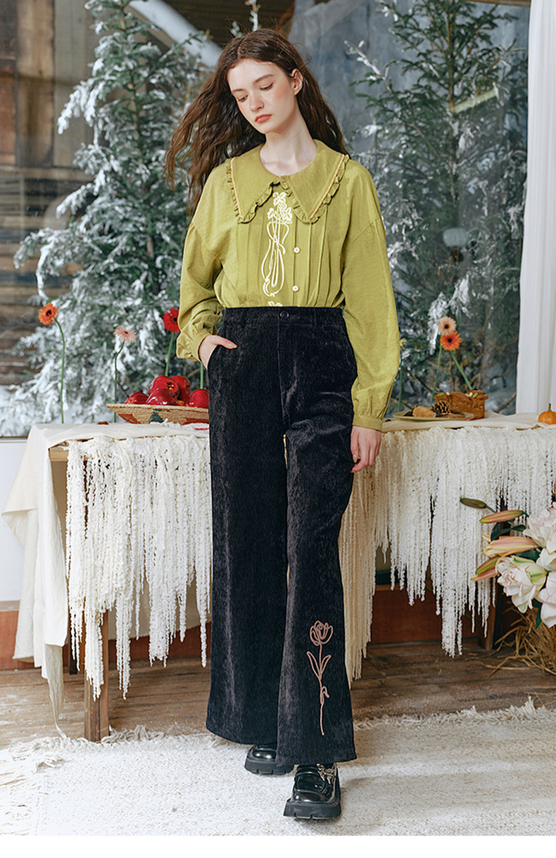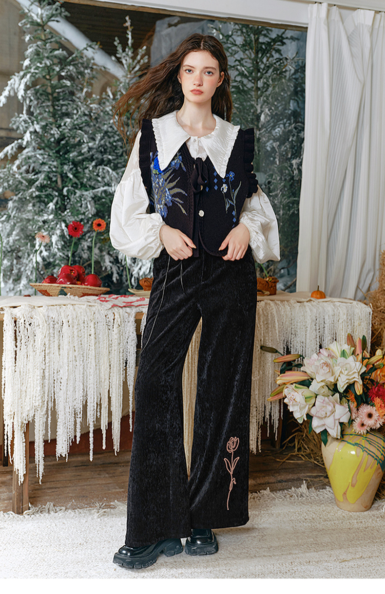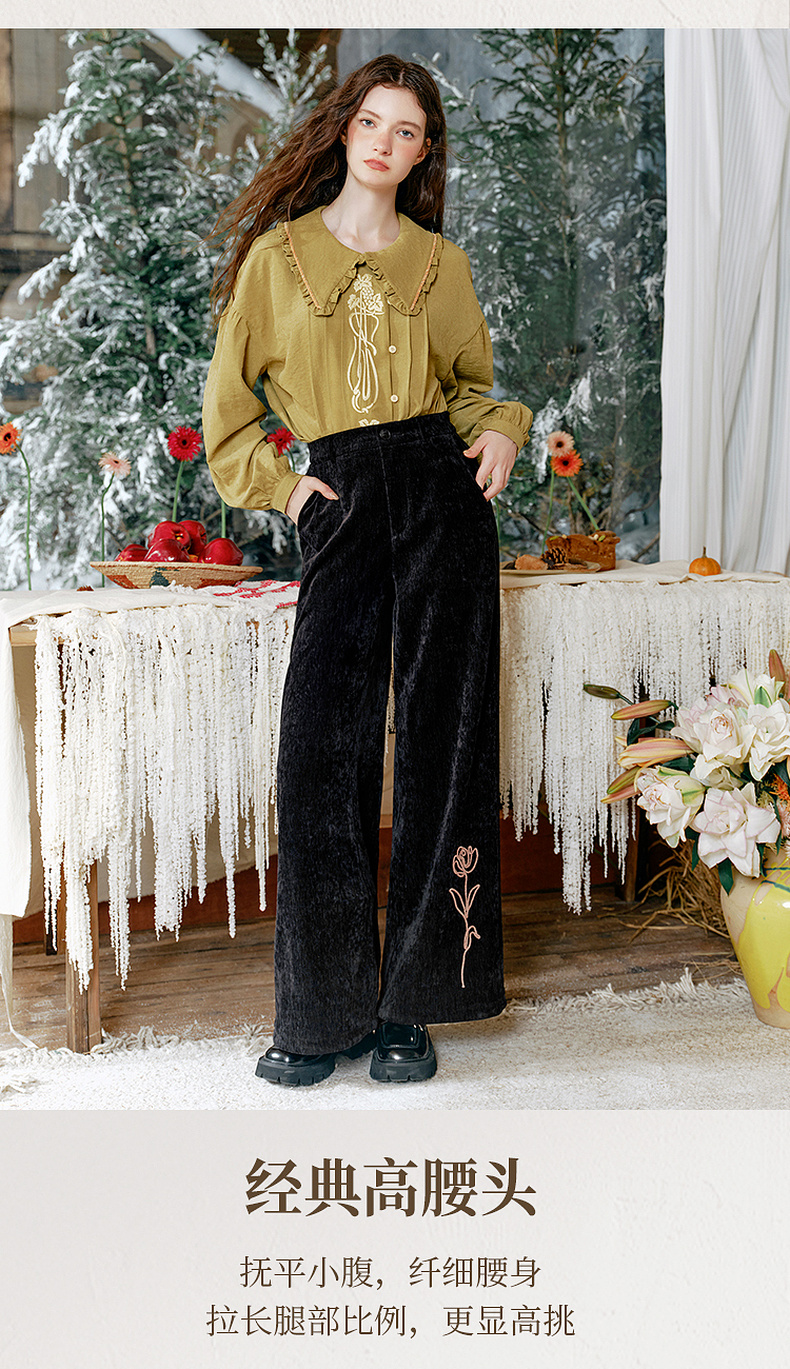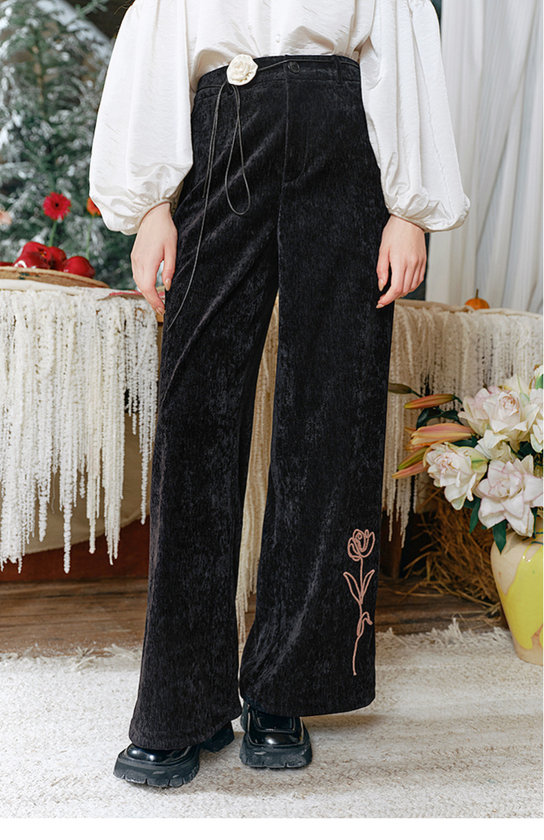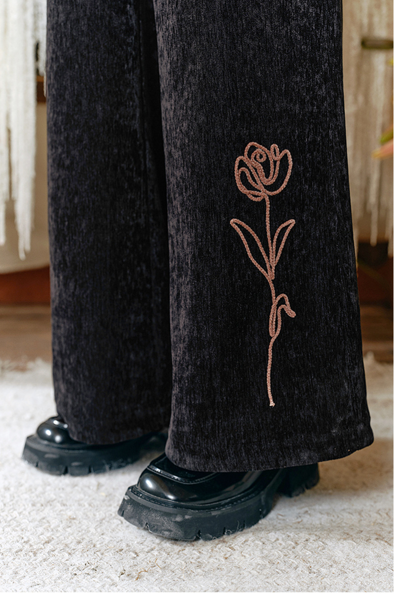 两三事流光秀色2024冬季新款复古玫瑰绣花喇叭休闲裤女配花朵腰绳