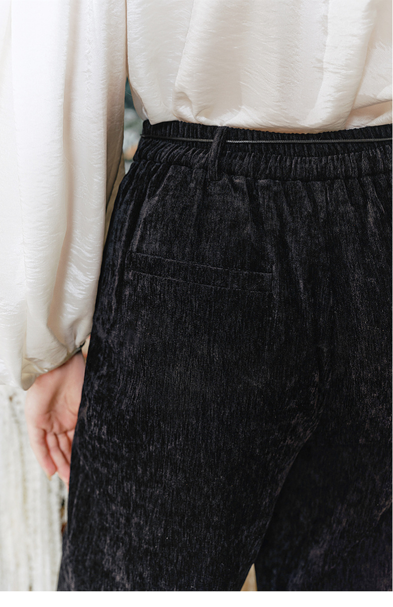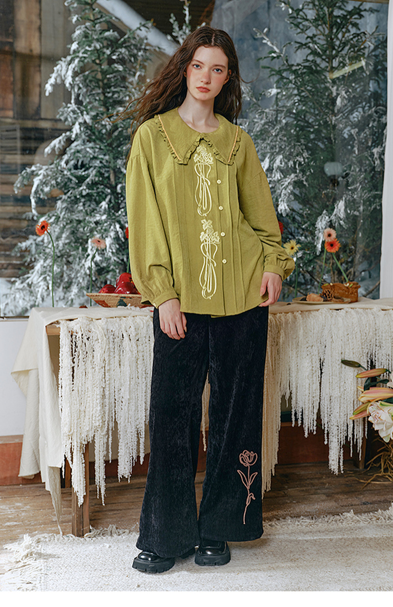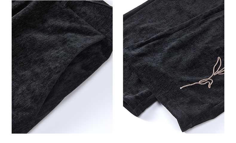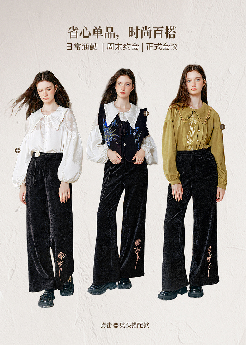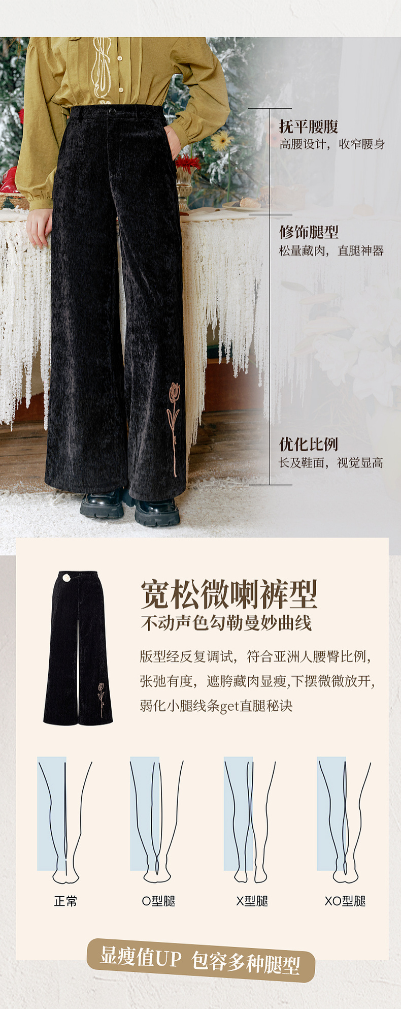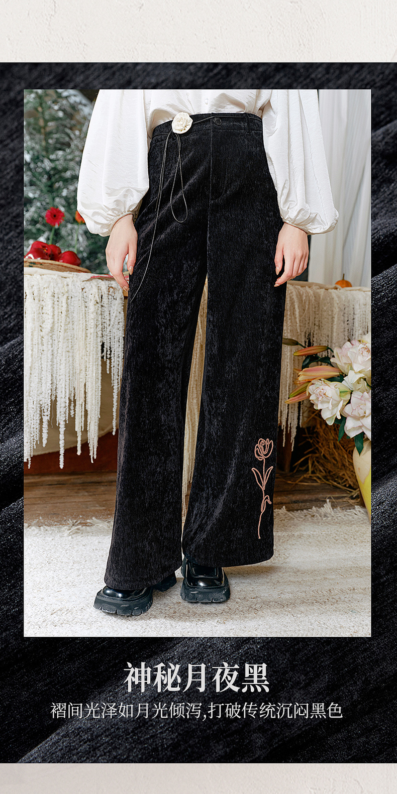 两三事流光秀色2024冬季新款复古玫瑰绣花喇叭休闲裤女配花朵腰绳