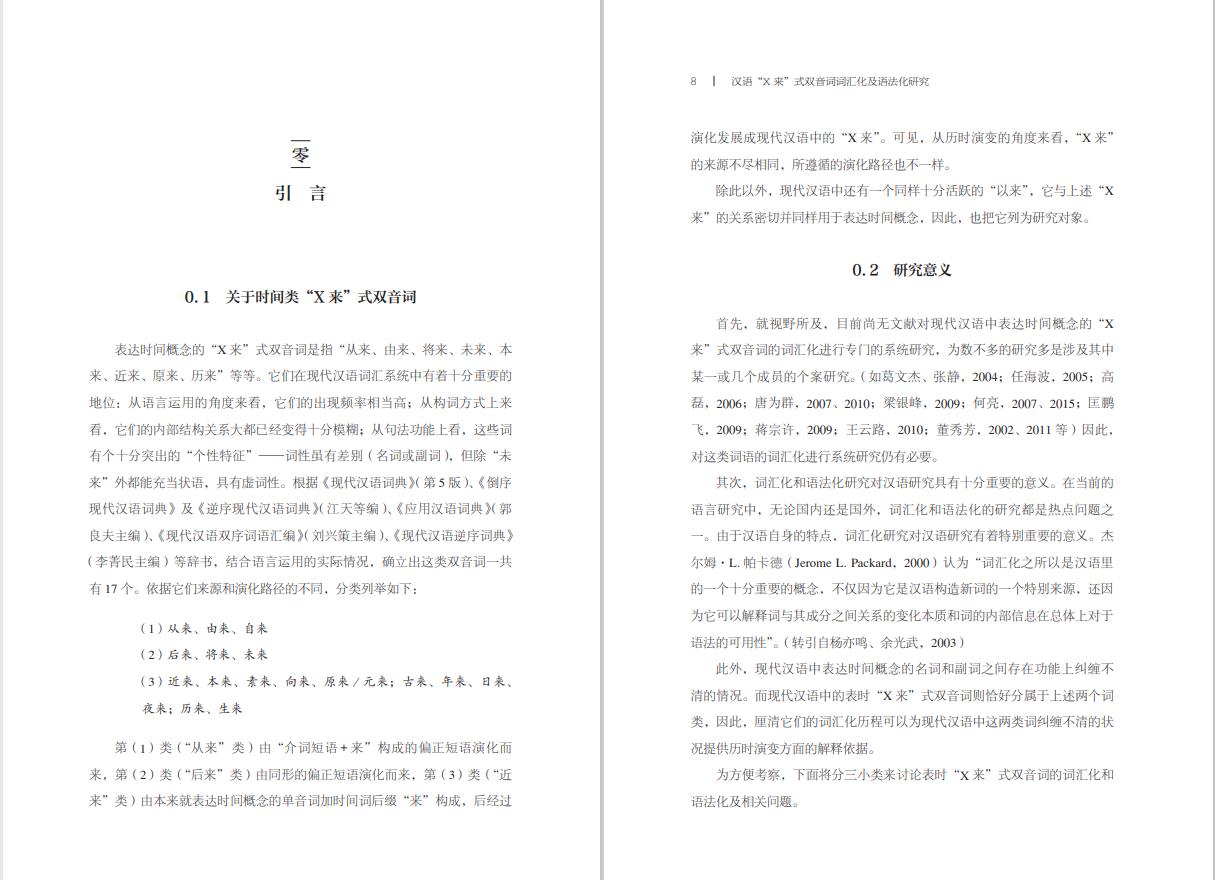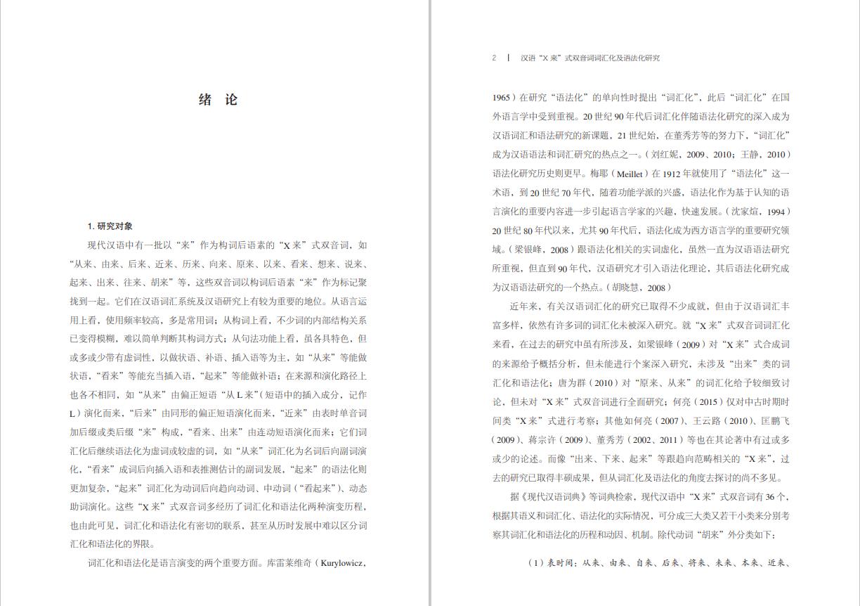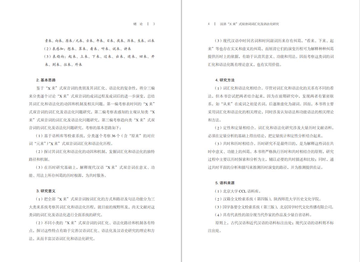 第一编“时间类‘X来’式双音词的词汇化及语法化问题研究”,主要考察表示时间的“X来”式双音词的形成发展演变历程以及演变的机制和动因;第二编“主观认知类‘X来’式双音词的词汇化及语法化问题研究”,主要考察表示主观认知的“X来”式双音词的形成发展演变历程以及演变的动因和机制;第三编“趋向类‘X来’式双音词的词汇化及语法化问题研究”,主要考察表示趋向的“X来”式双音词的词汇化和语法化问题。附录“关于代动词‘来’及其构成的‘X来’式双音词”主要讨论代动词“来”的发展和使用规律,兼及“胡来、乱来”等双音词的形成。