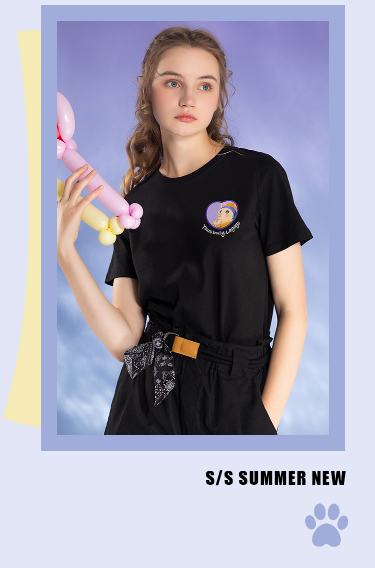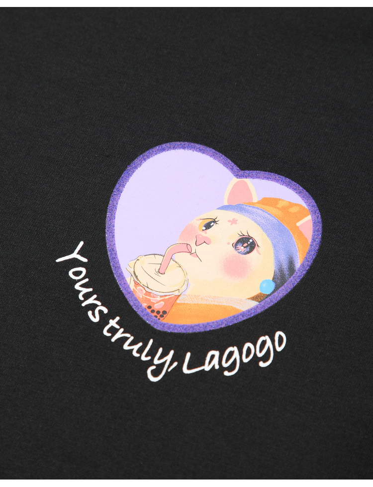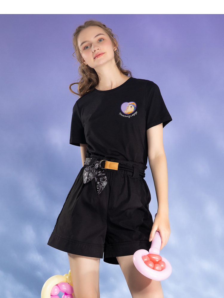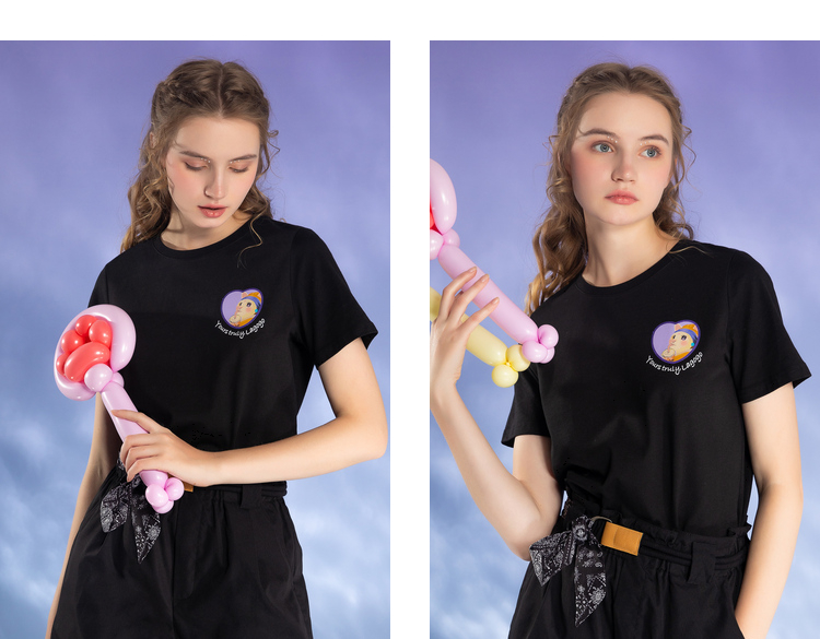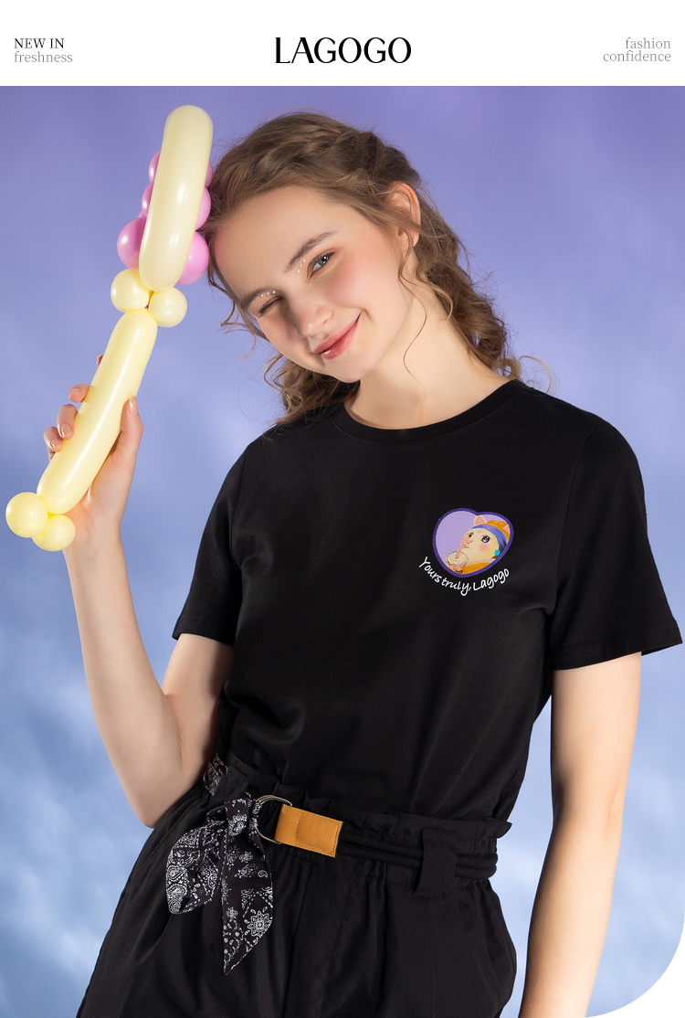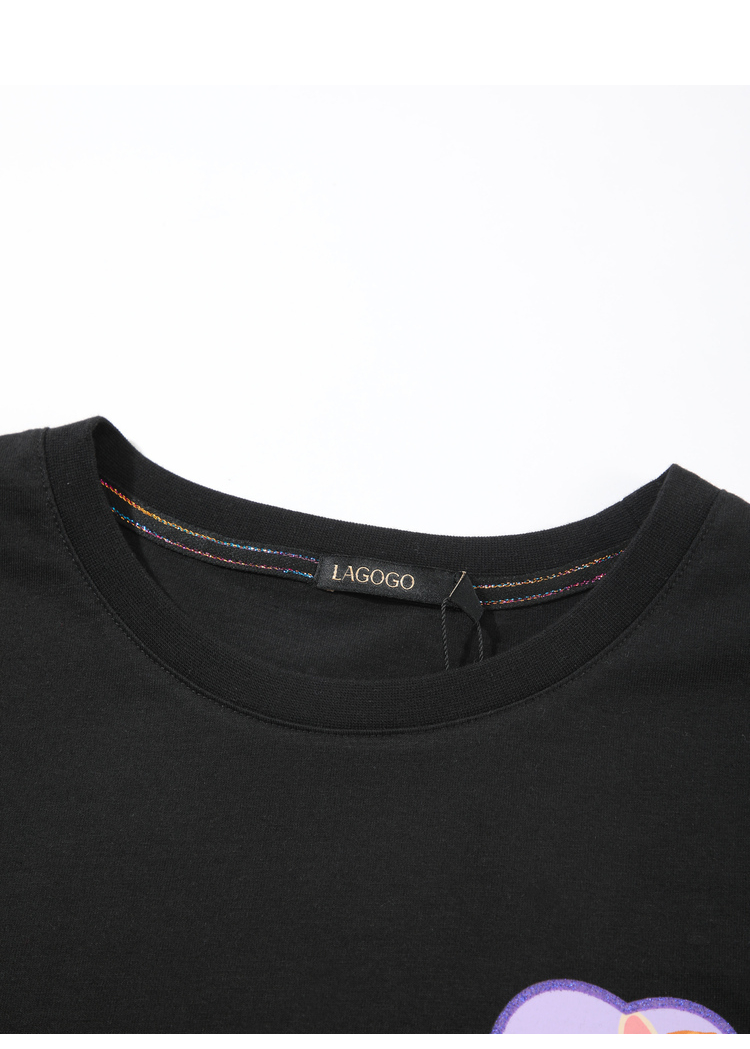 Lagogo拉谷谷2022夏季新款卡通印花圆领黑色T恤LATT313A09