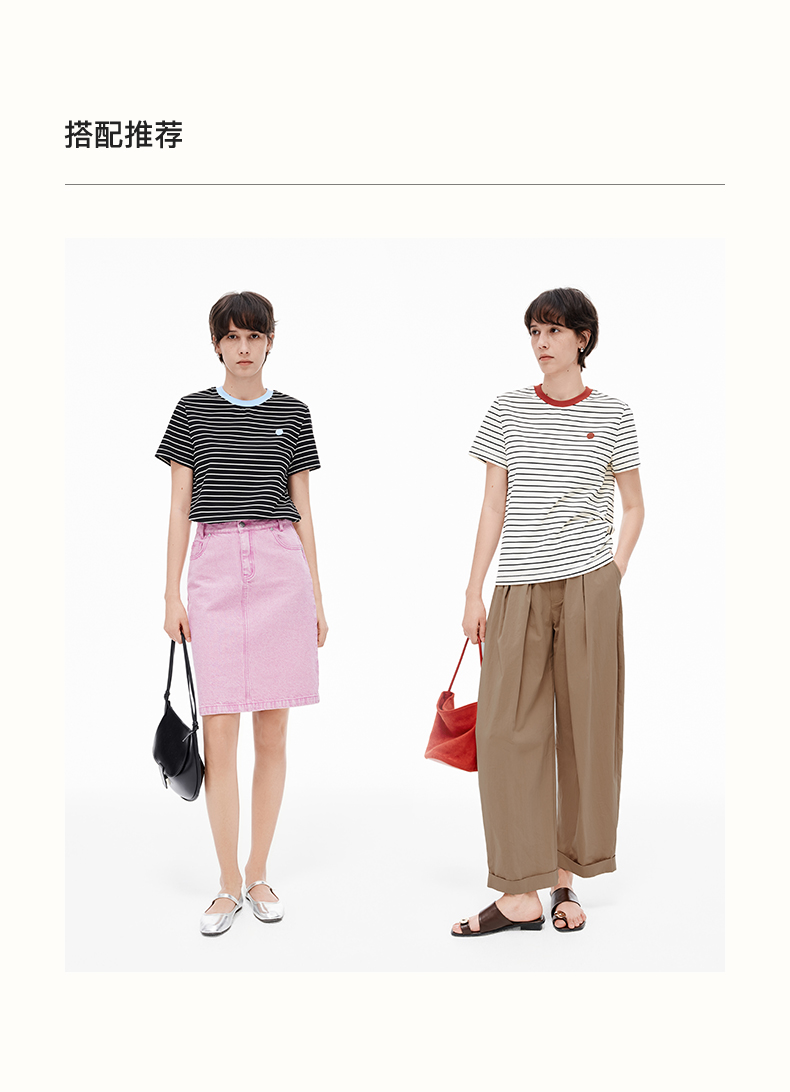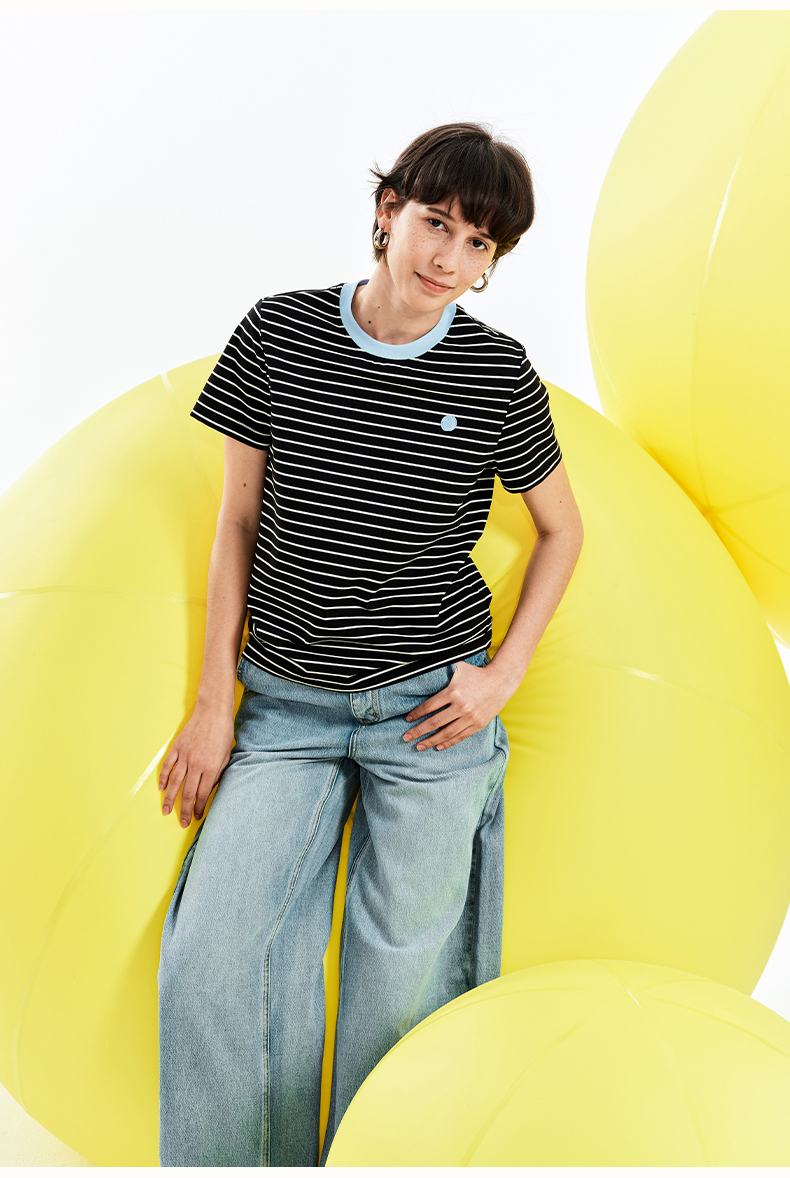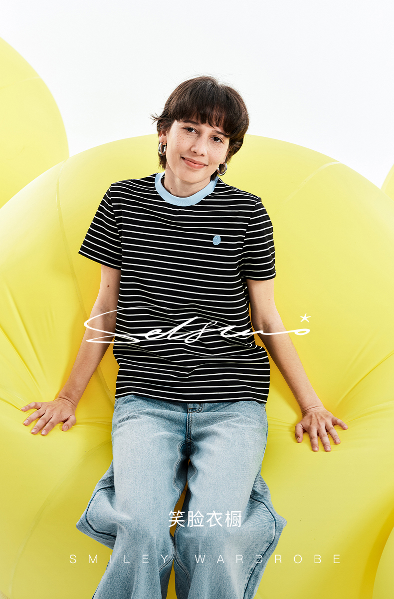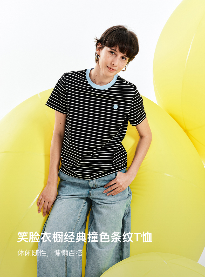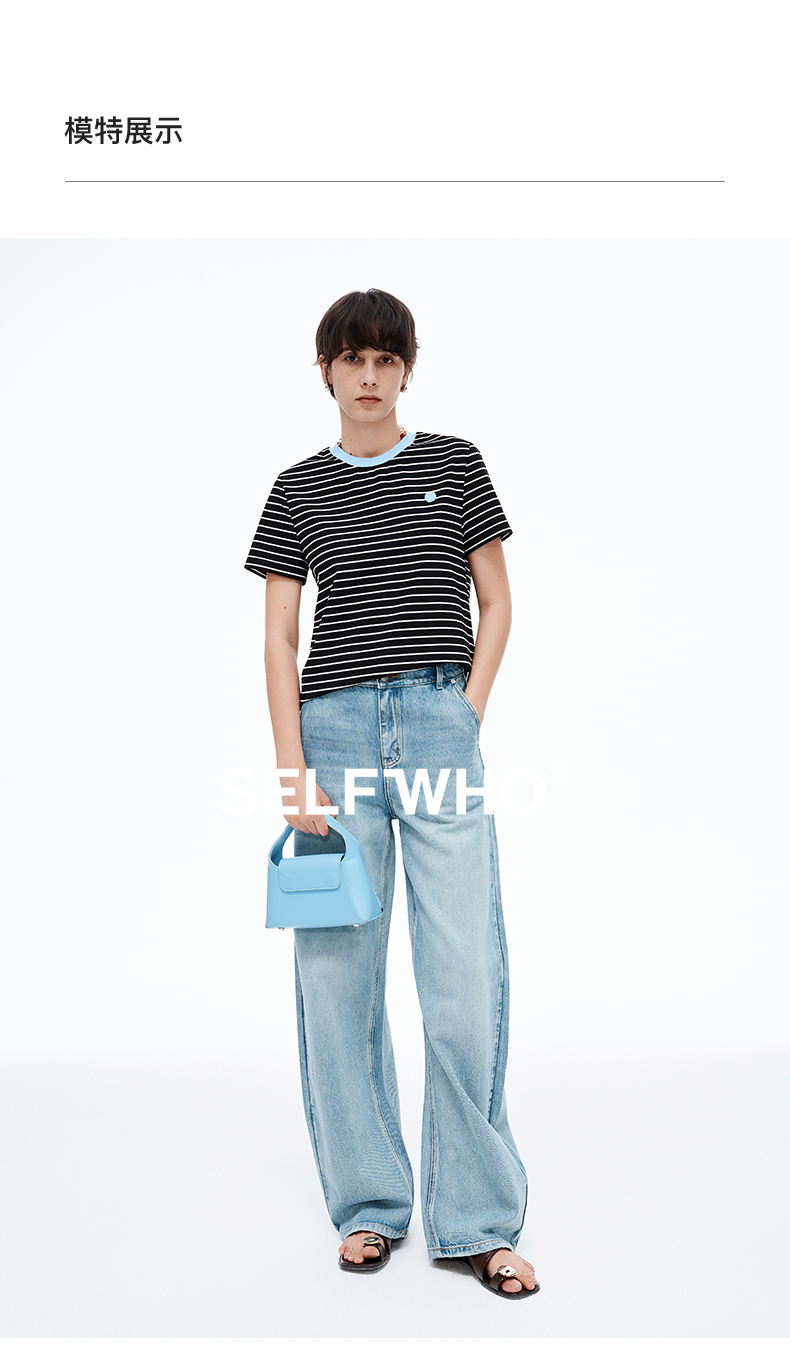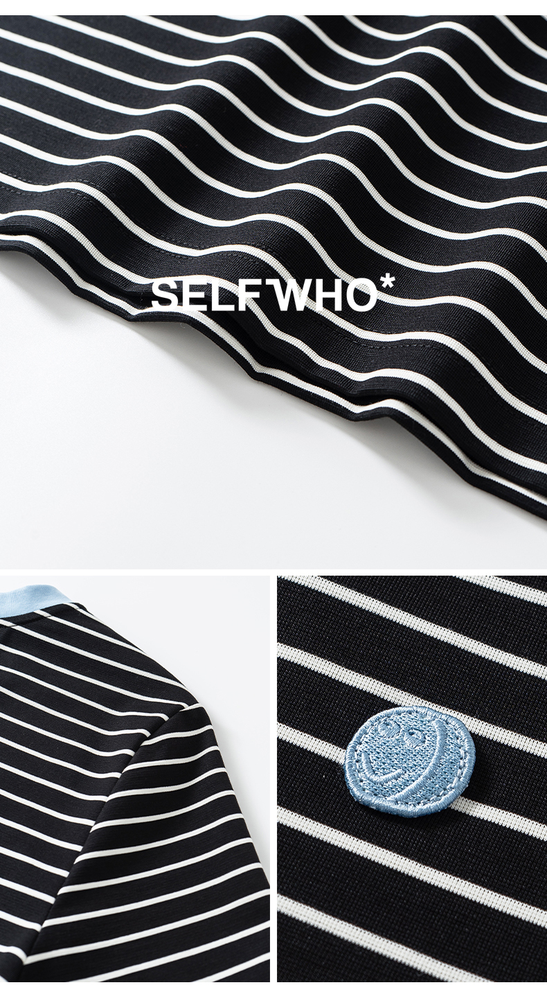 【笑脸衣橱】SELFWHO笑脸衣橱条纹短袖t恤女2025夏新款小个子宽松圆领正肩上衣