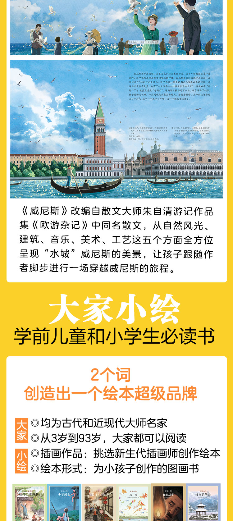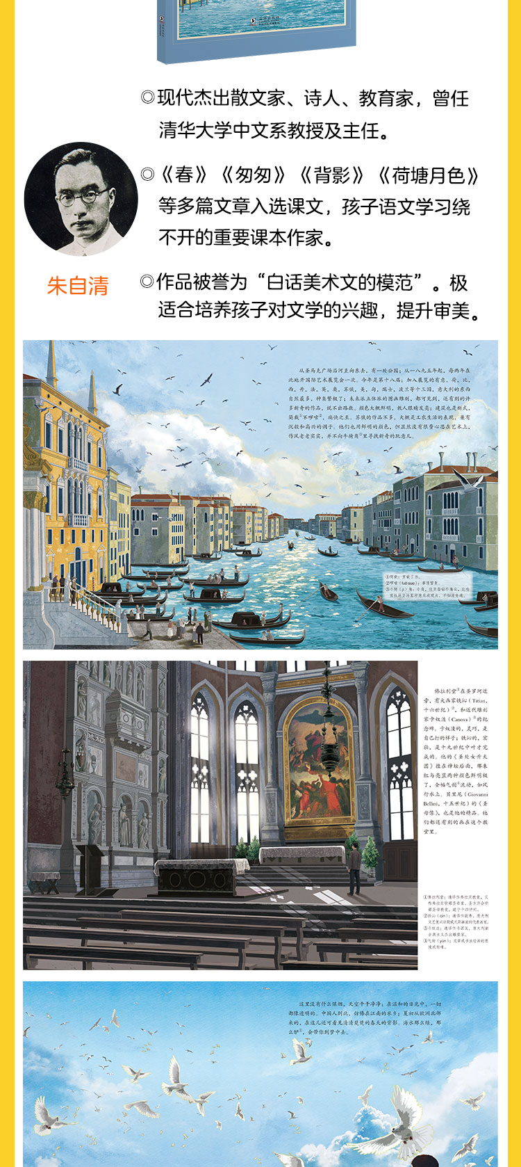 《威尼斯》记录了散文家朱自清一路探访圣马可广场、威尼斯总督府、叹息桥等历史建筑、欣赏举世瞩目的油画、雕塑作品的见闻和感受。绘本将朱自清先生通俗易懂又富有趣味的文本与艺术绘画设计完美结合,绘声绘色展现水城威尼斯的悠久历史文化和璀璨艺术。