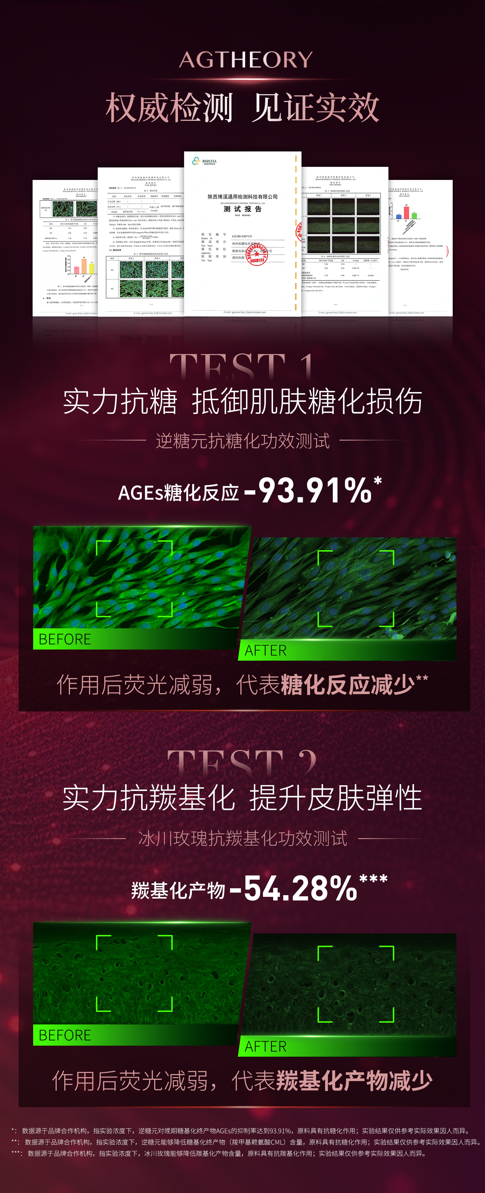 1. 细胞级抗糖化:独家成分【逆糖元】高效抑制糖化反应 AGEs糖化反应 -93.91%