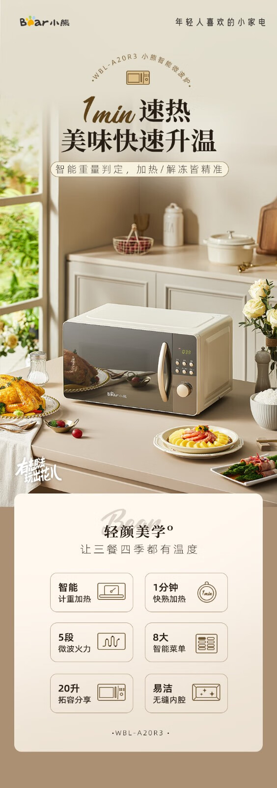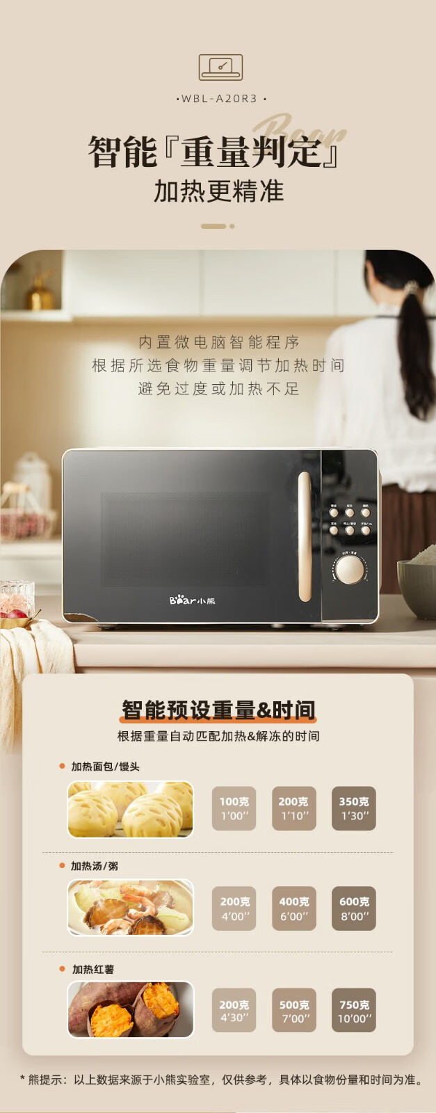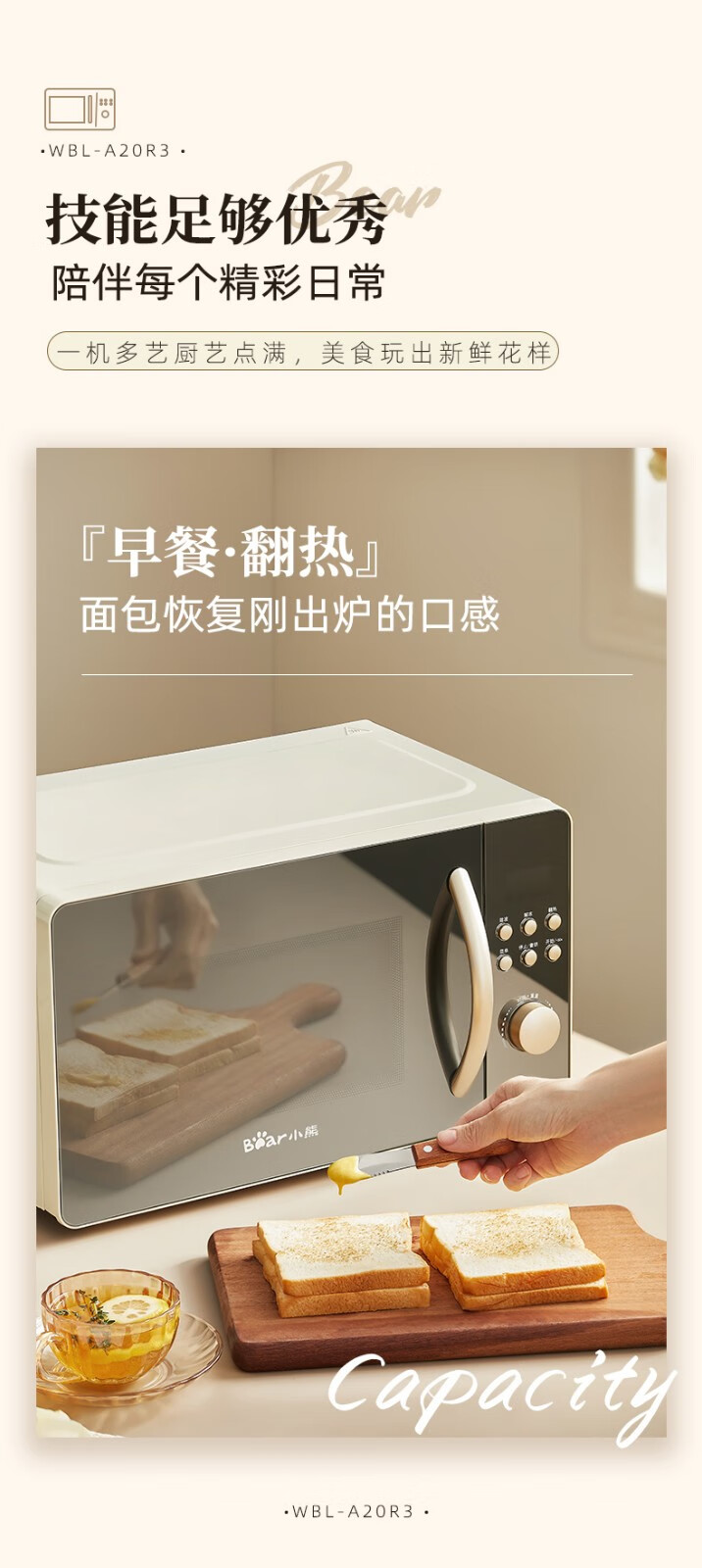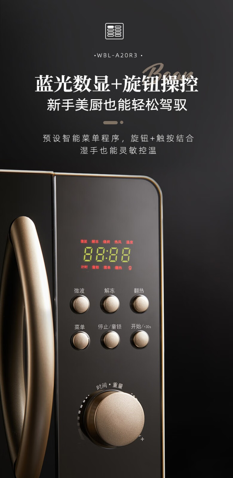 小熊(Bear) 微波炉 家用快捷 360°转盘加热20L五档火力 WBL-A20R3 20L容量+旋扭操控+快速加热