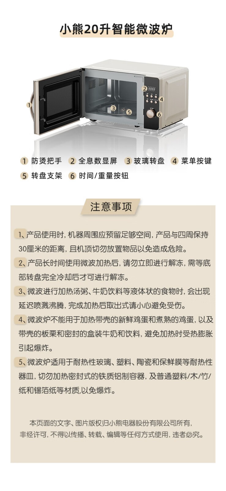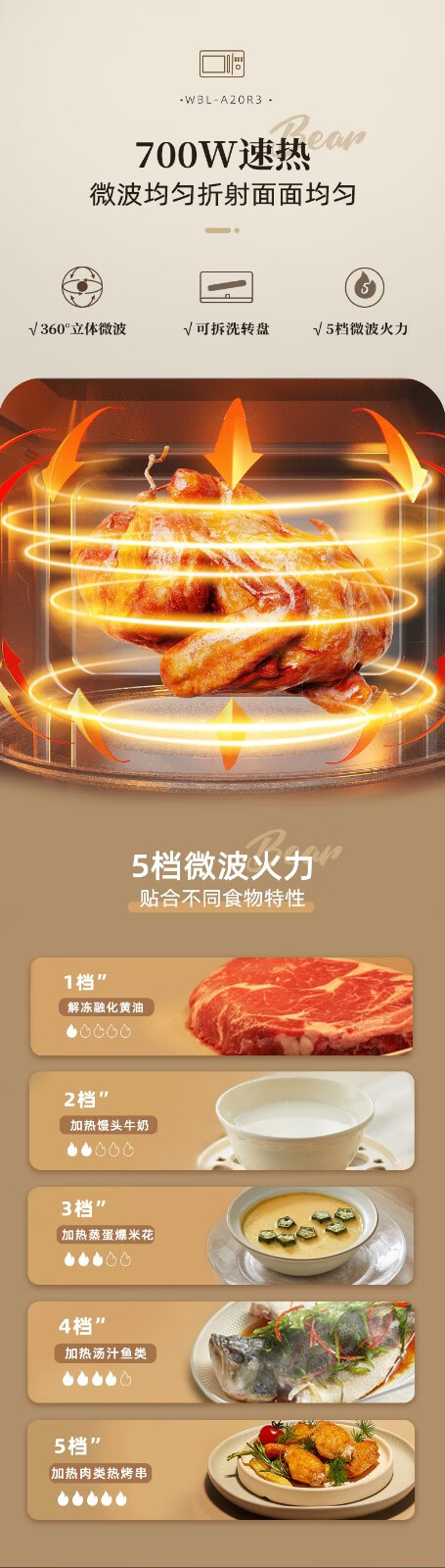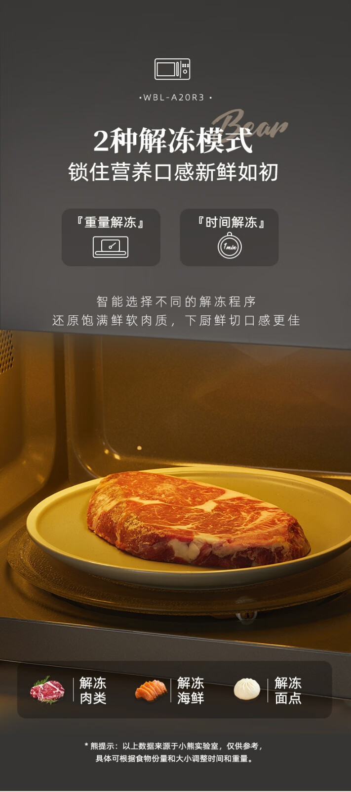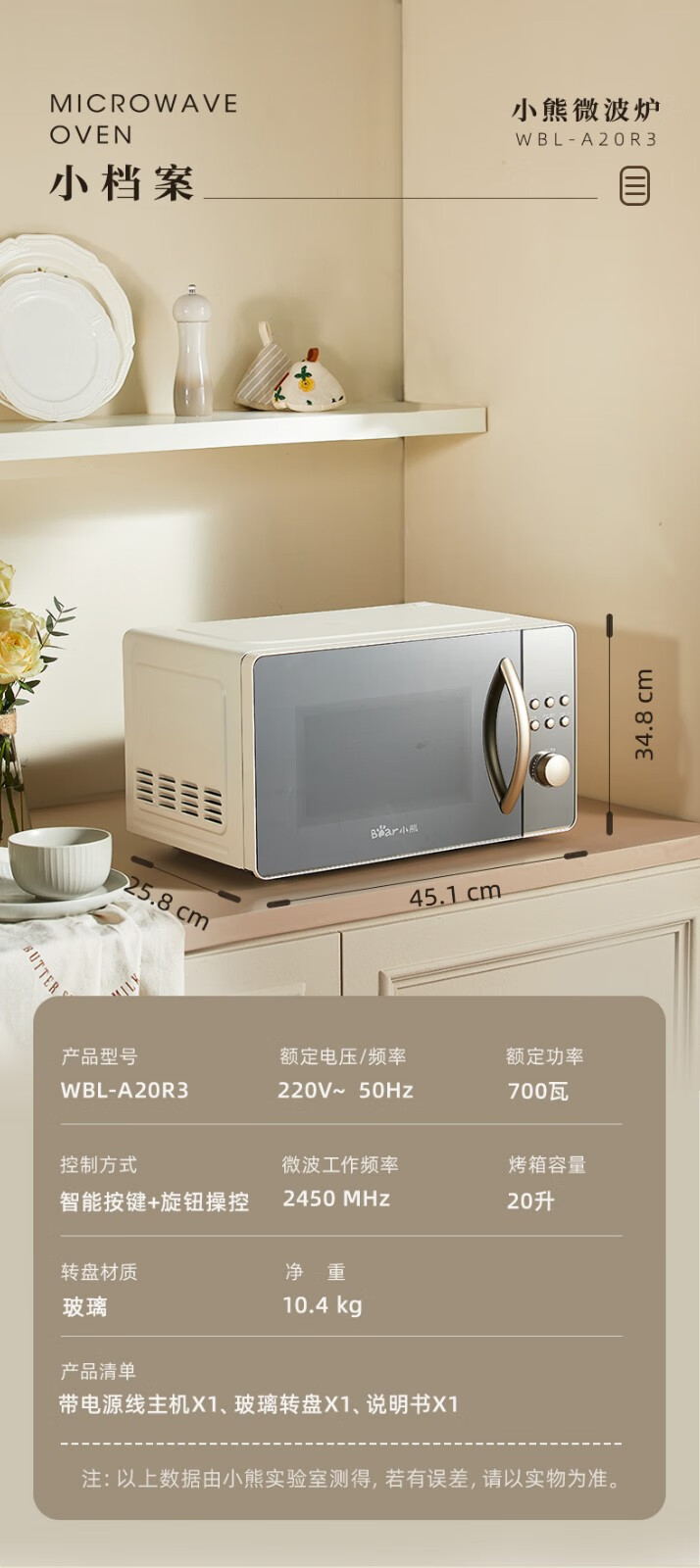 小熊(Bear) 微波炉 家用快捷 360°转盘加热20L五档火力 WBL-A20R3 20L容量+旋扭操控+快速加热