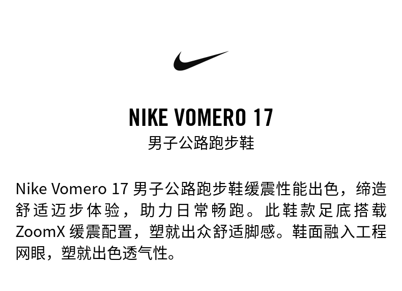 严选 | Nike耐克VOMERO 17公路缓震跑步鞋 轻便透气 舒适减震