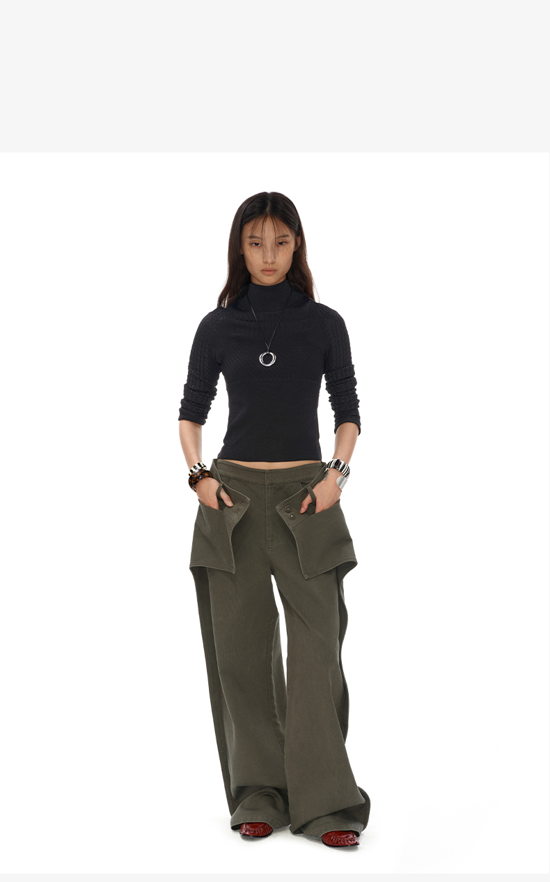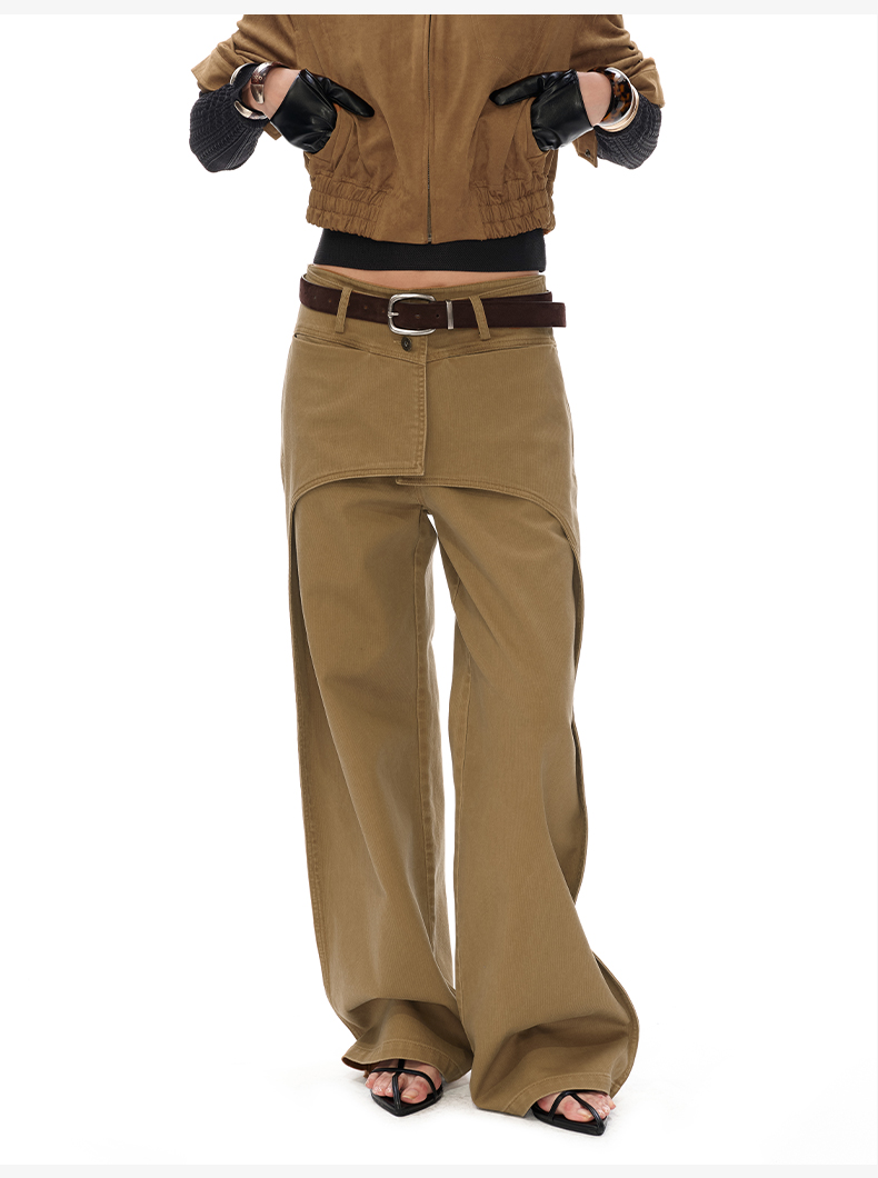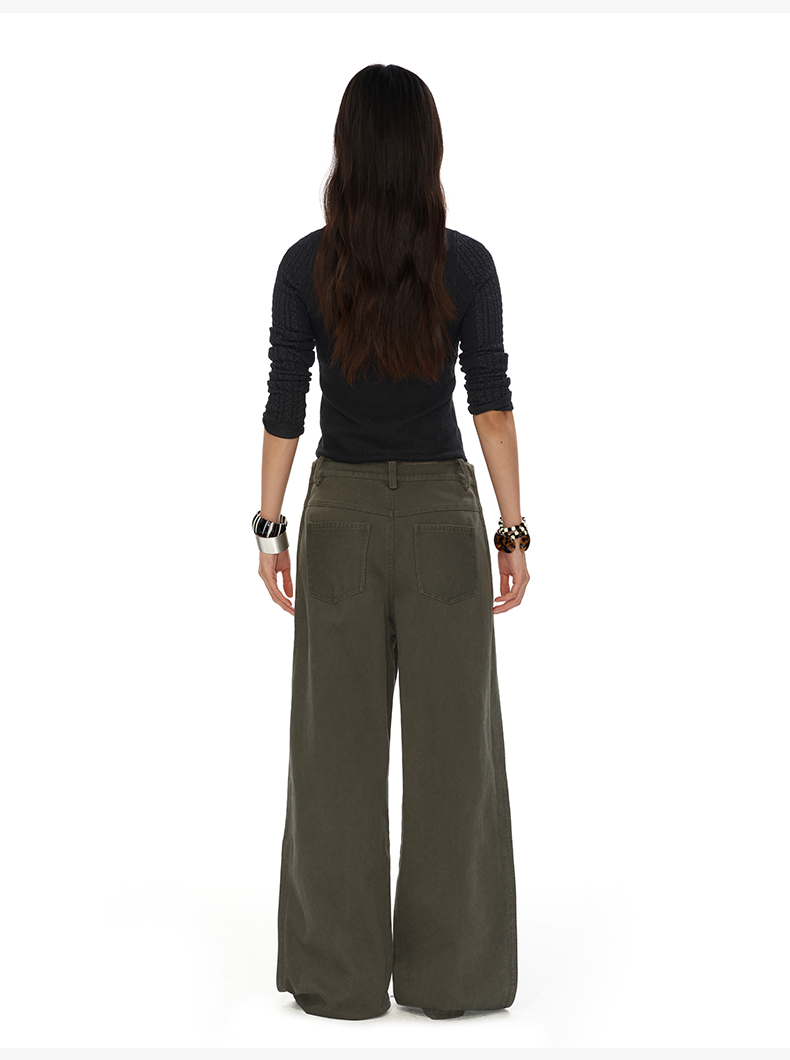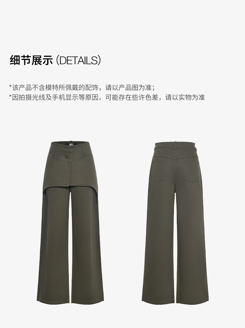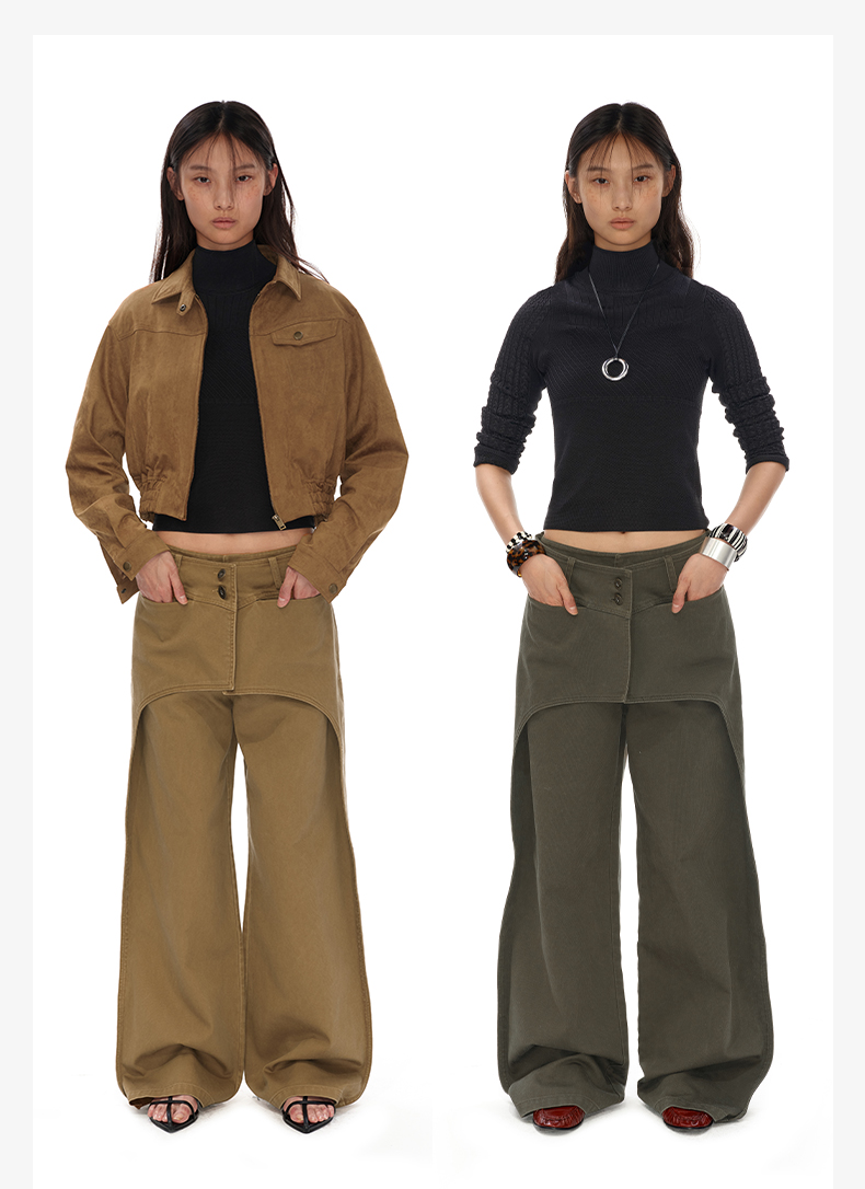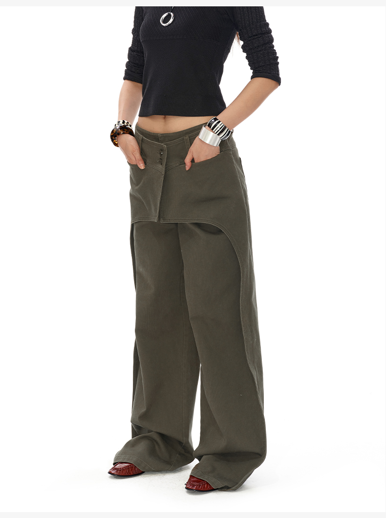 NUTH搭片假两件宽松直筒复古工装裤女秋冬 军绿色/卡其色洗