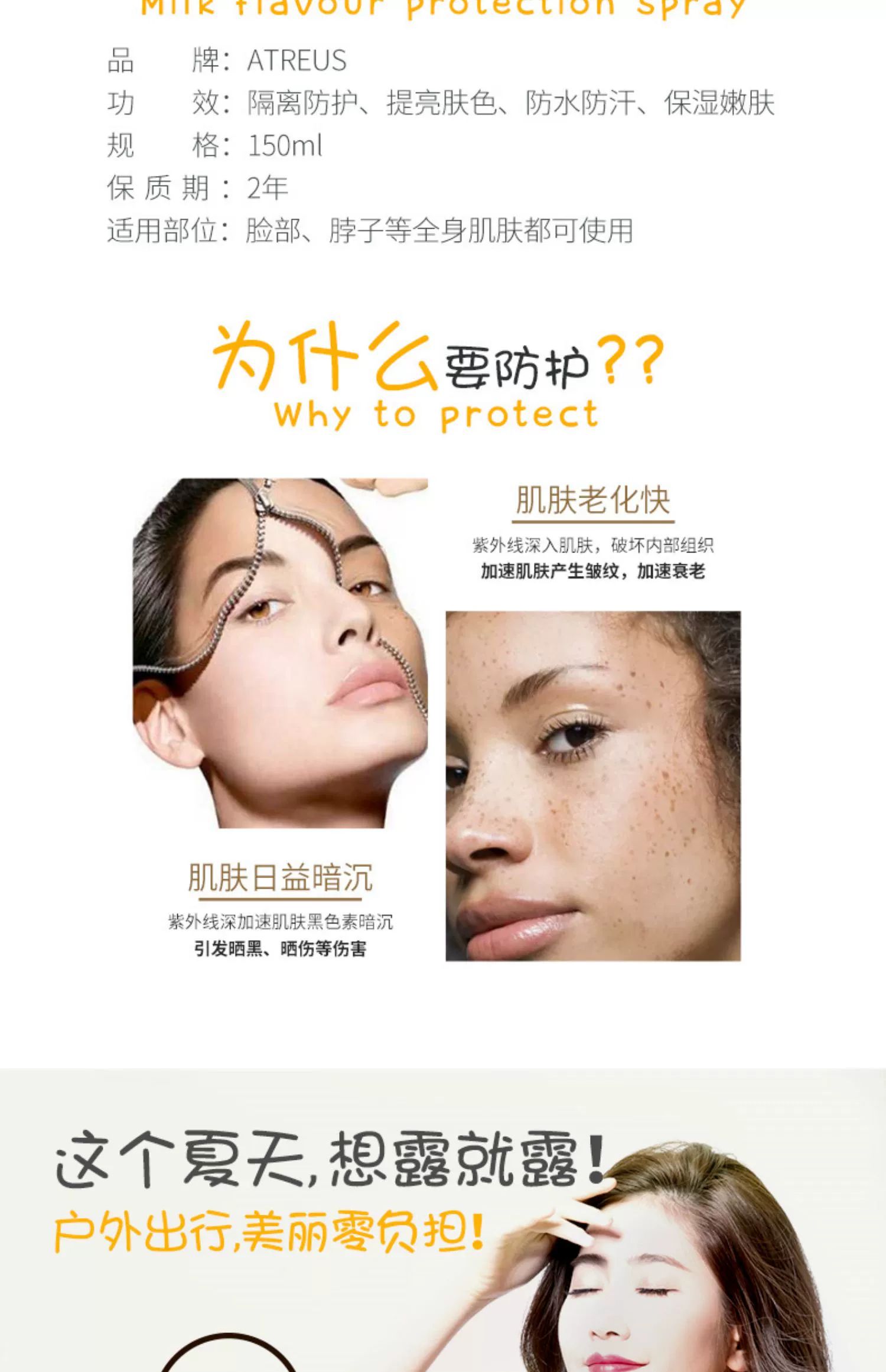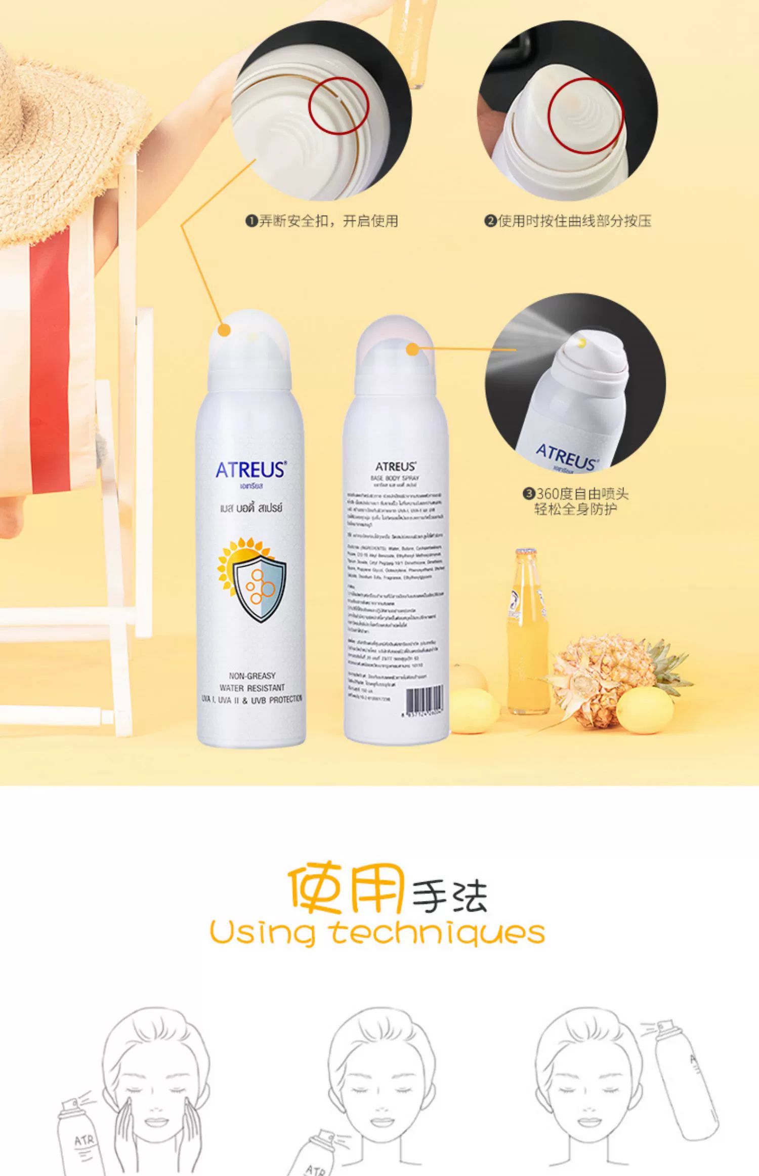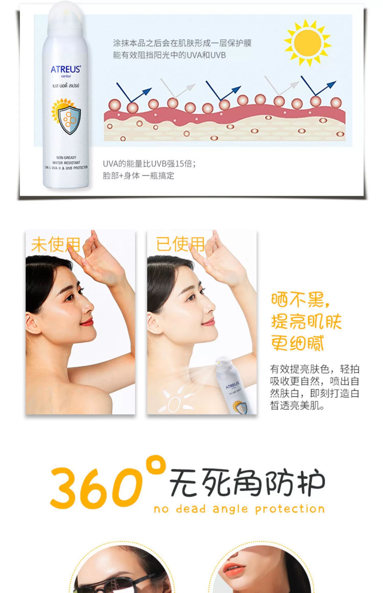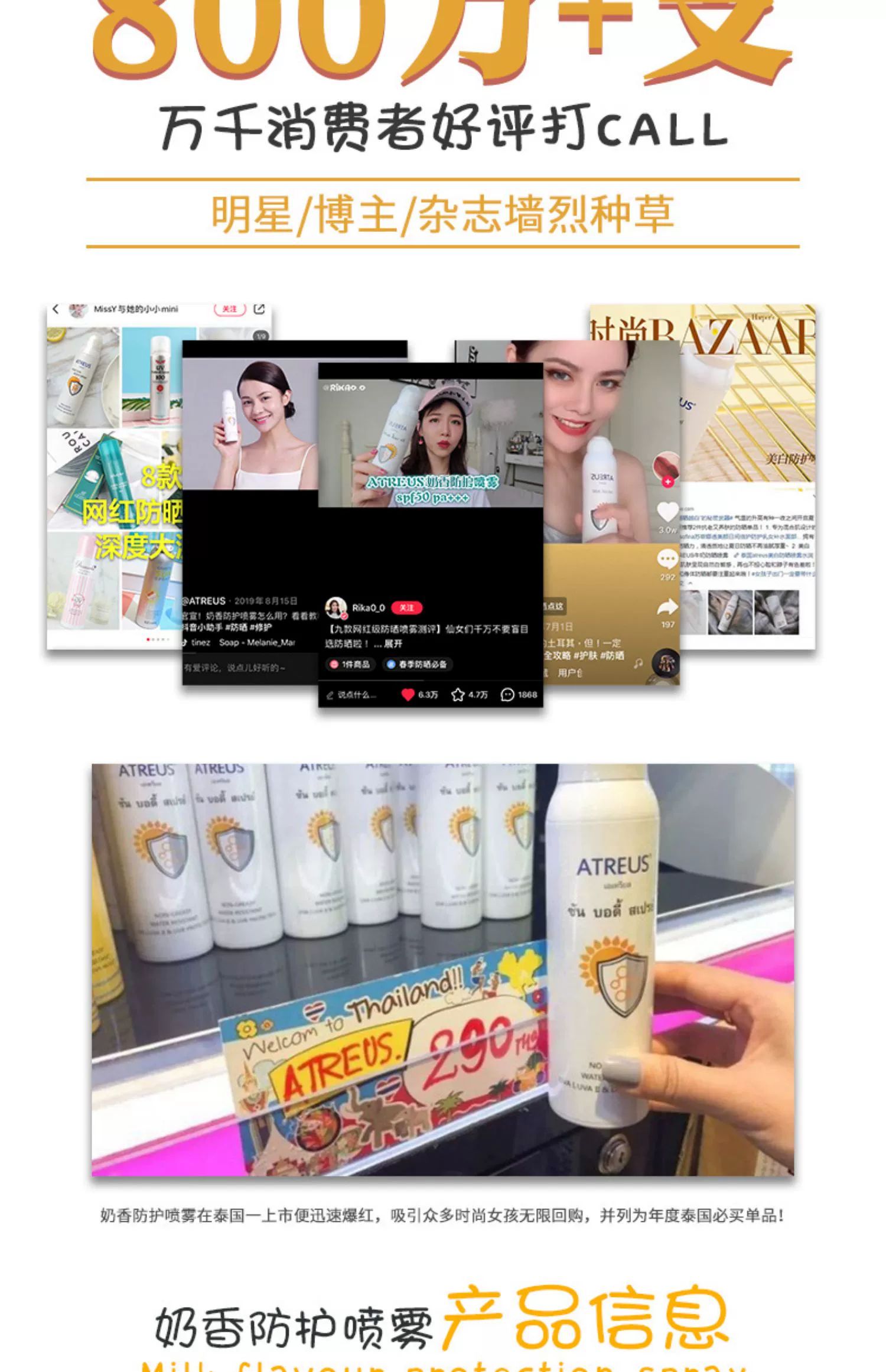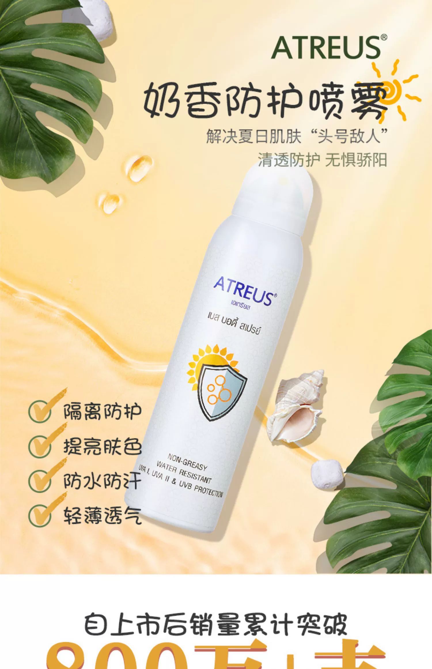 泰国atreu牛奶味嫩白防晒喷雾150ml隔离防护提亮肤色防水防汗轻薄透气保湿嫩肤