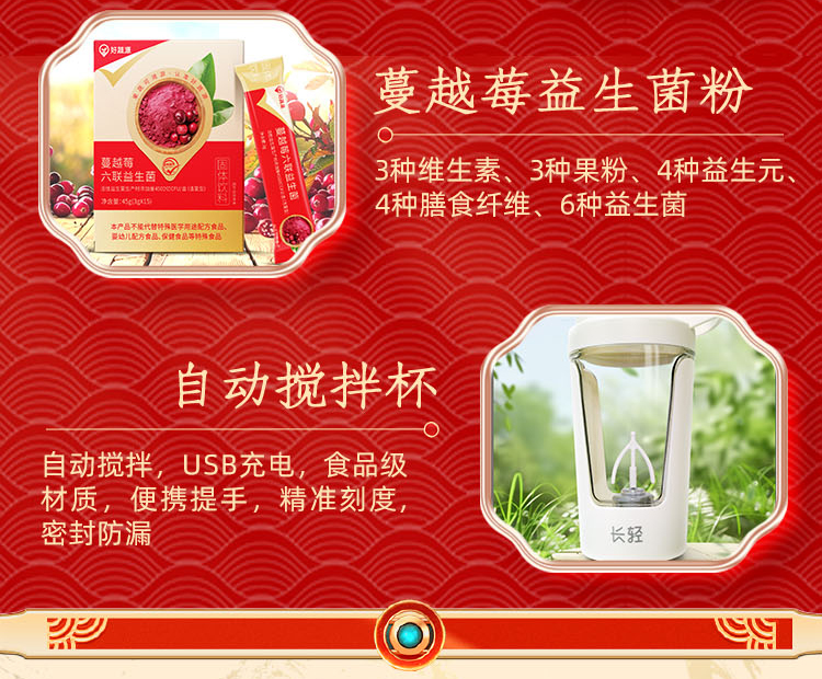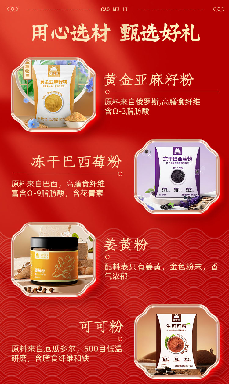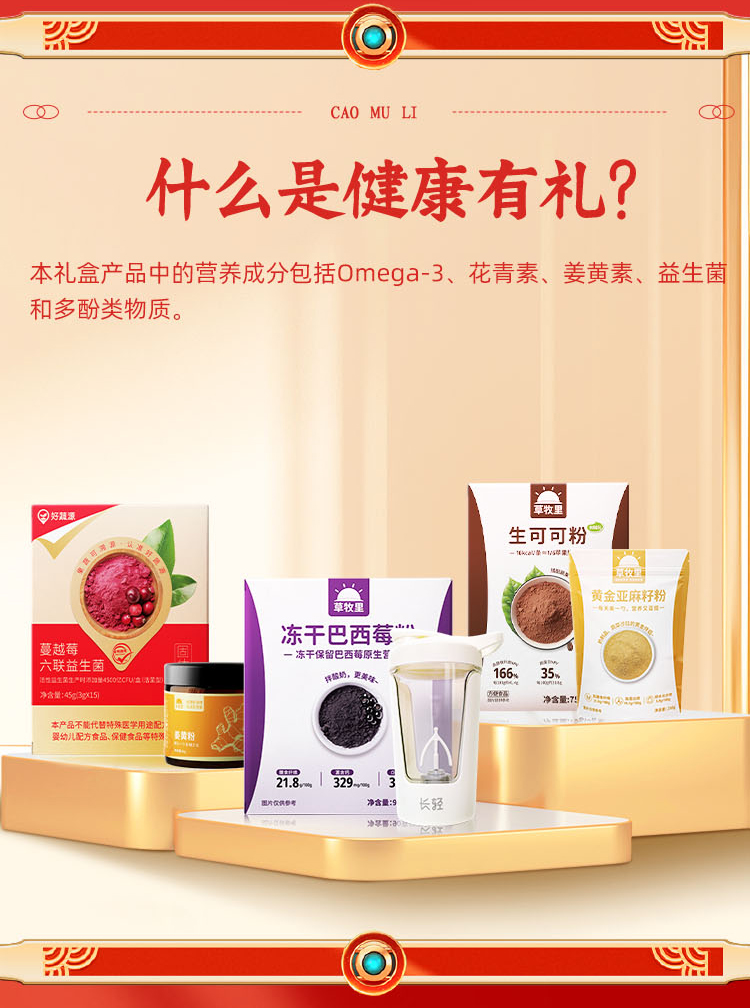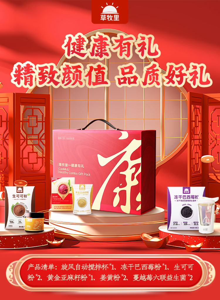 【500积分+289元】草牧里 健康有礼礼盒装 (亚麻籽粉250g*1袋+巴西莓粉*1盒+姜黄粉*2罐+可可粉*2盒+蔓越莓益生菌*2盒+加赠电动摇摇杯*1) 品质臻享