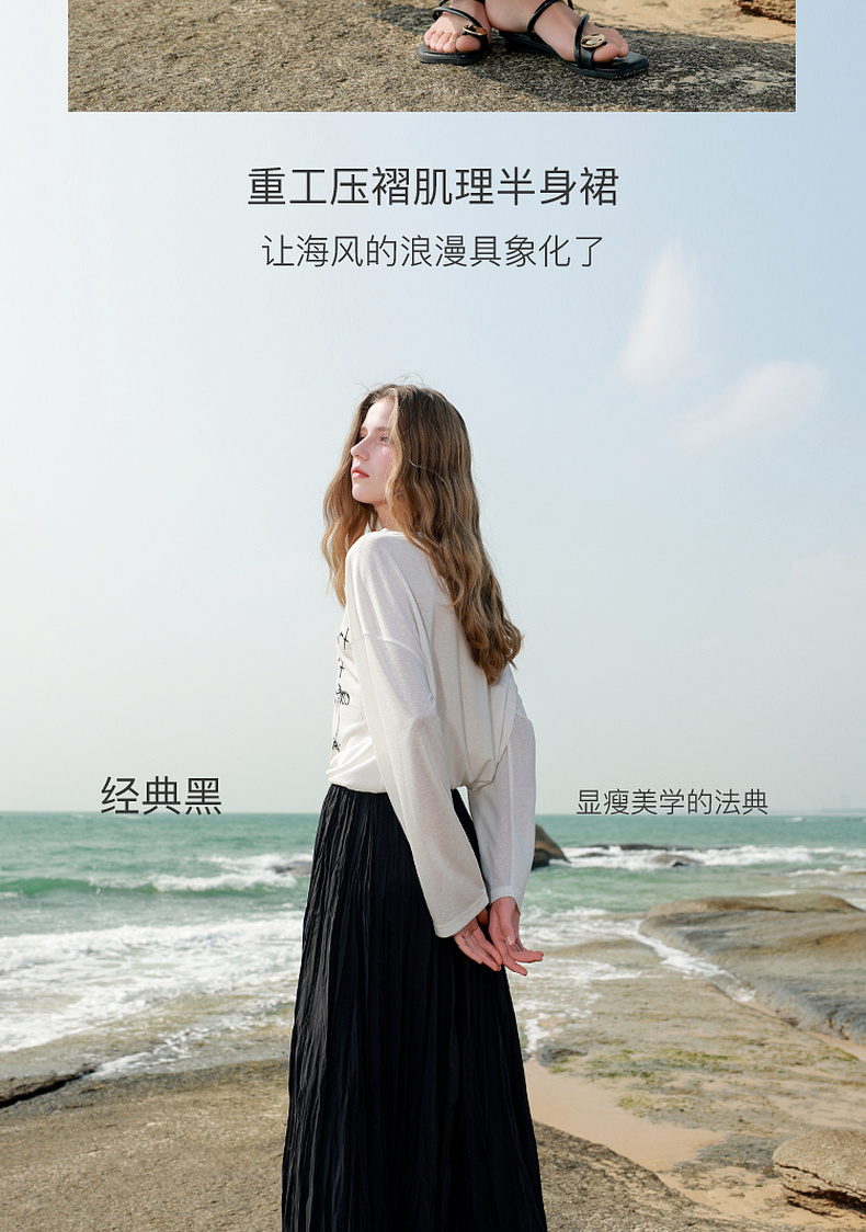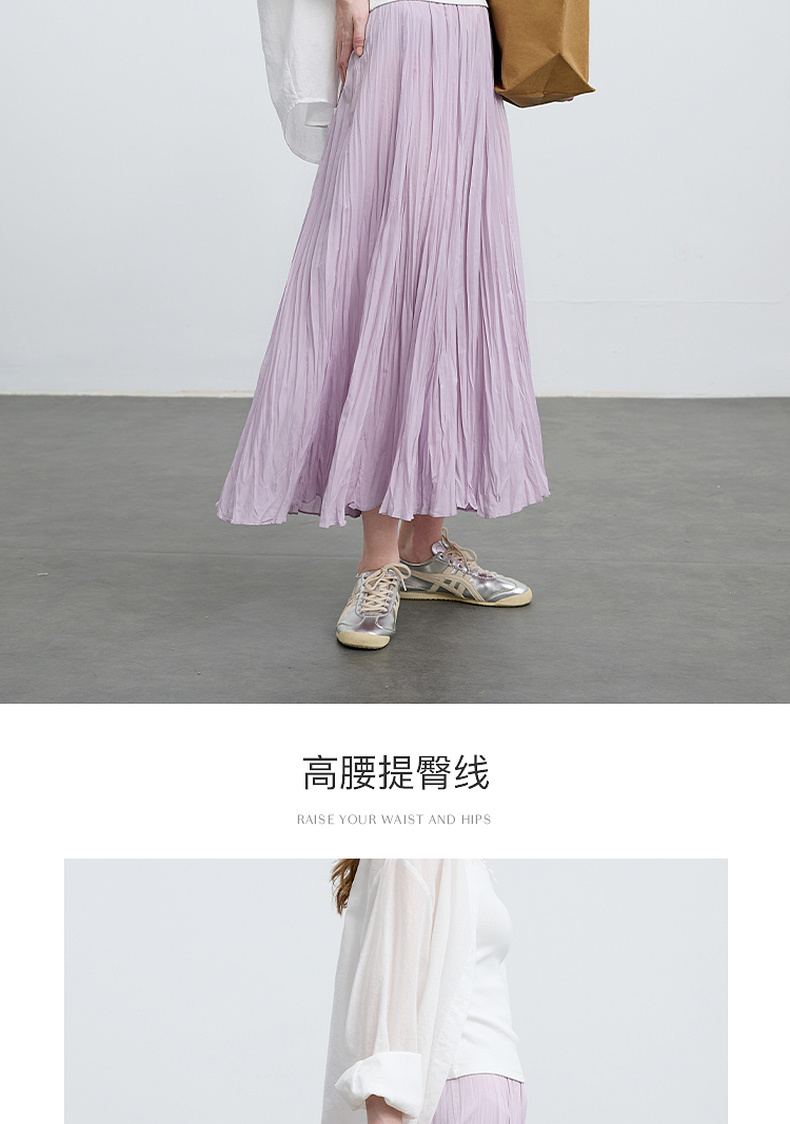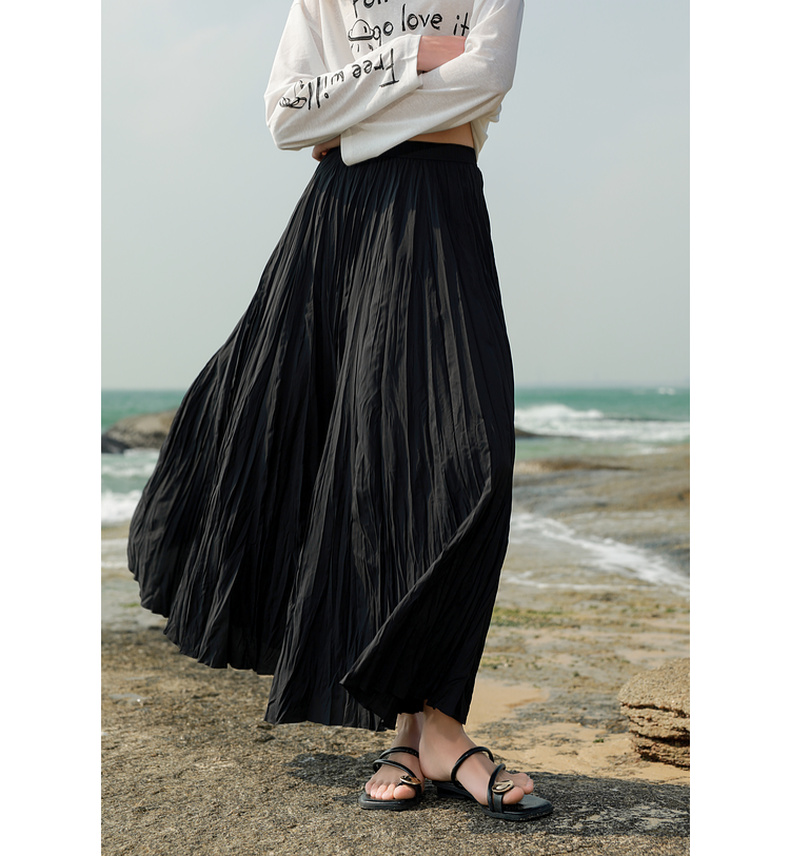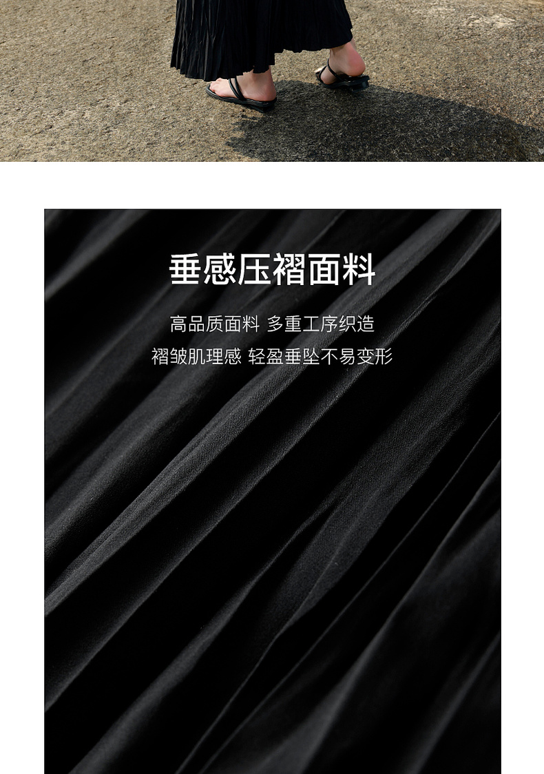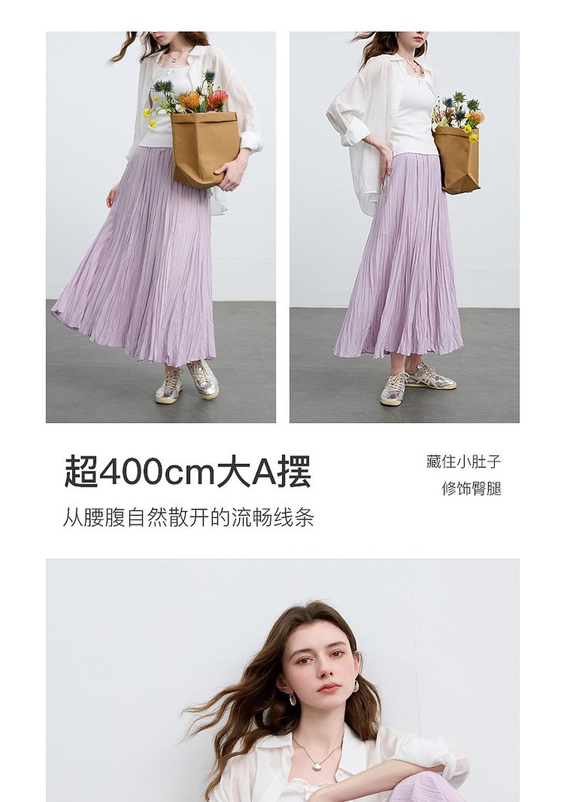 三彩2025春季新款肌理感压褶半身裙松紧高腰A字裙浪漫长裙M