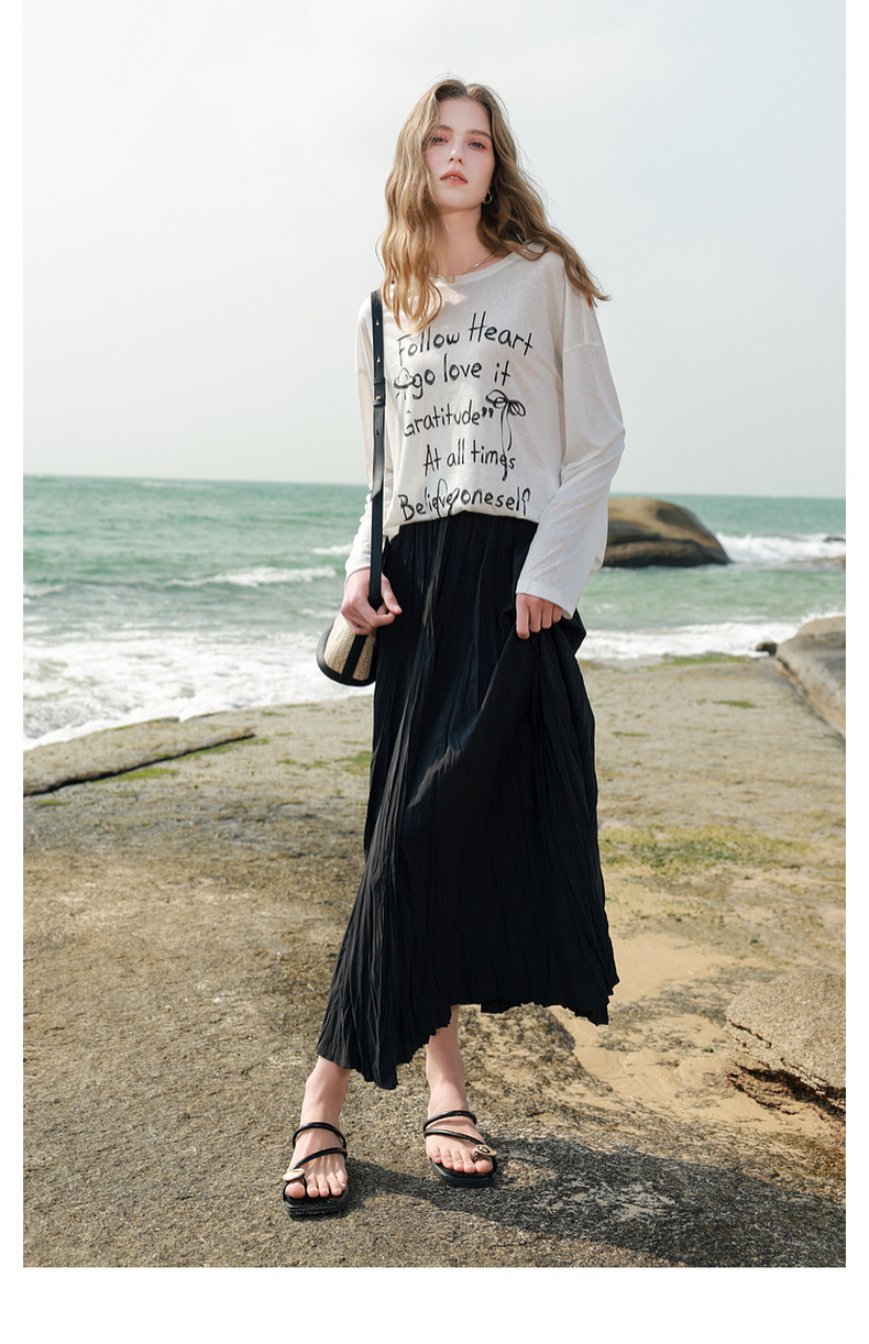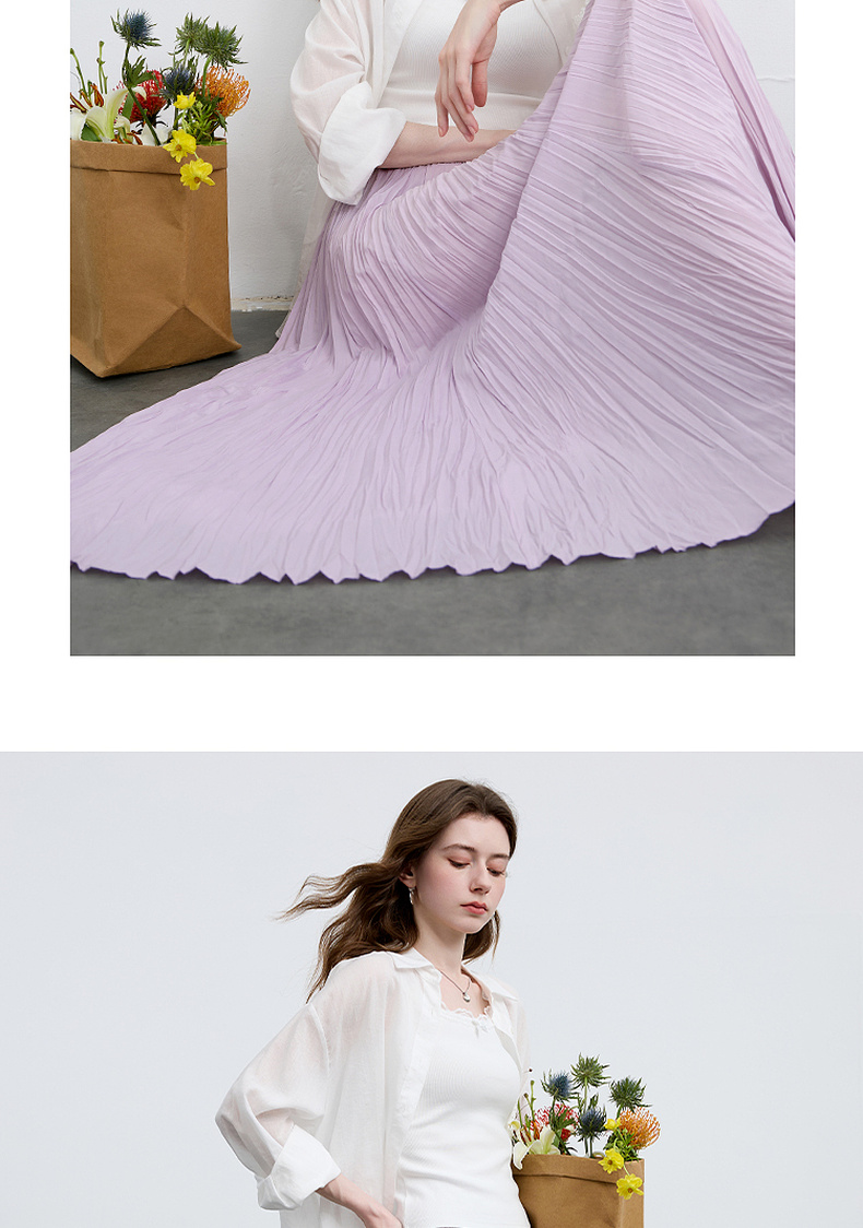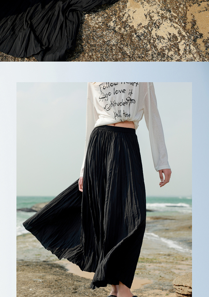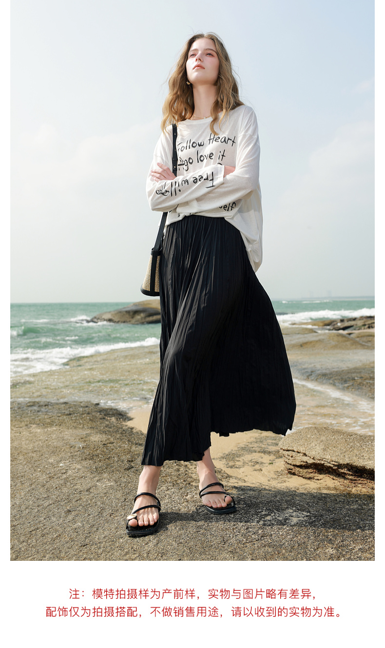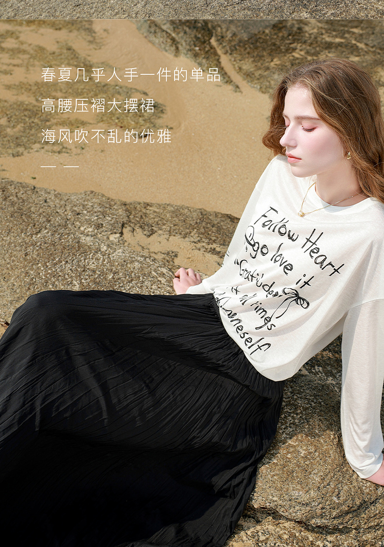 三彩2025春季新款肌理感压褶半身裙松紧高腰A字裙浪漫长裙M