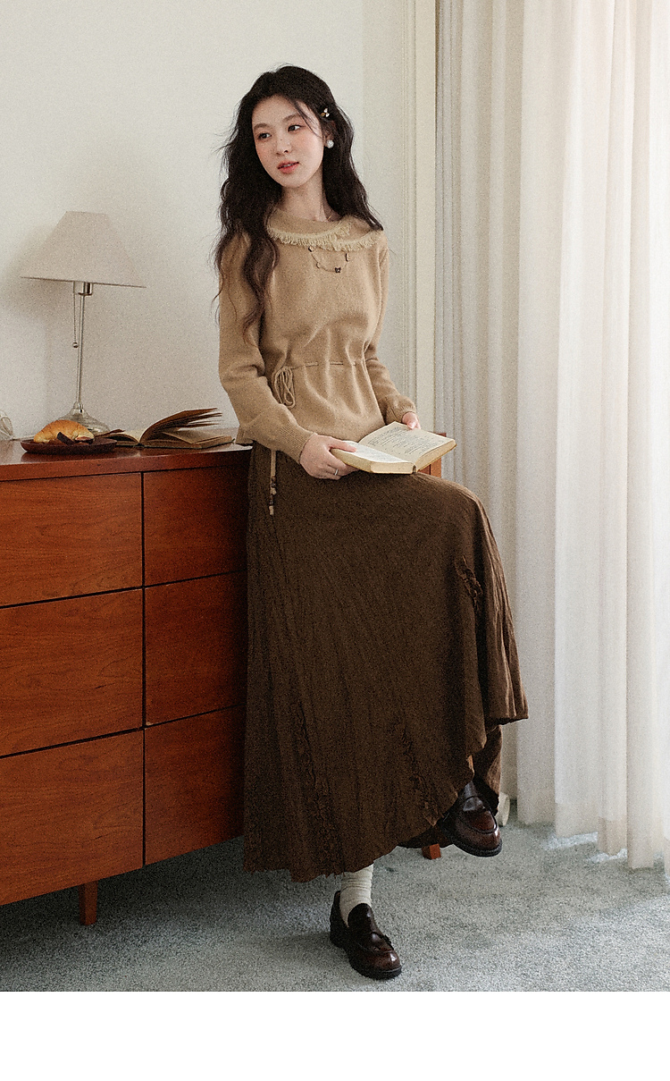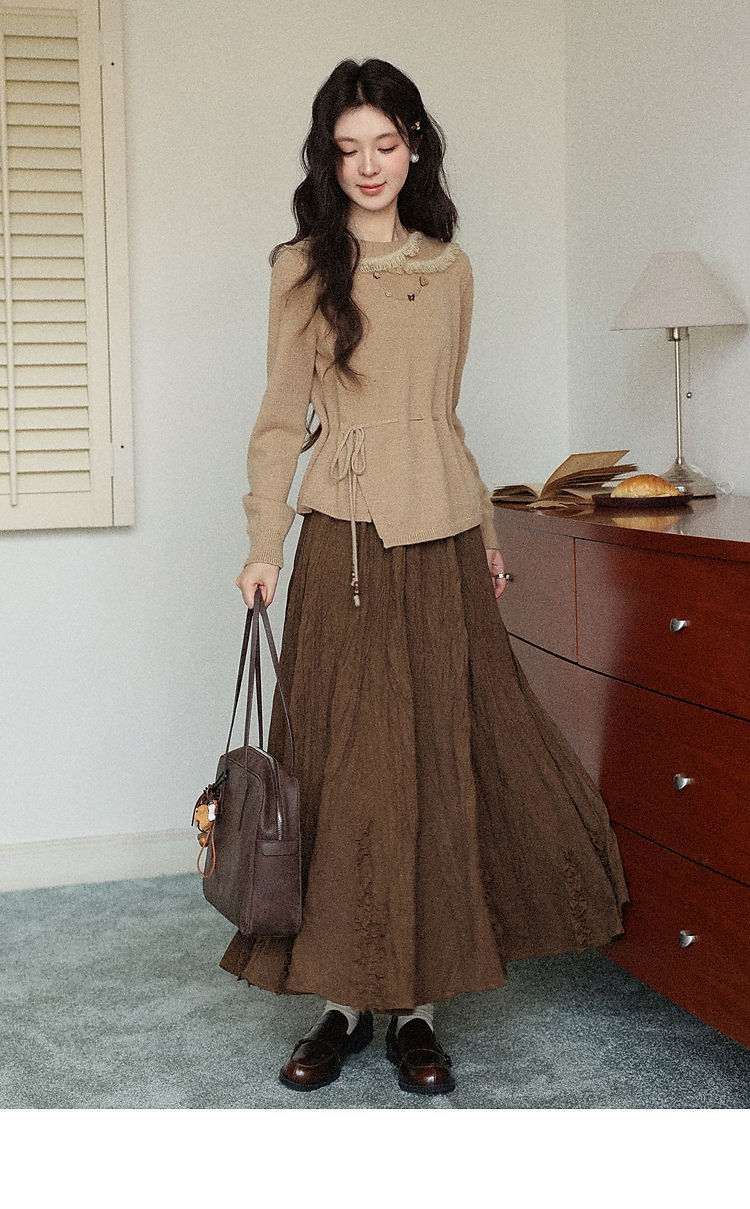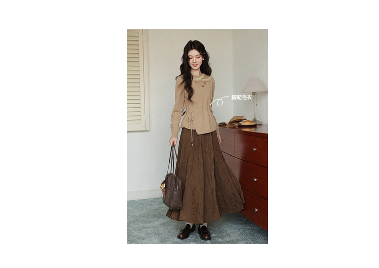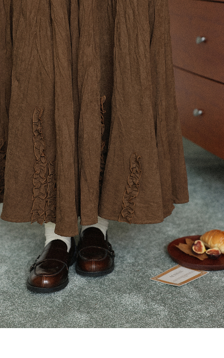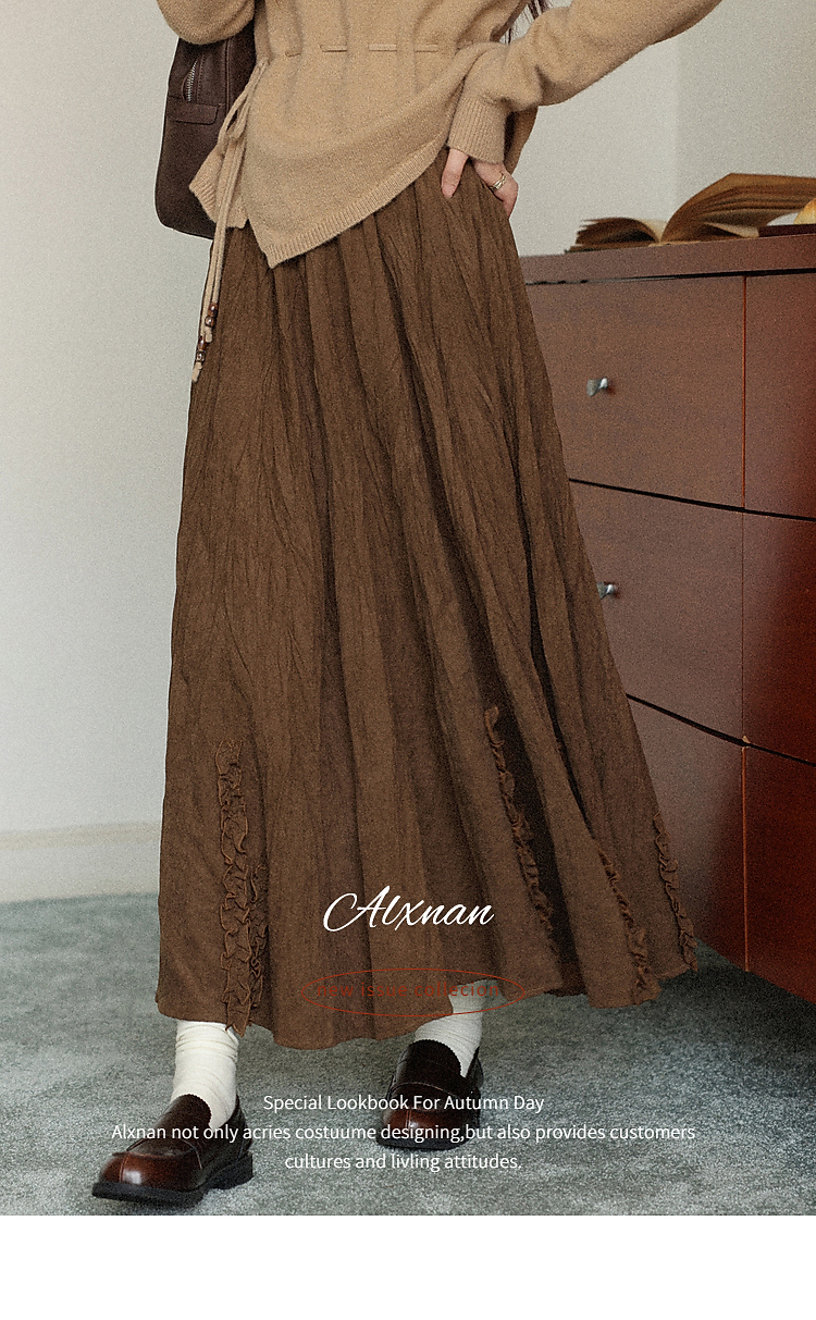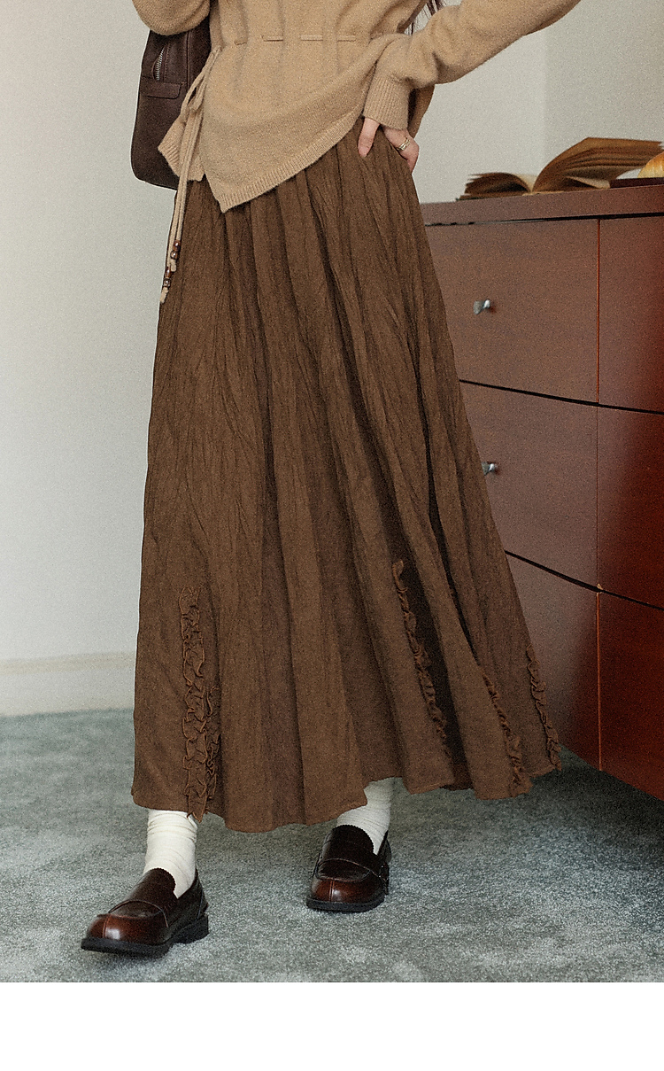 鹿向南「北欧港湾」棕色木耳边褶皱半身裙秋冬新款文艺复古长裙女