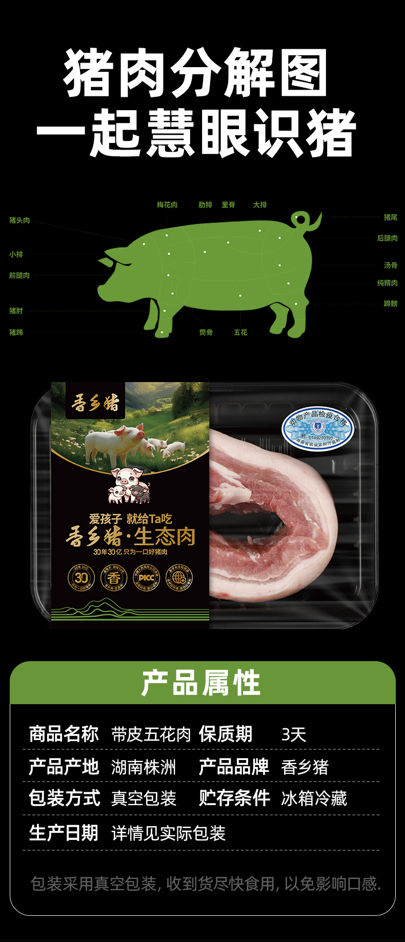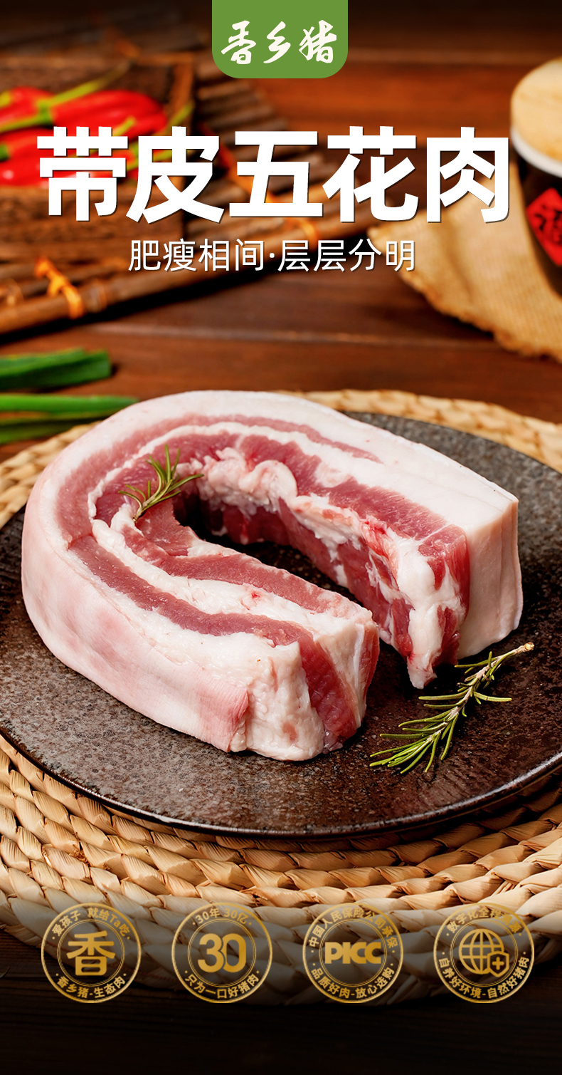 唐人神香乡猪五花肉500g*3无抗生素带皮原切新鲜猪肉生态肉