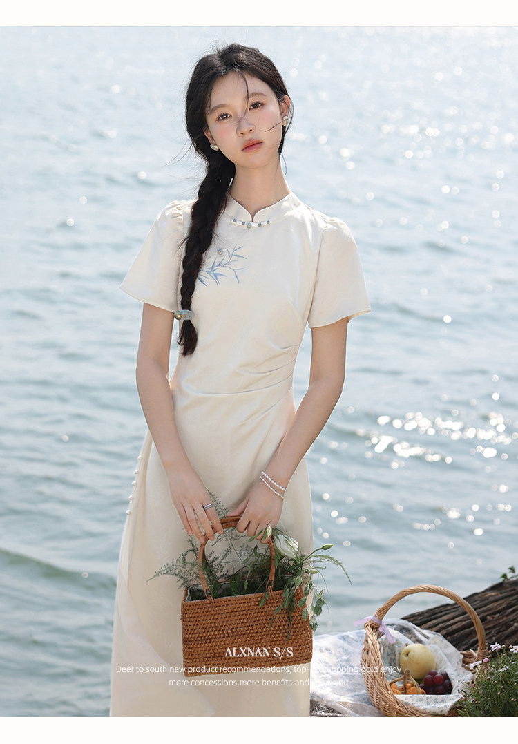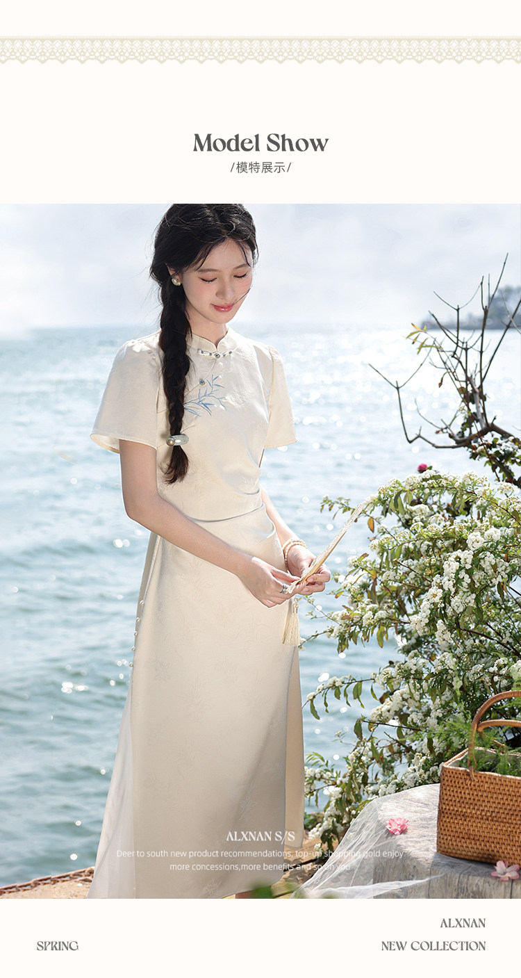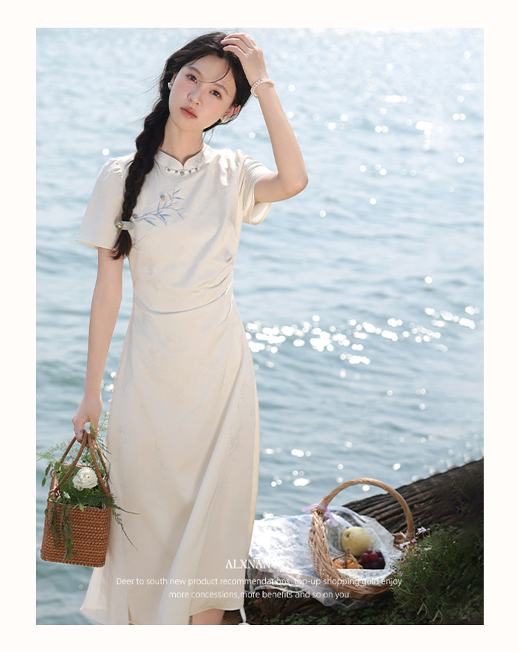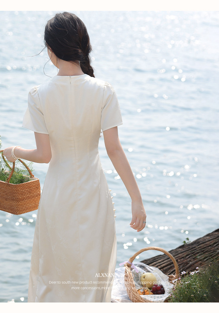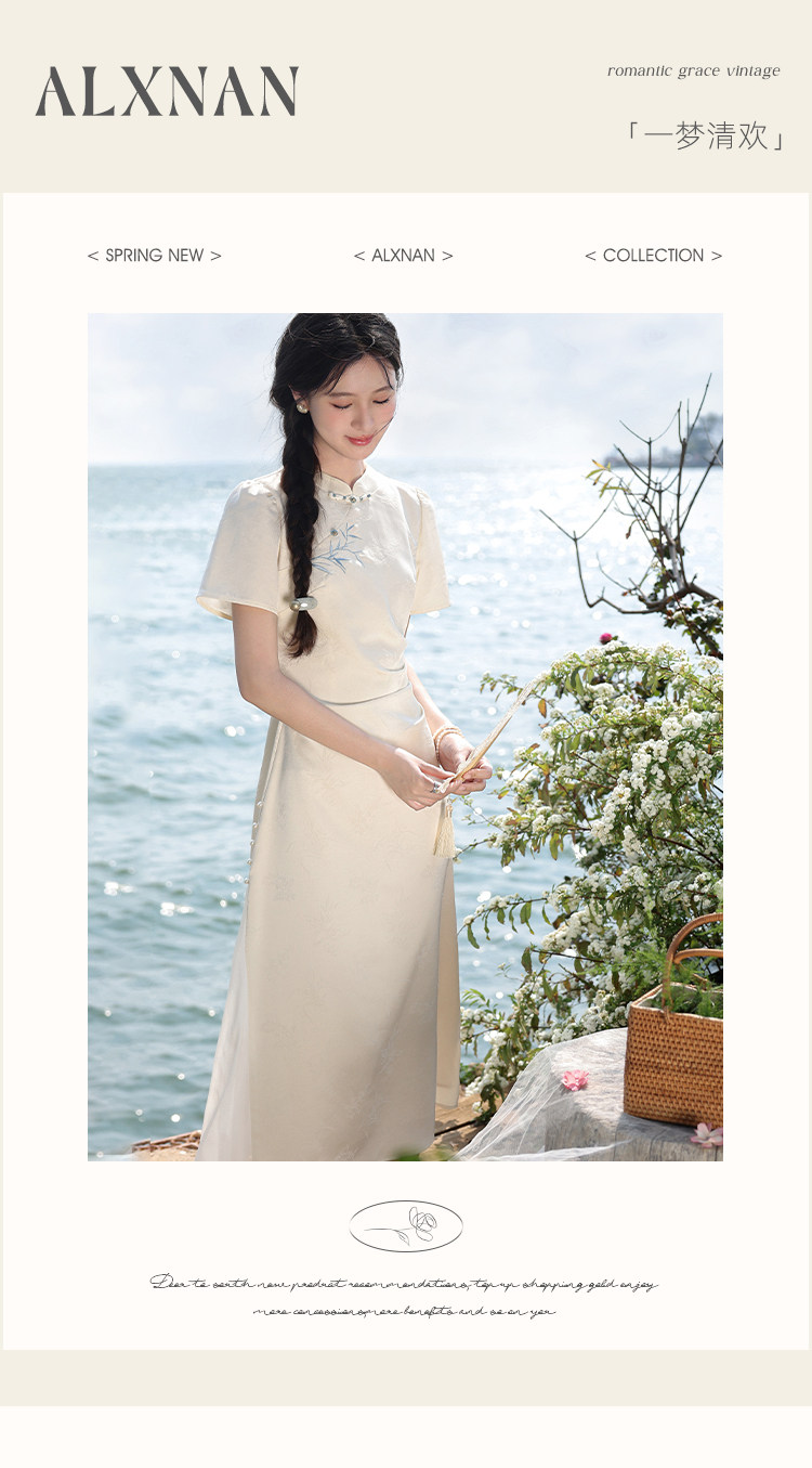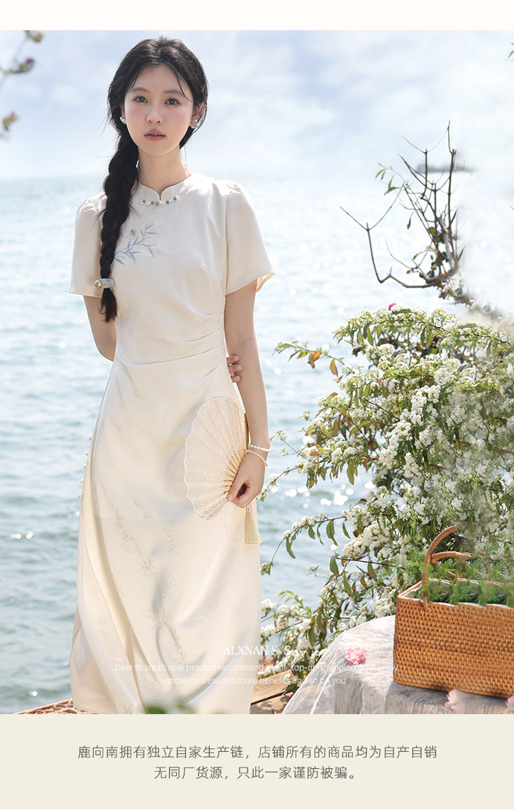 鹿向南「一梦清欢」杏色新中式连衣裙女夏复古改良式旗袍气质长裙