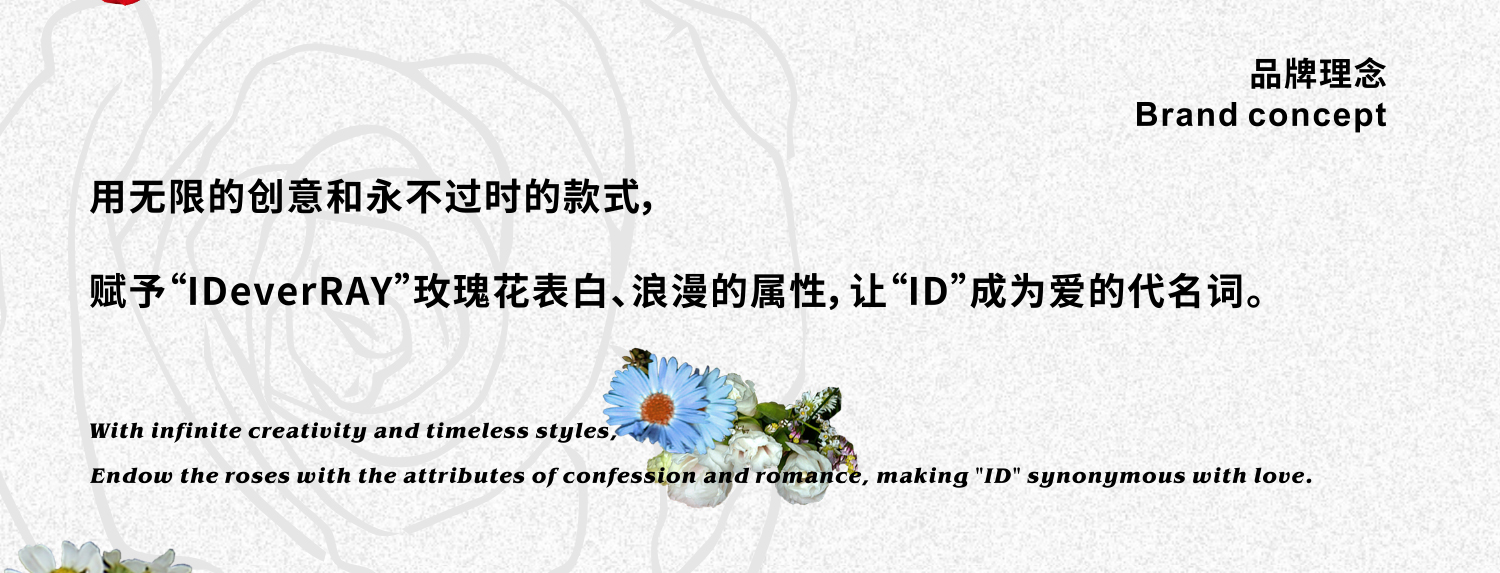 - ❣IDeverRAY简称“ID”,象征独一无二的个人标识,同时与"爱的"谐音,代表爱情的个性化表达 品牌slogan:玫瑰🌹配ID,更好的告白 品牌语言:I ID YOU