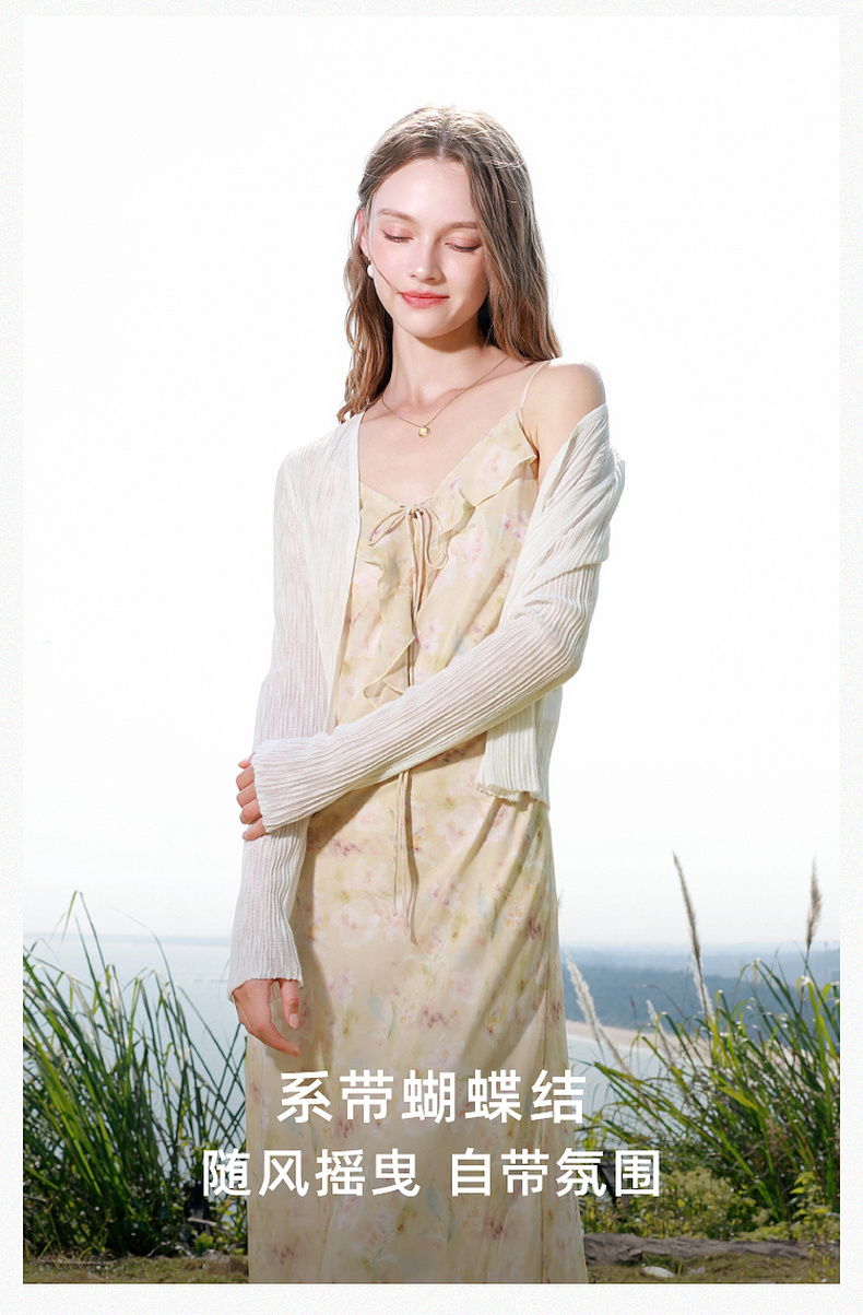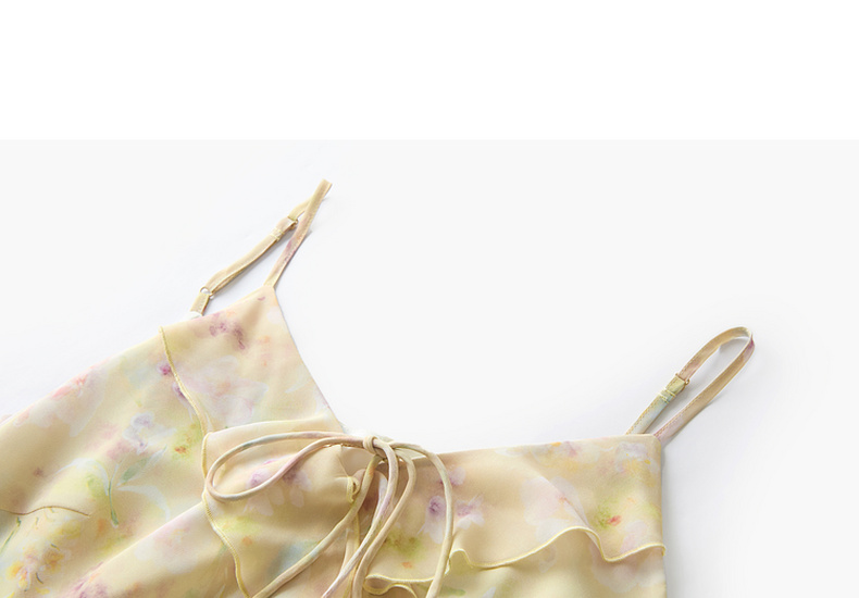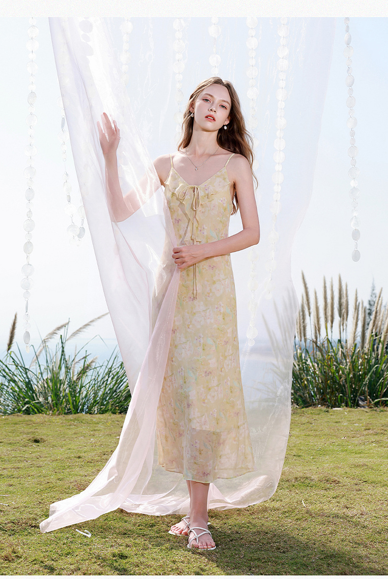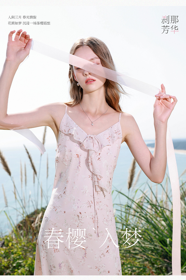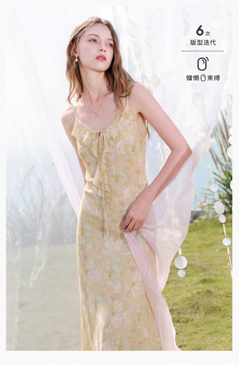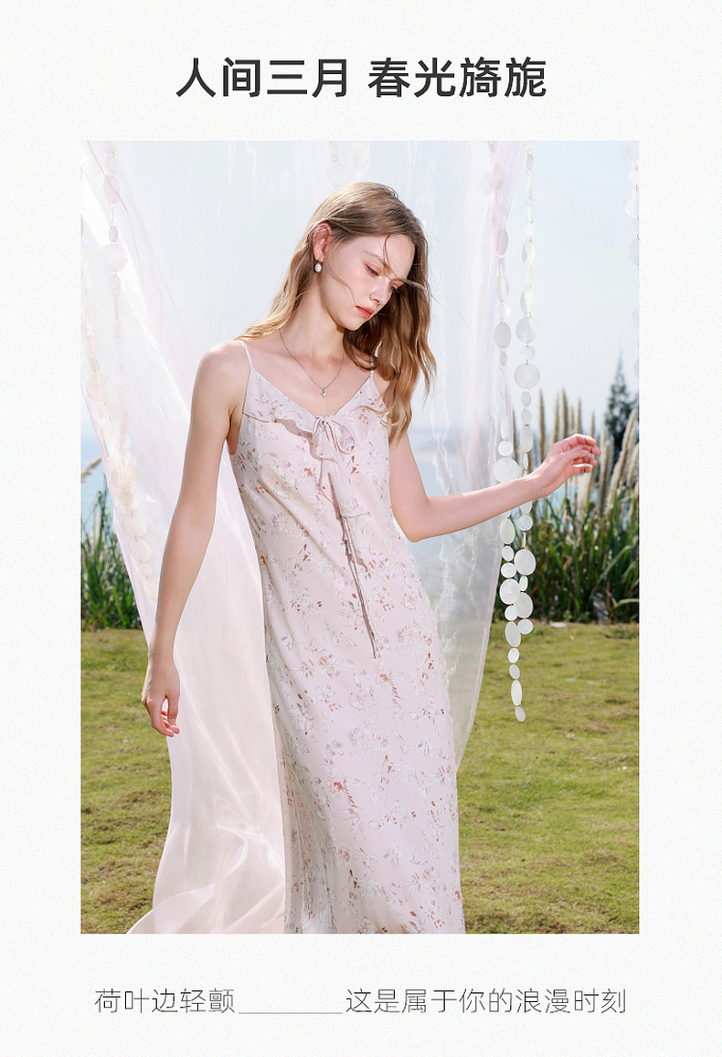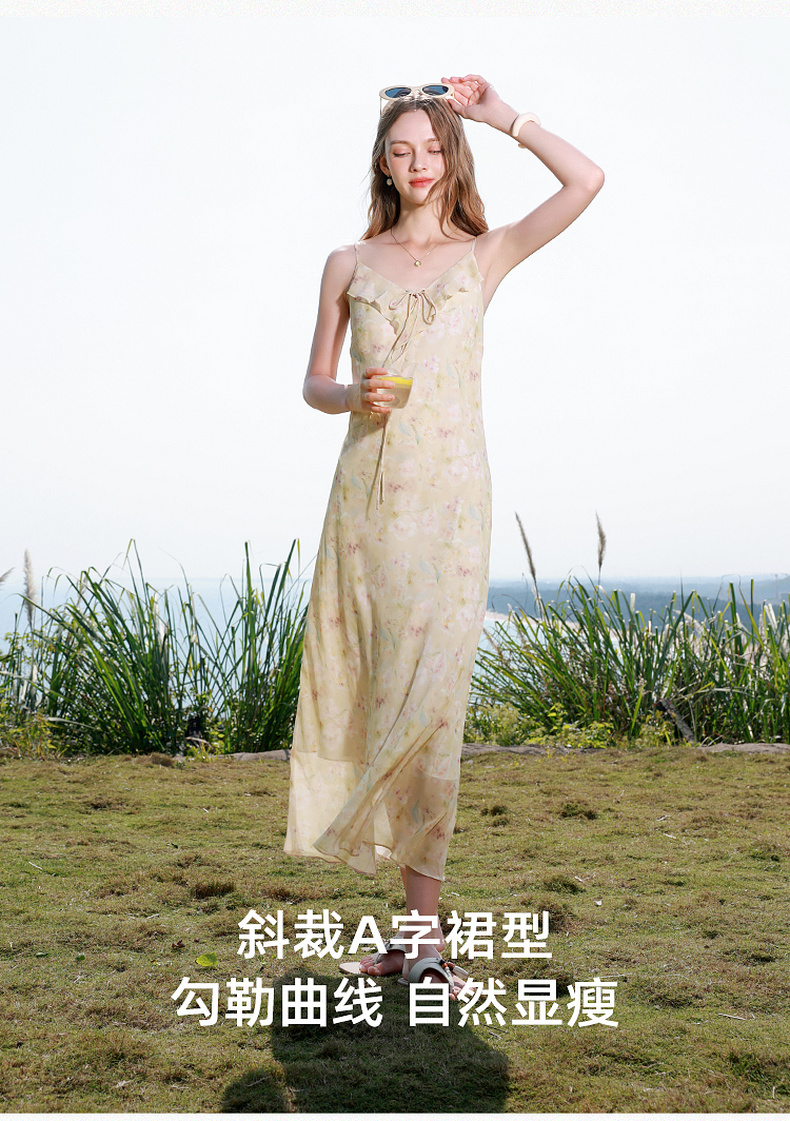 三彩2026春季新款碎花吊带裙荷叶边连衣裙斜裁长裙度假M