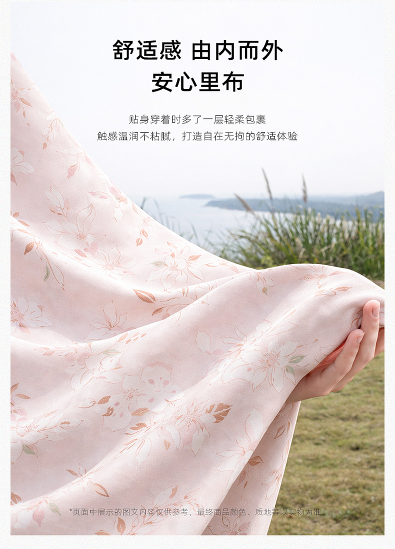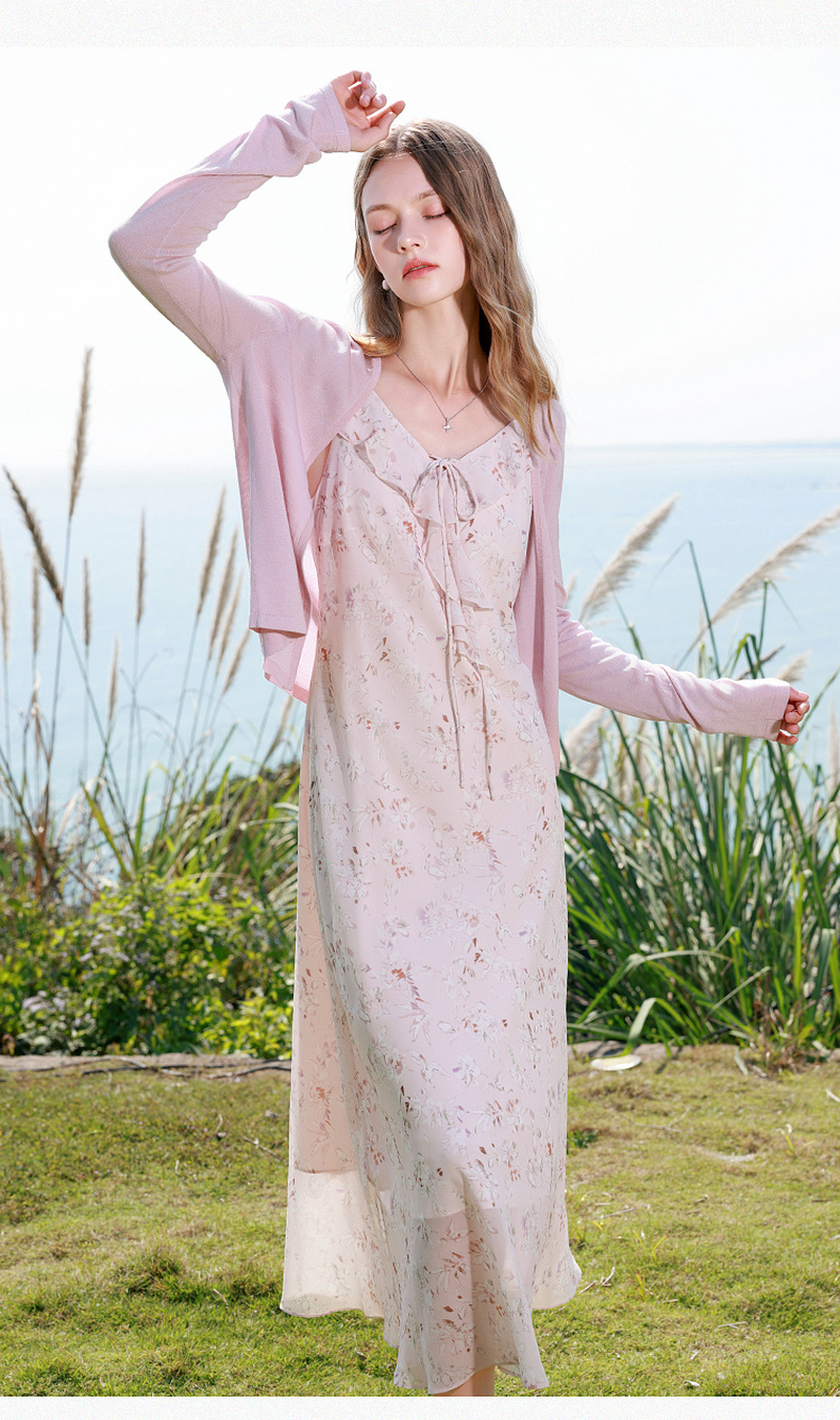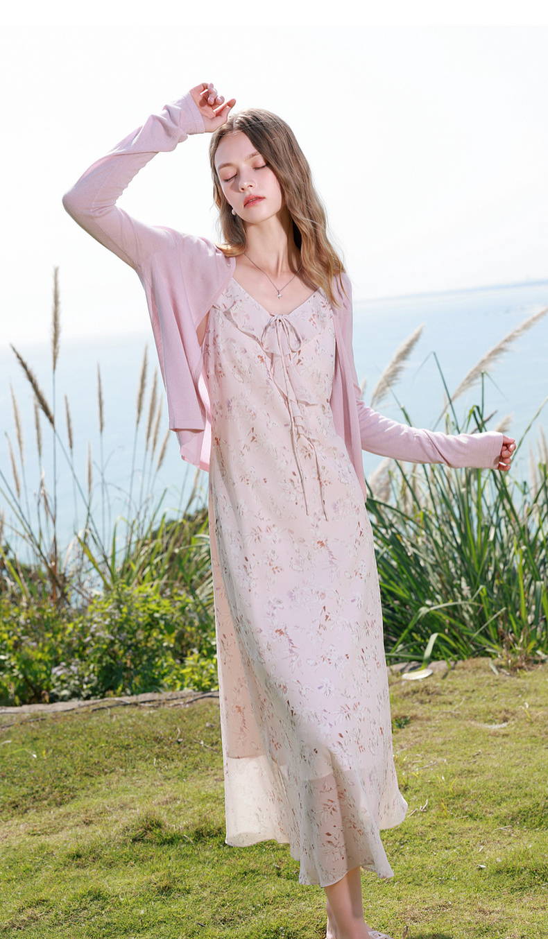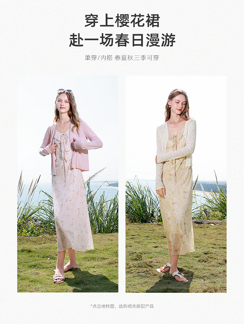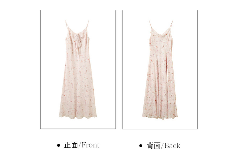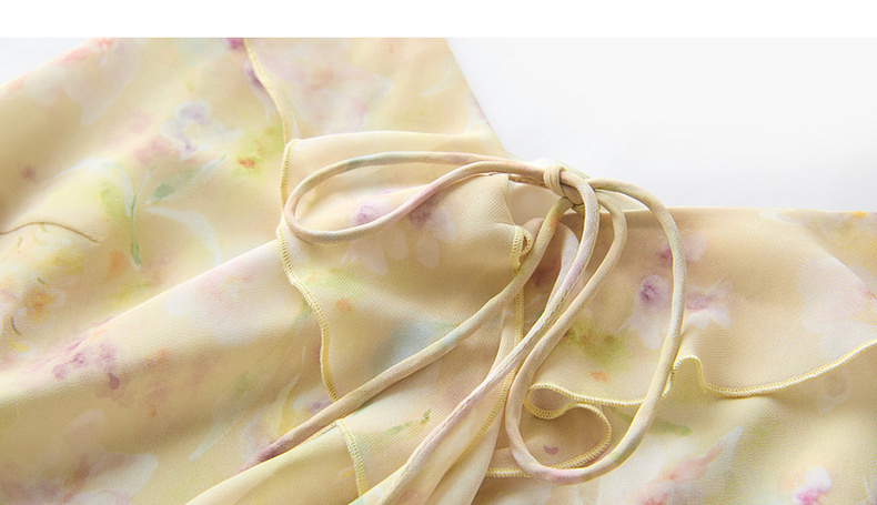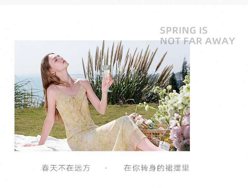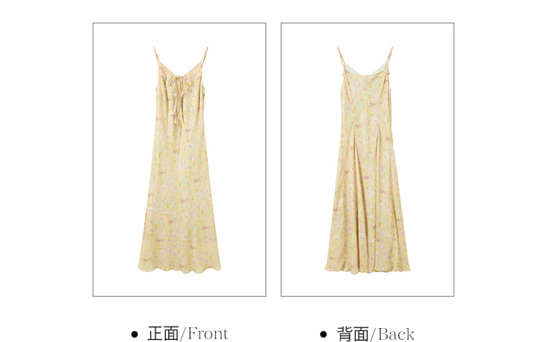 三彩2026春季新款碎花吊带裙荷叶边连衣裙斜裁长裙度假M