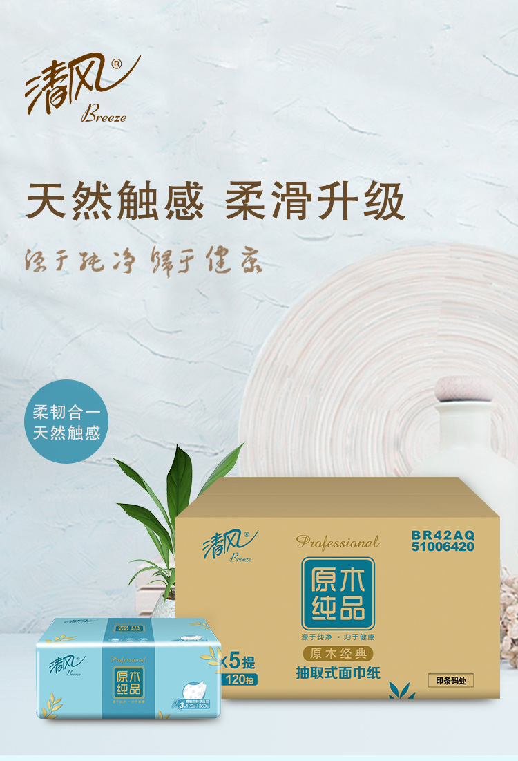 清风原木纯品3层四叶草压花120抽抽取式面巾纸BR42AQ整箱