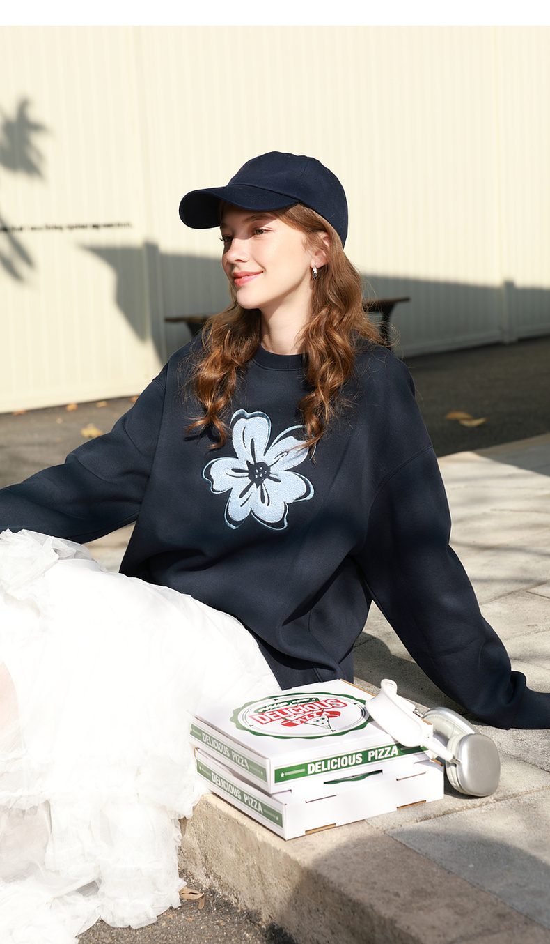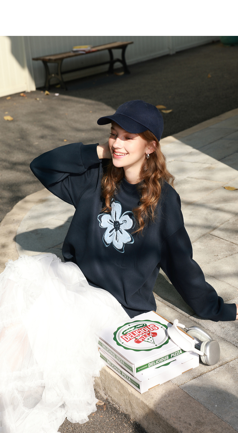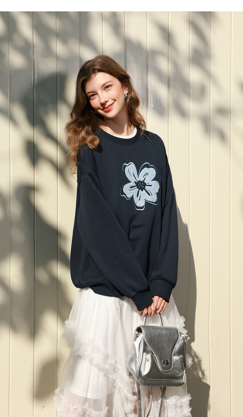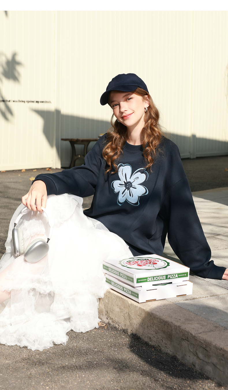 三彩2026春季新款花朵毛巾绣卫衣套头衫宽松休闲落肩袖复古M