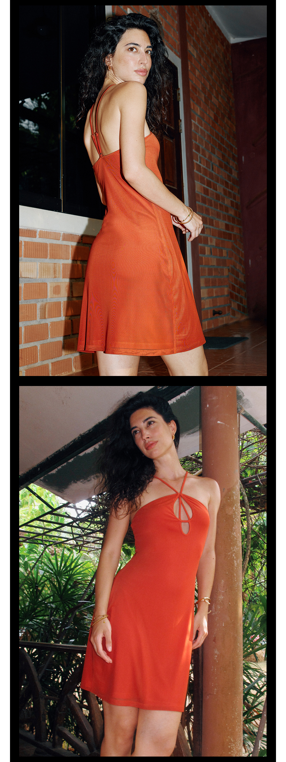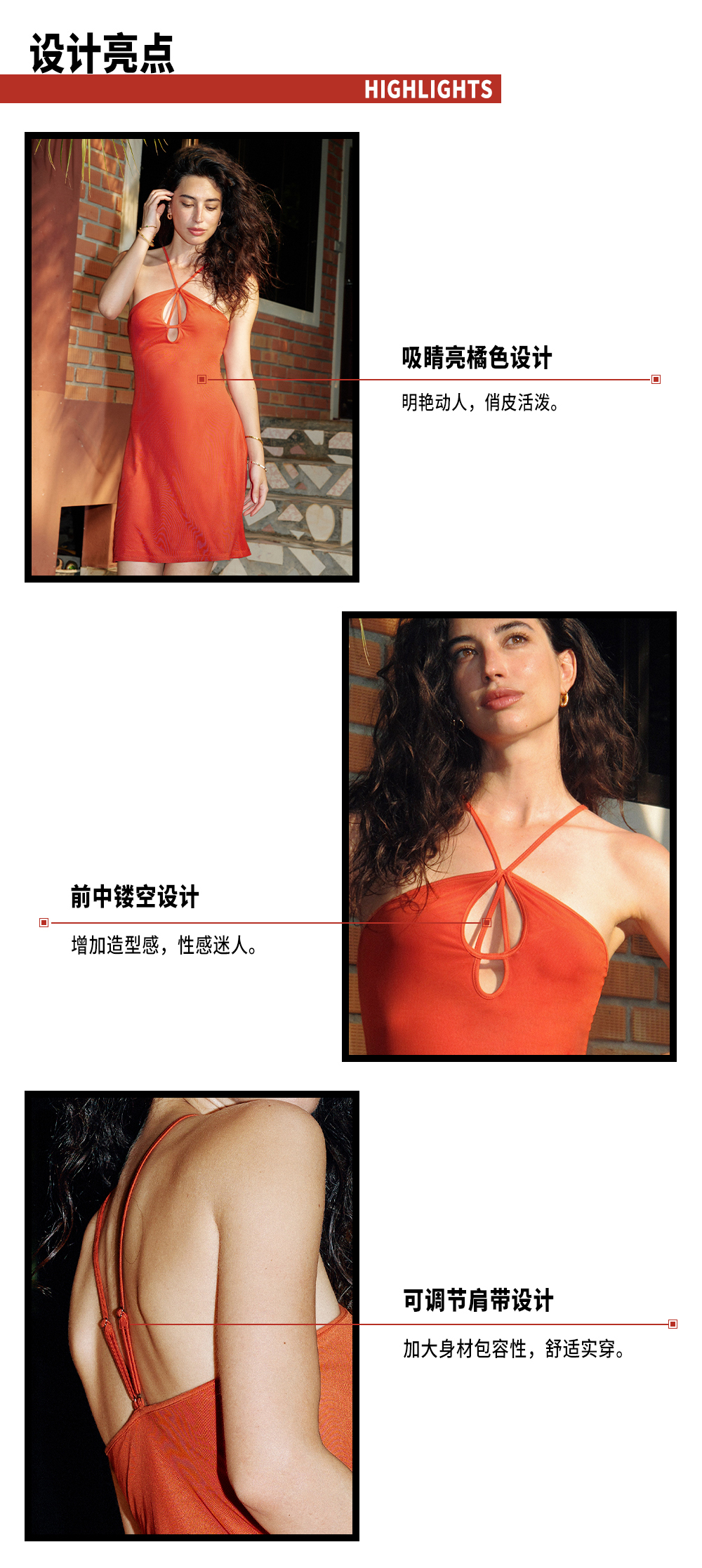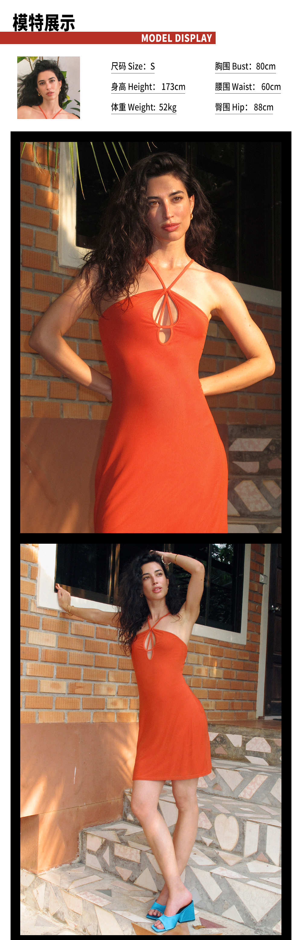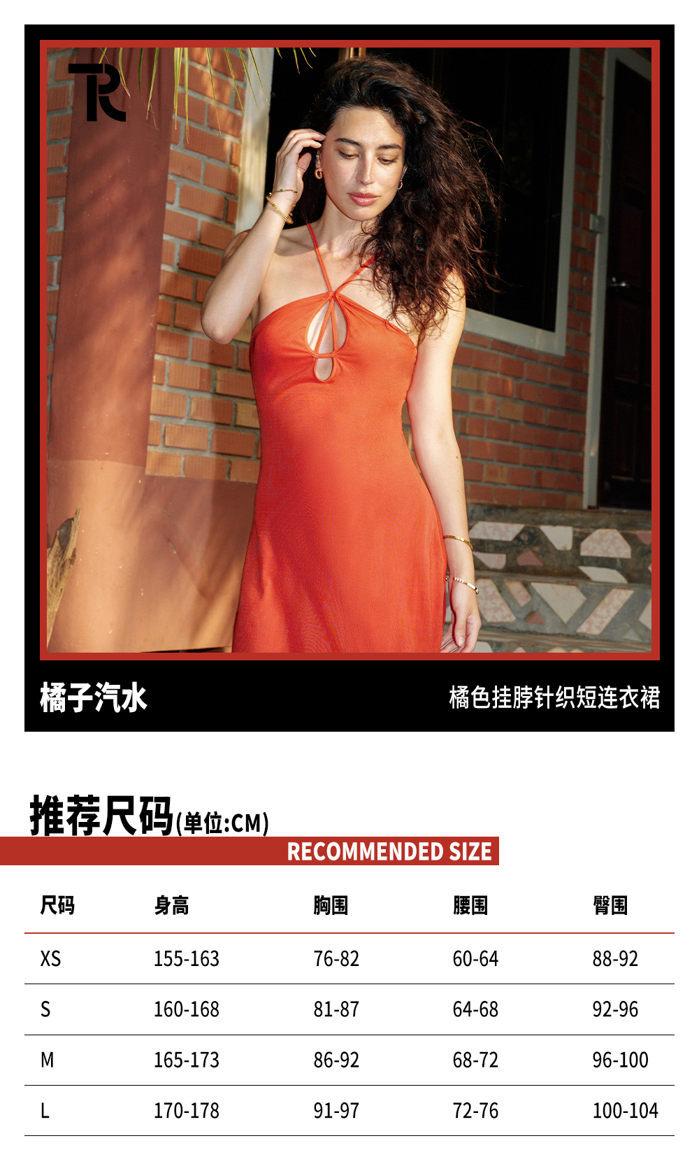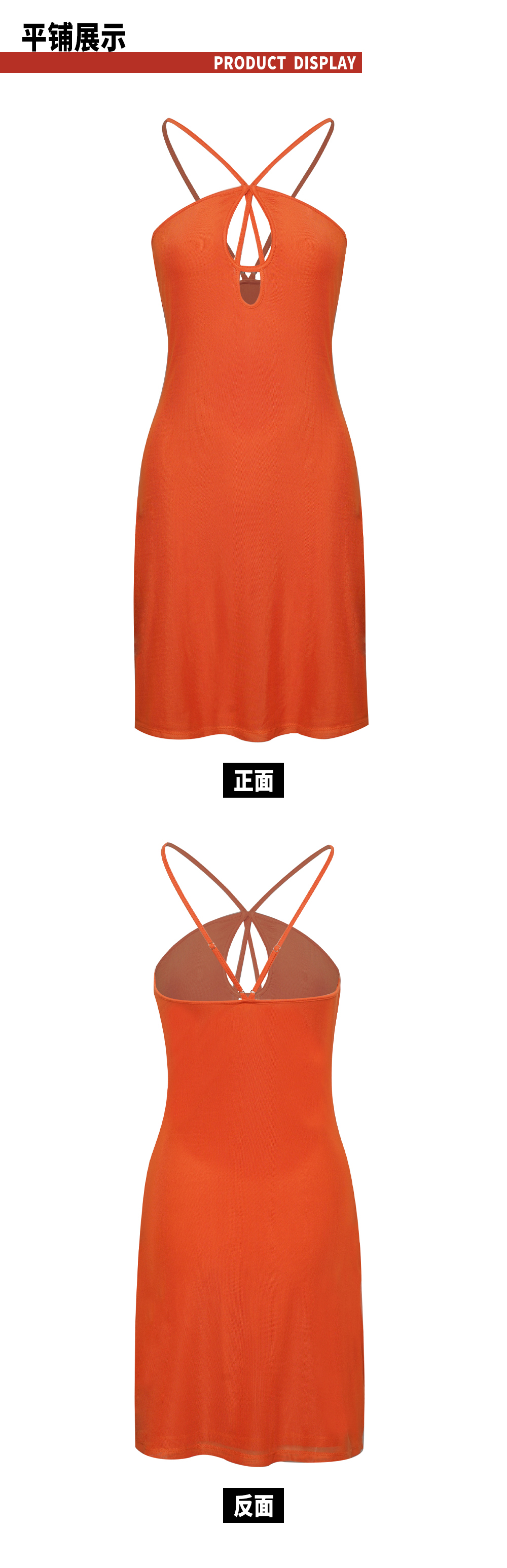 TR她热 橘子汽水 橘色针织网纱弹力镂空度假性感挂脖连衣裙