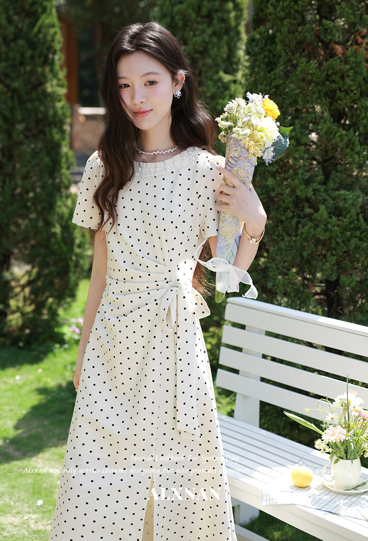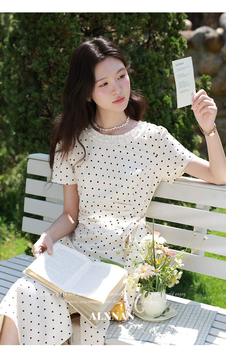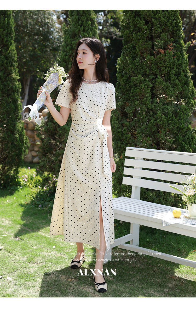 鹿向南「春野杏时」法式杏色波点连衣裙夏季新款气质修身短袖裙子