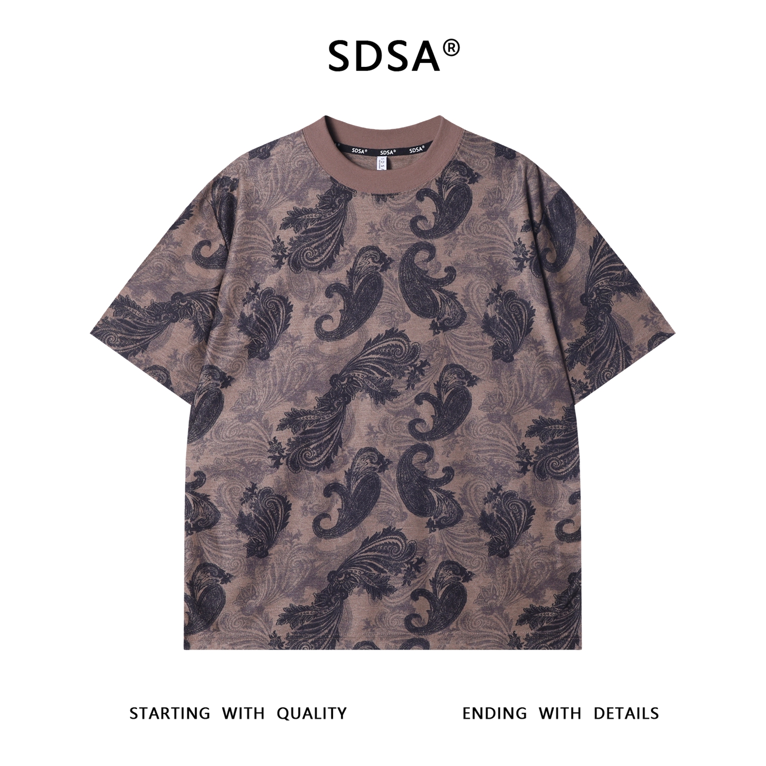 T3532夏季高级感新款男士磨毛撞色圆领短袖T恤抽象羽毛图案设计上衣