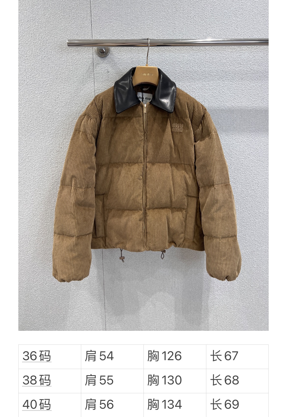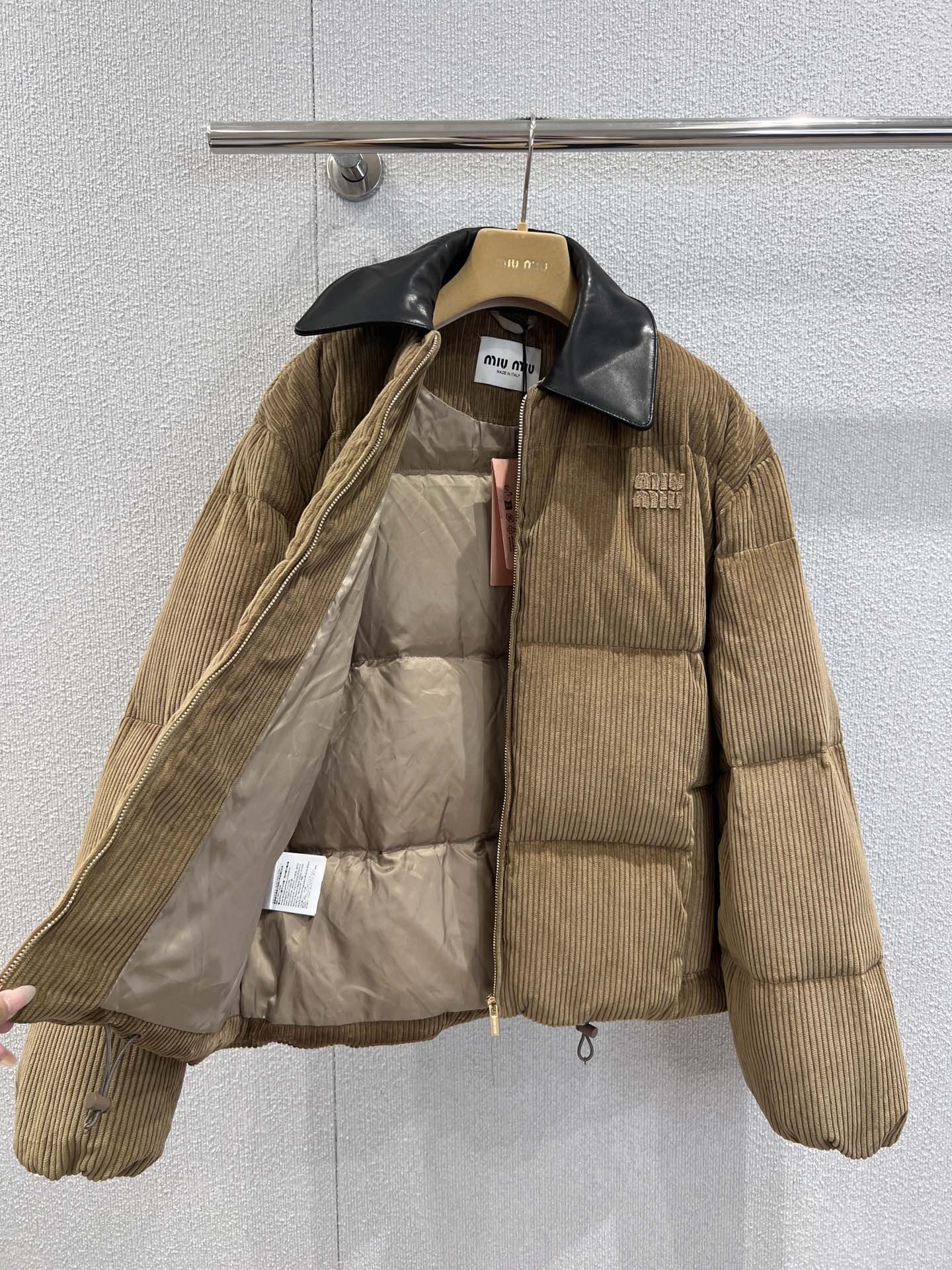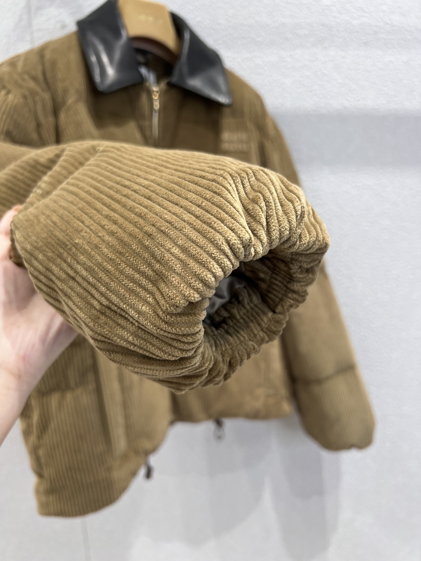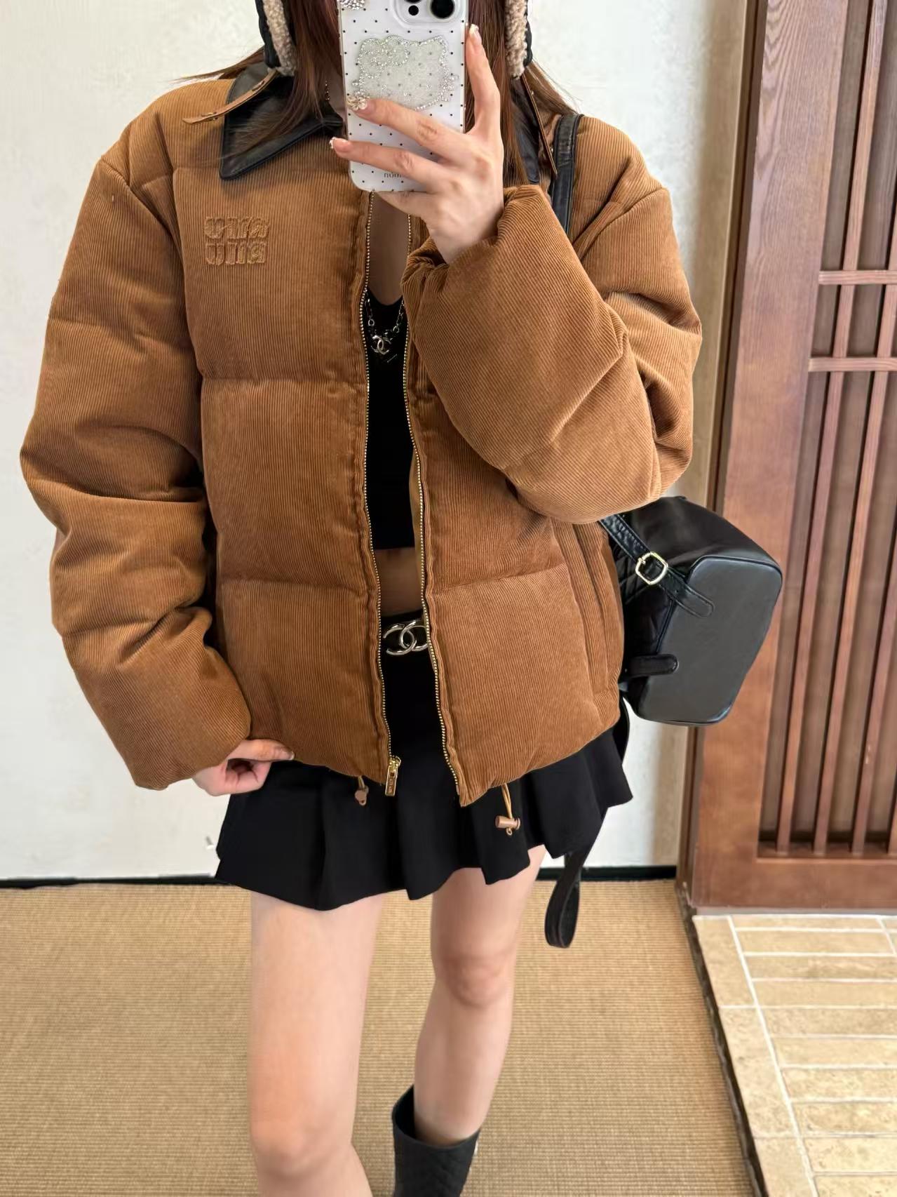 MiuMi* 25Fw秋冬新款 灯芯绒拼牛皮领羽绒服外套丨⚠独家yb开发!高版出品!甄选复古棕调灯芯绒面料,竖纹肌理自带岁月质感,在光线中晕染出细腻的层次;黑色真牛皮革翻领的拼接设计,为整体注入酷感锋芒,是甜妹与酷姐风格切换的点睛之笔。廓形上采用oversize蓬松剪裁,既能包容各种内搭,又以“面包服”式的松弛感,营造出随性不羁的冬日造型感。
