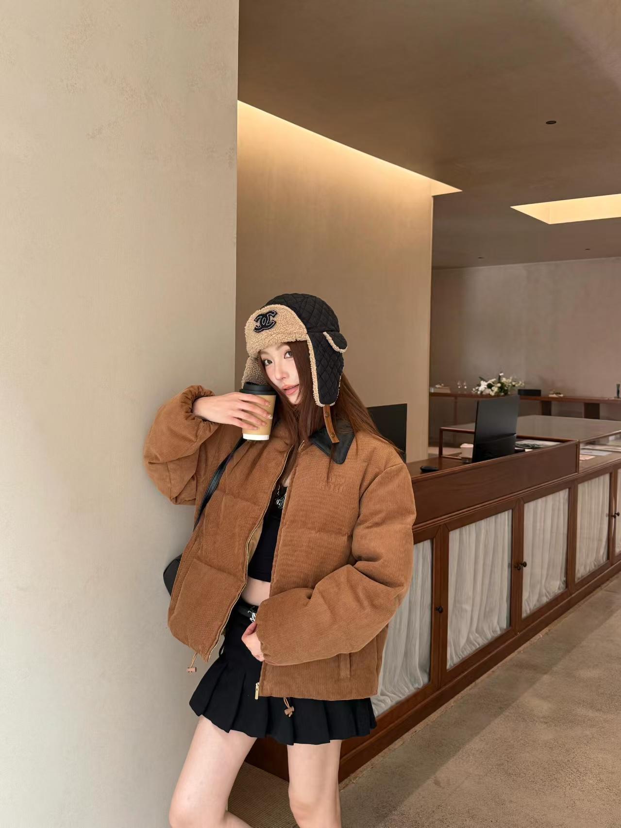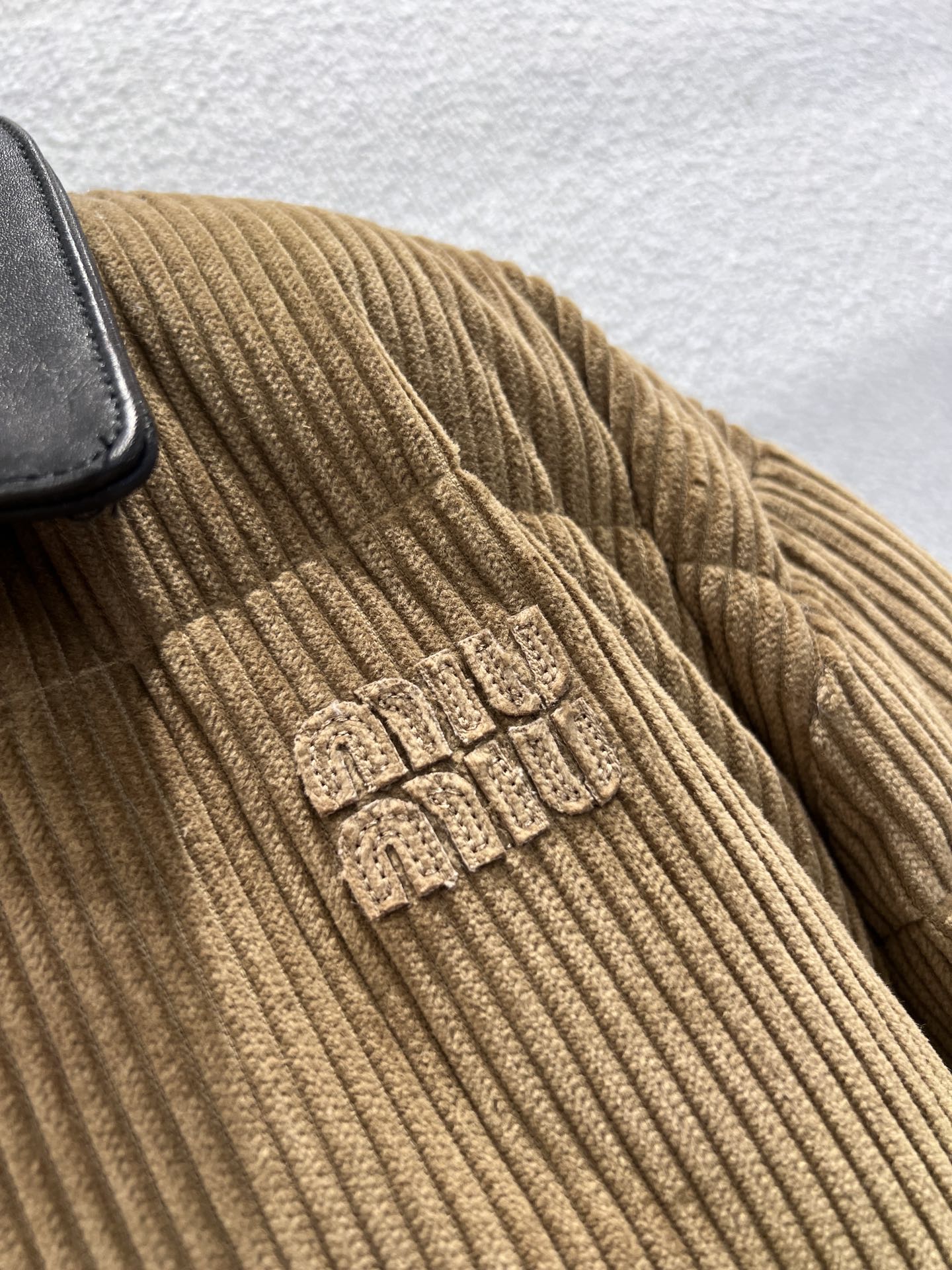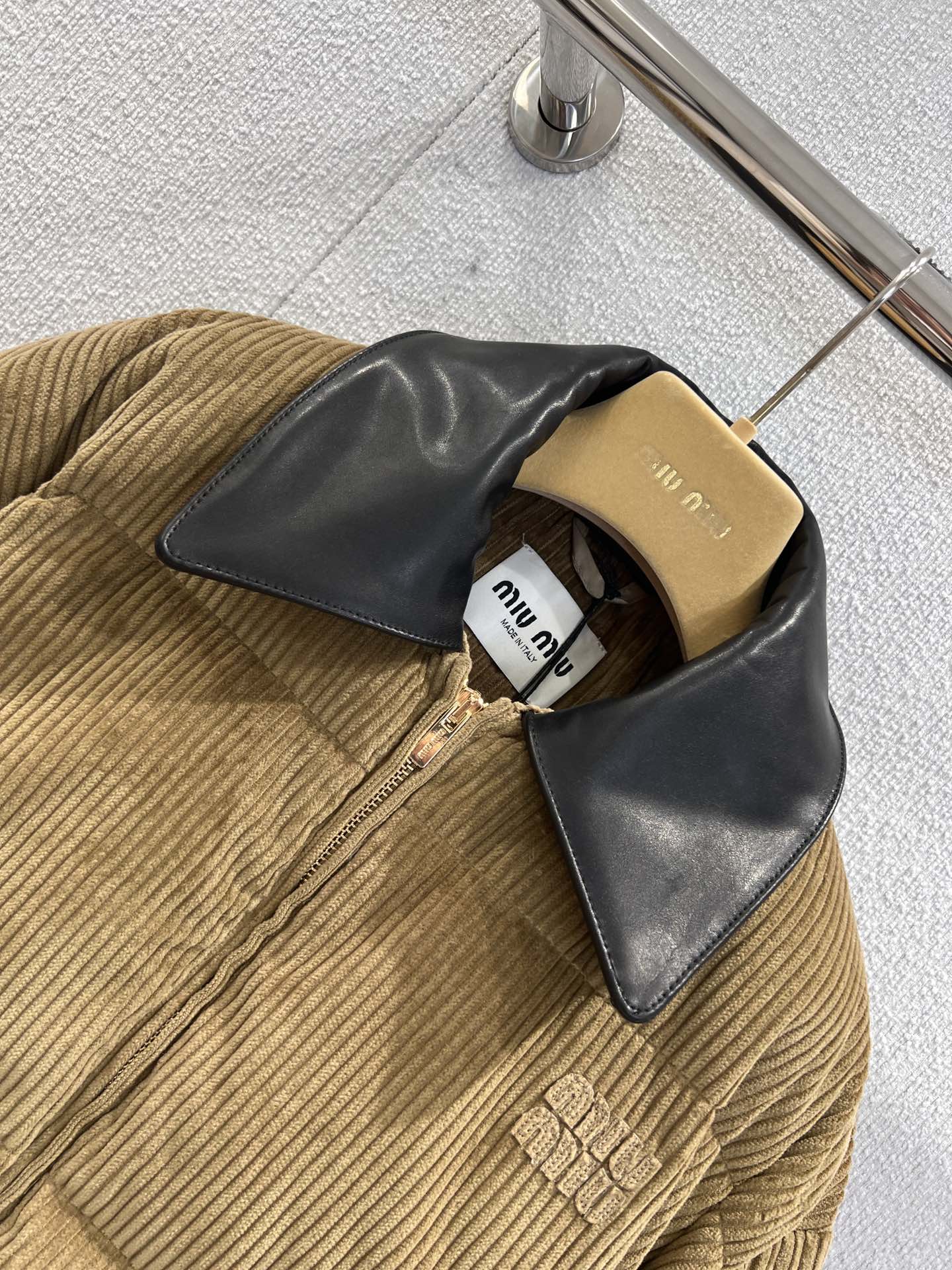 MiuMi* 25Fw秋冬新款 灯芯绒拼牛皮领羽绒服外套丨⚠独家yb开发!高版出品!甄选复古棕调灯芯绒面料,竖纹肌理自带岁月质感,在光线中晕染出细腻的层次;黑色真牛皮革翻领的拼接设计,为整体注入酷感锋芒,是甜妹与酷姐风格切换的点睛之笔。廓形上采用oversize蓬松剪裁,既能包容各种内搭,又以“面包服”式的松弛感,营造出随性不羁的冬日造型感。