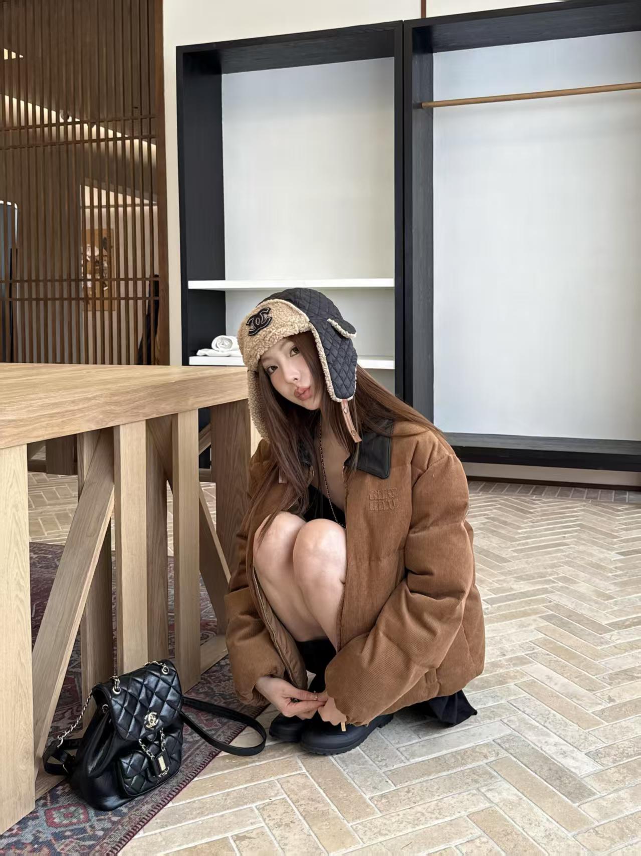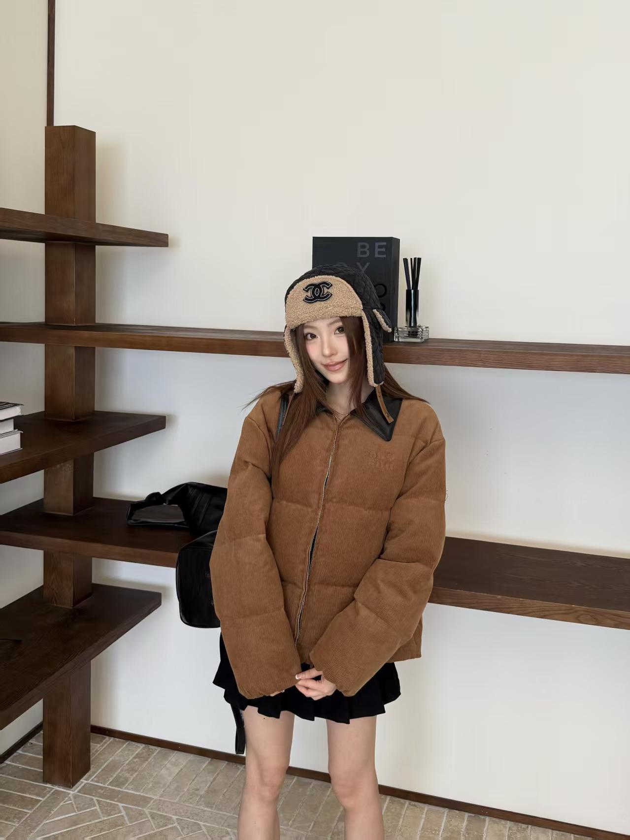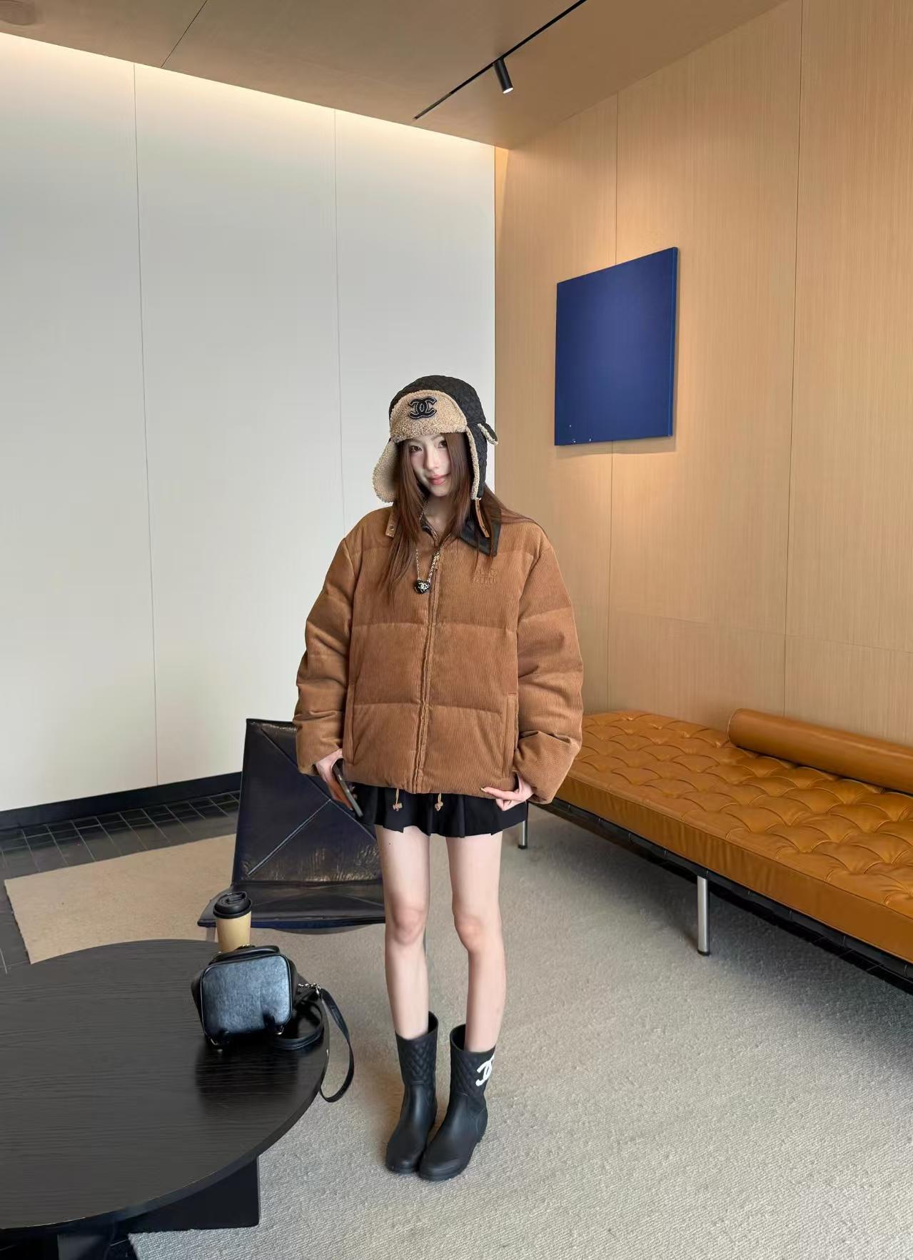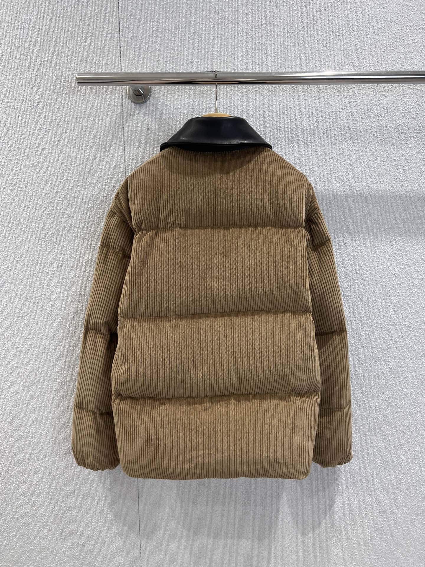 MiuMi* 25Fw秋冬新款 灯芯绒拼牛皮领羽绒服外套丨⚠独家yb开发!高版出品!甄选复古棕调灯芯绒面料,竖纹肌理自带岁月质感,在光线中晕染出细腻的层次;黑色真牛皮革翻领的拼接设计,为整体注入酷感锋芒,是甜妹与酷姐风格切换的点睛之笔。廓形上采用oversize蓬松剪裁,既能包容各种内搭,又以“面包服”式的松弛感,营造出随性不羁的冬日造型感。