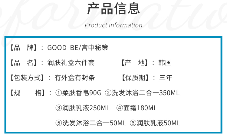 品牌名称:宫密策六件套 品牌发源地:韩国