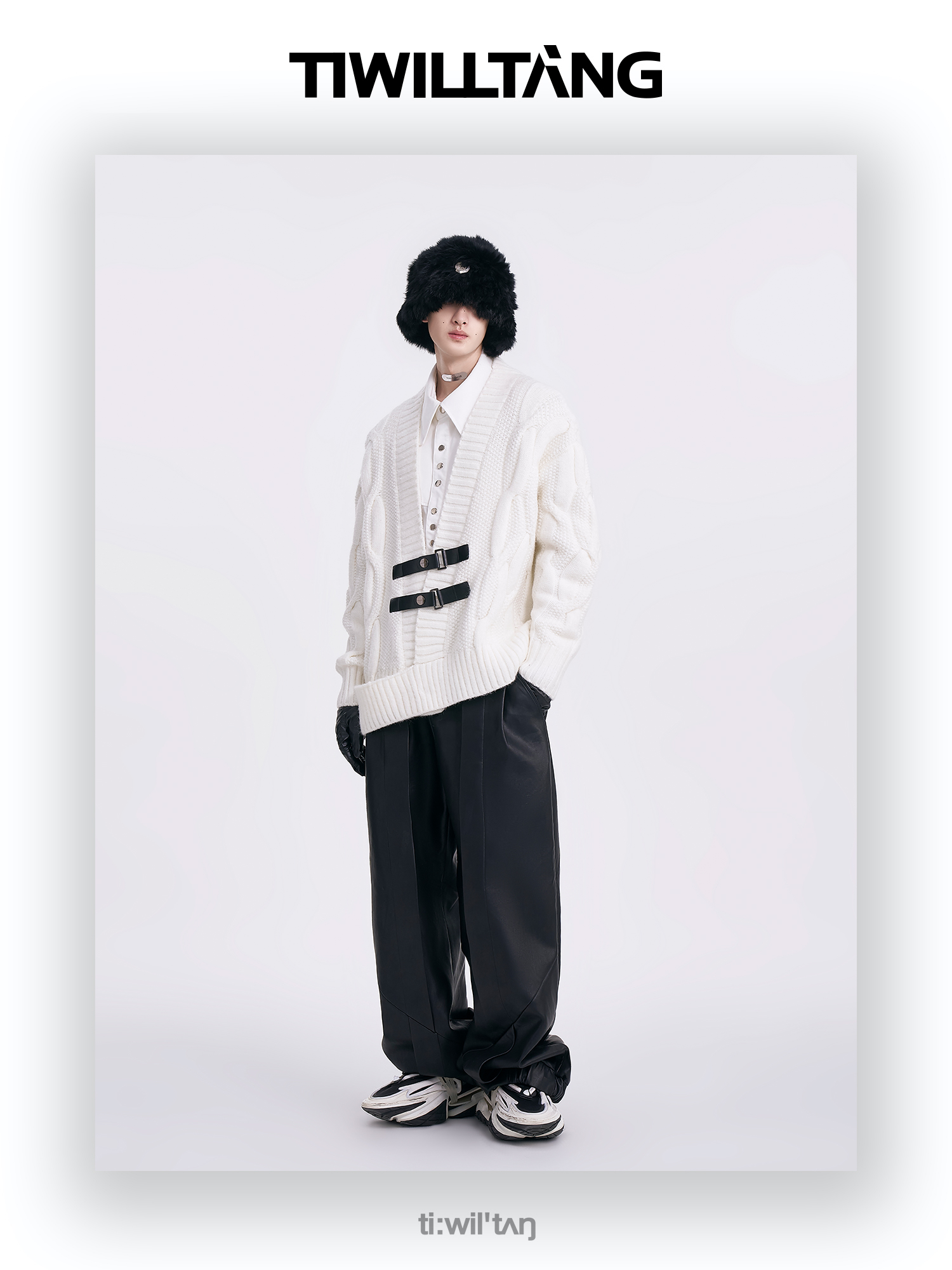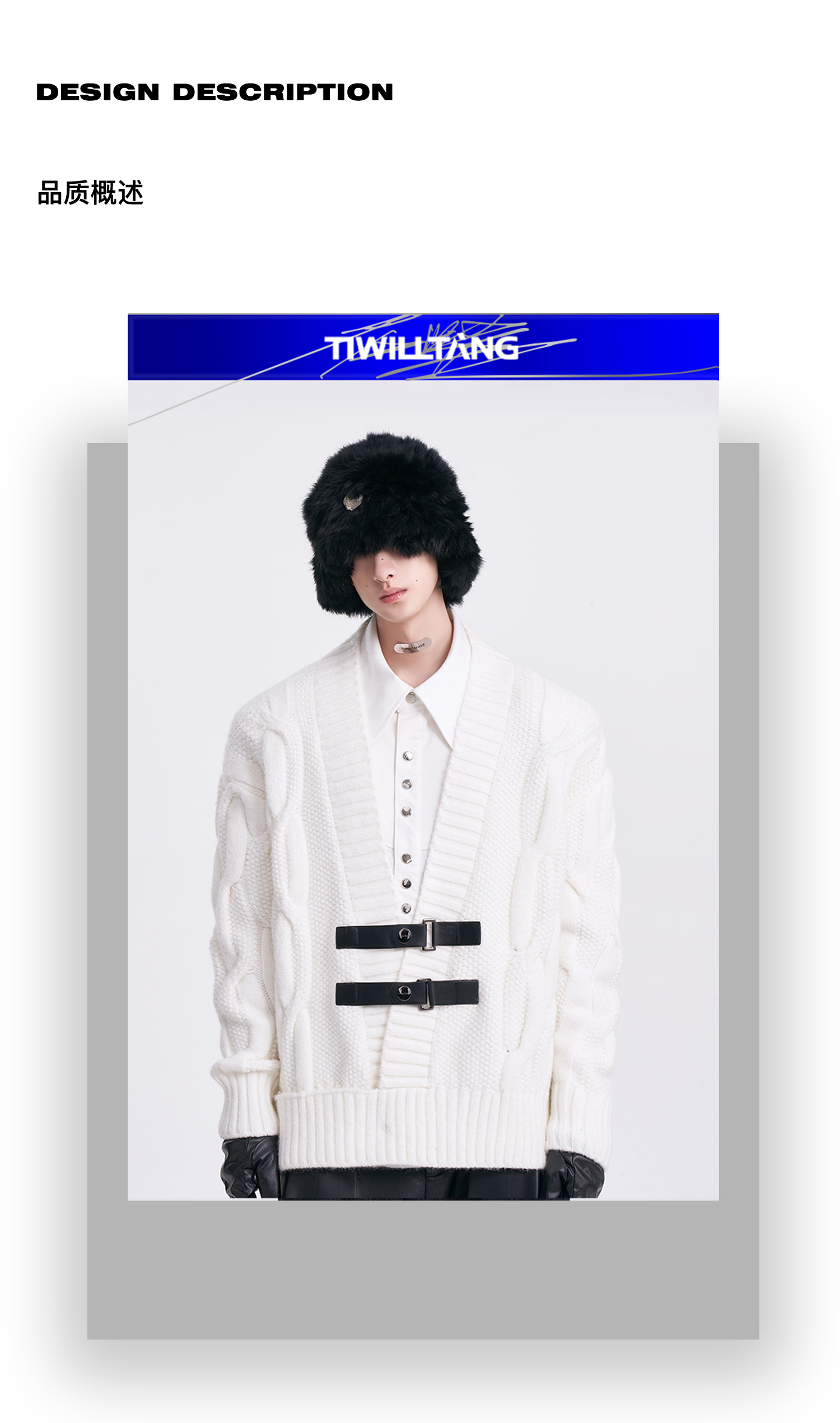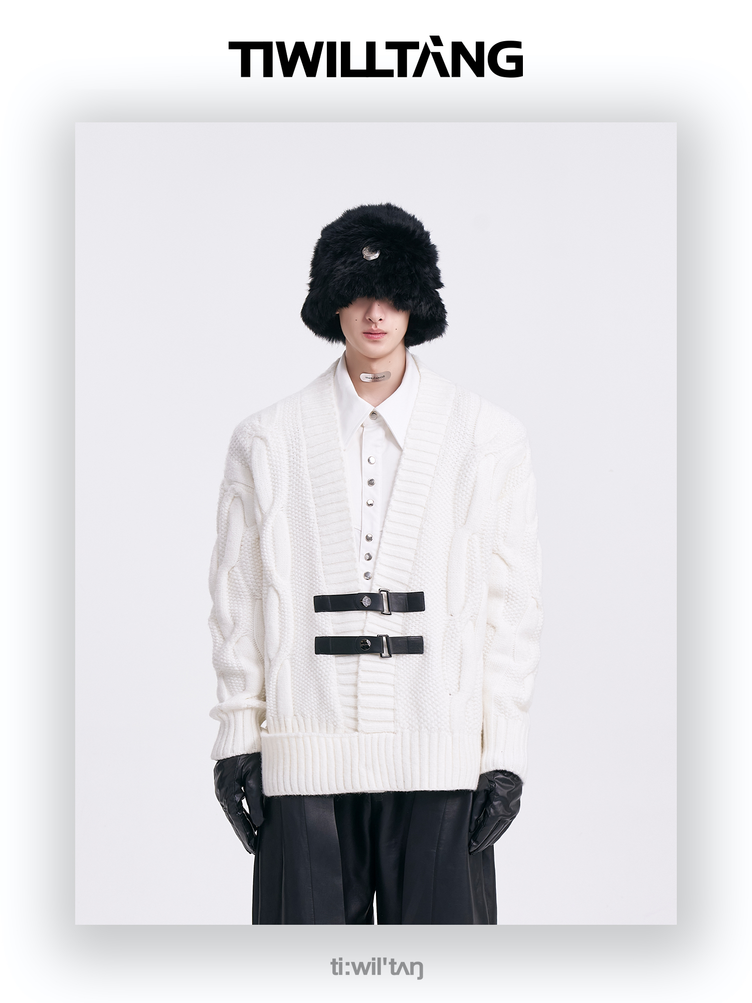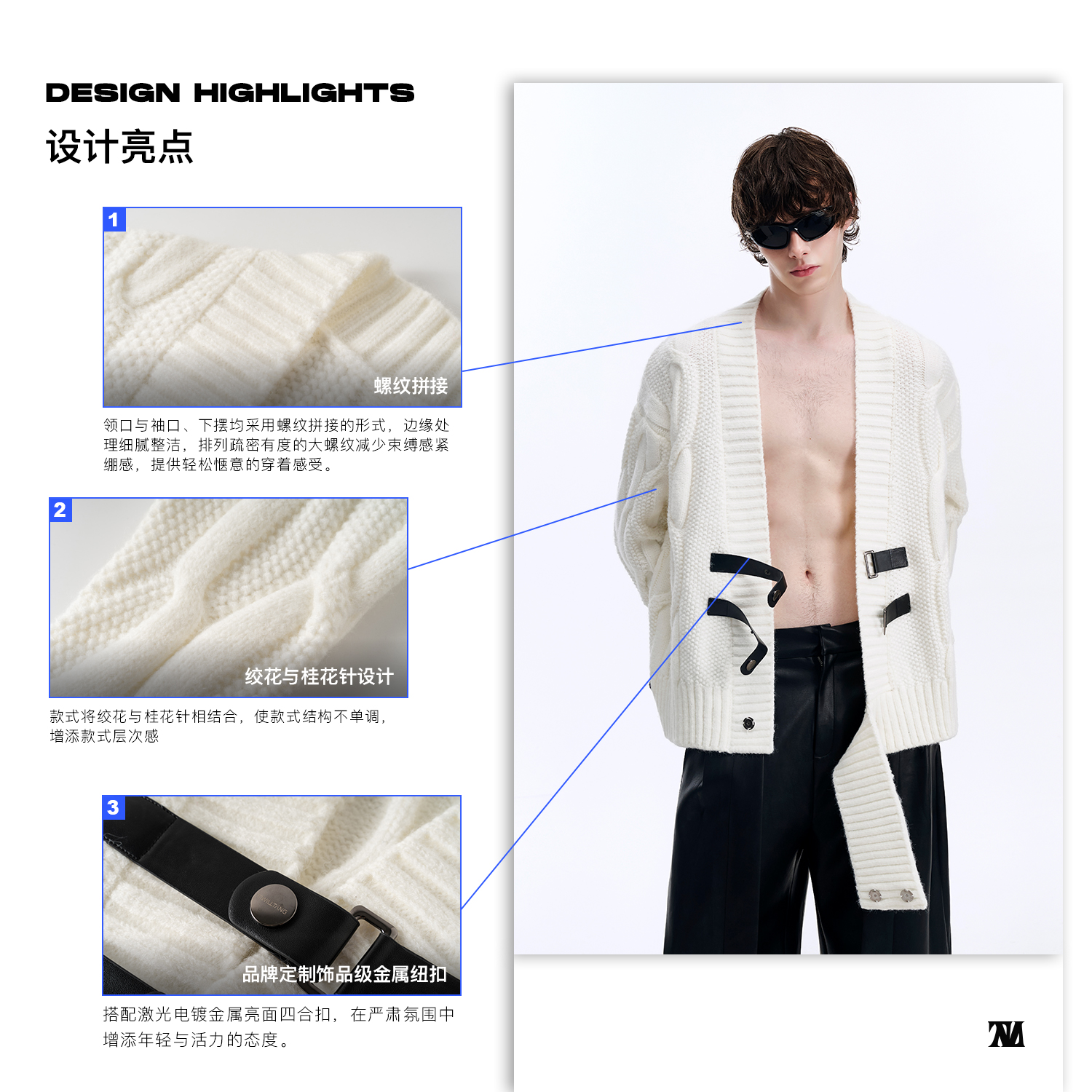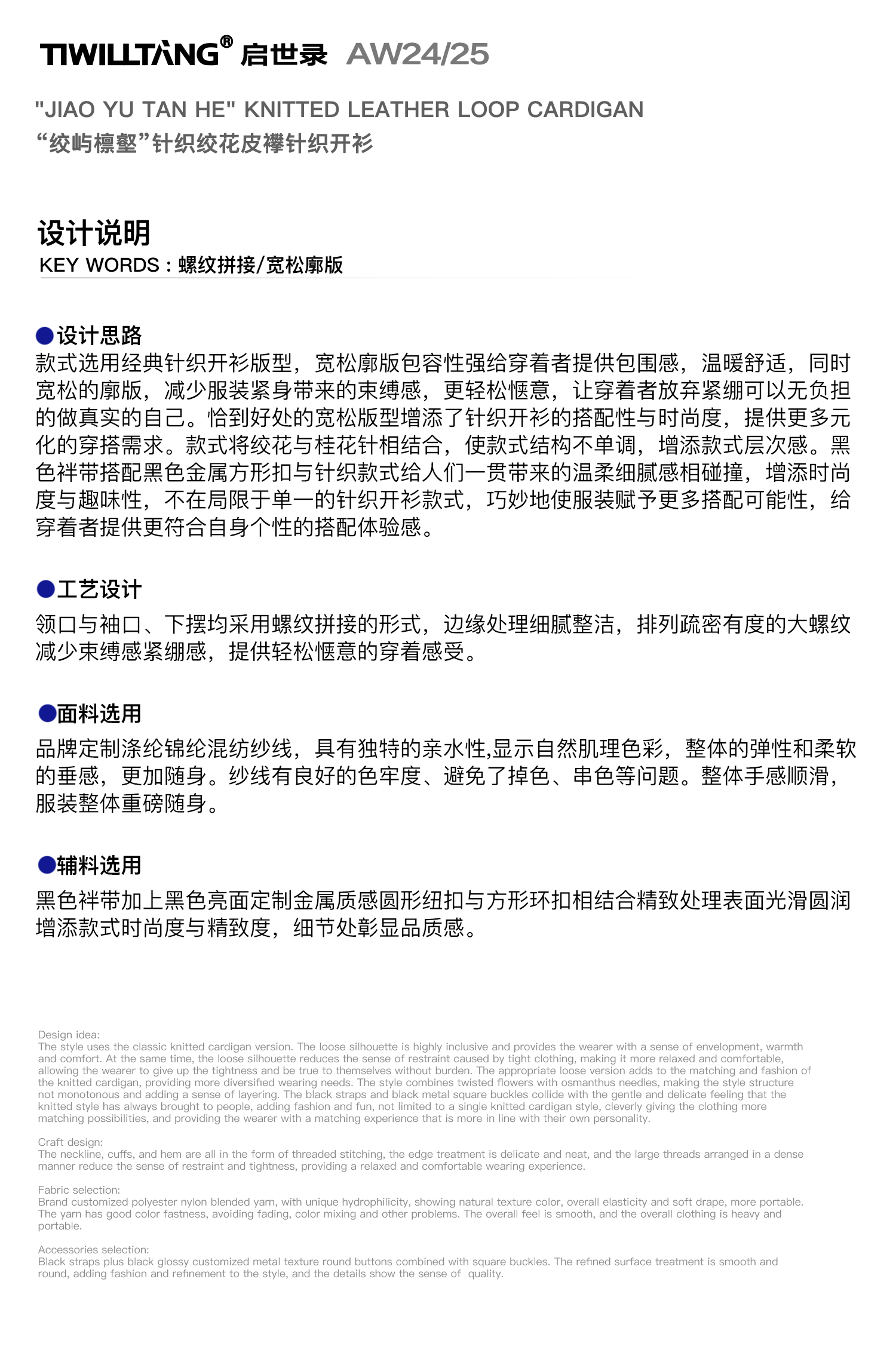 启世录TIWILLTANG“绞屿檩壑”螺纹拼接宽松廓版绞花针织皮襻开衫