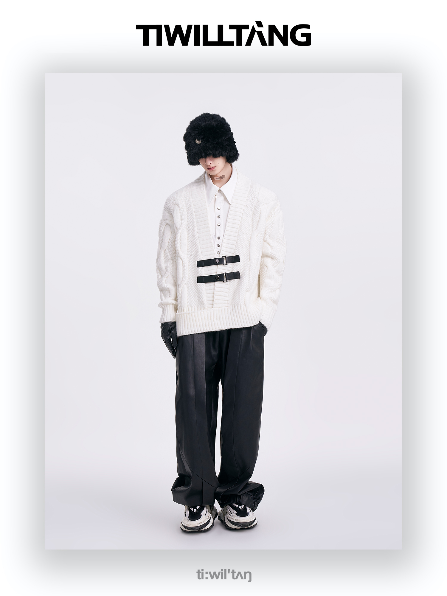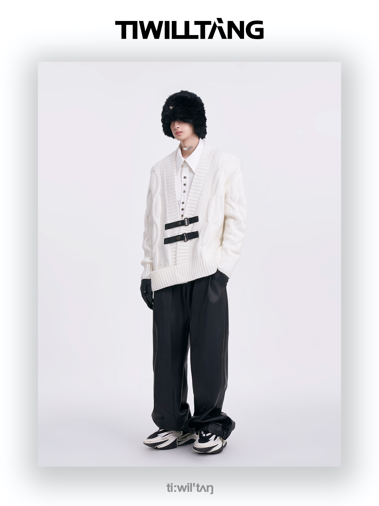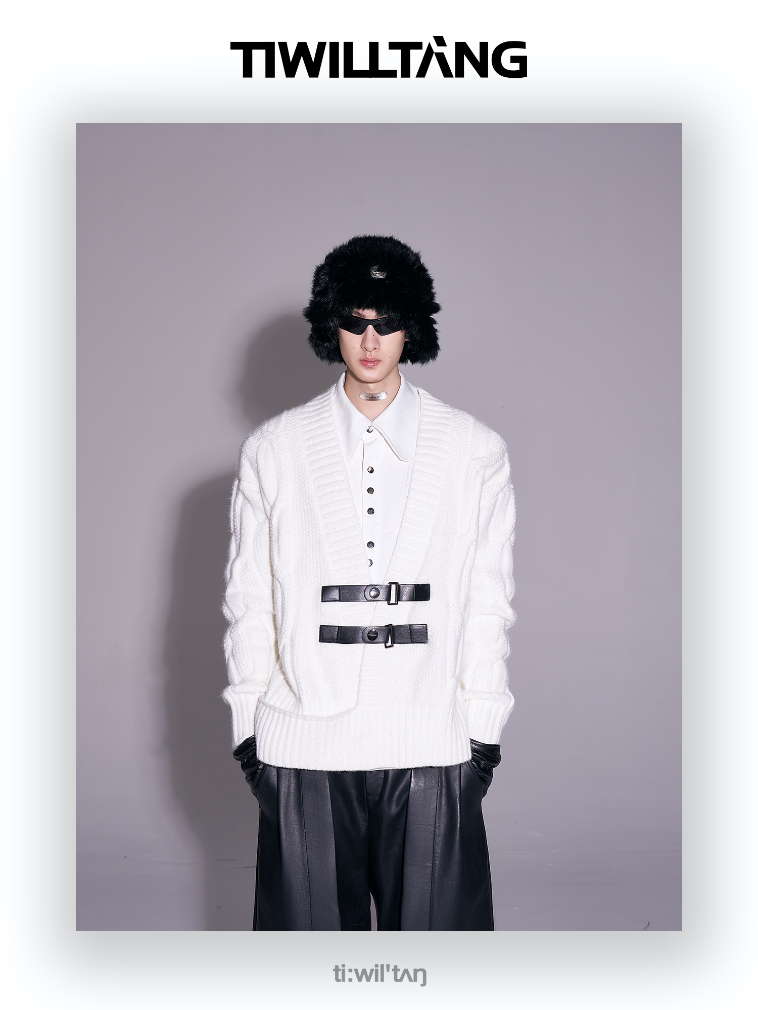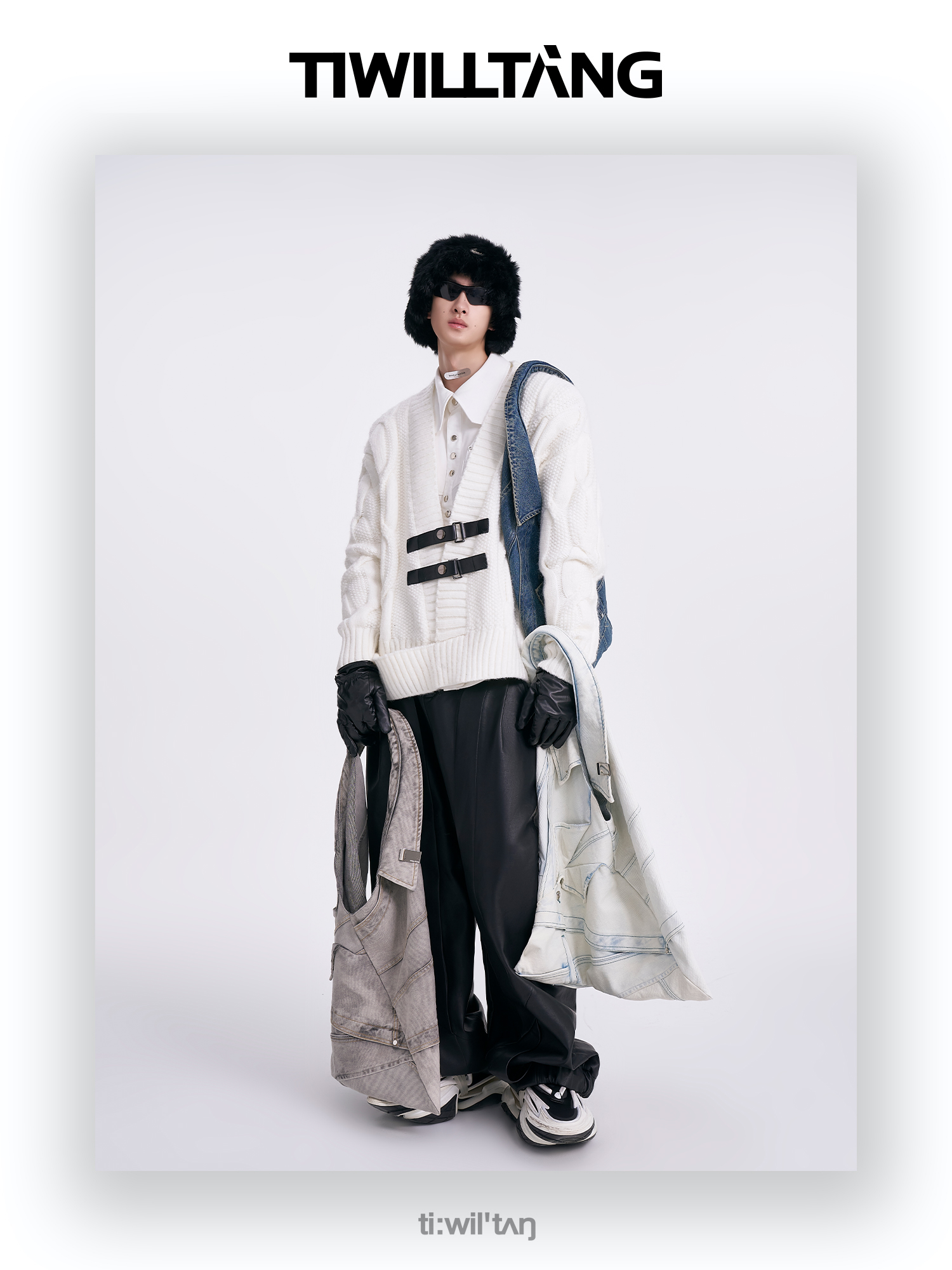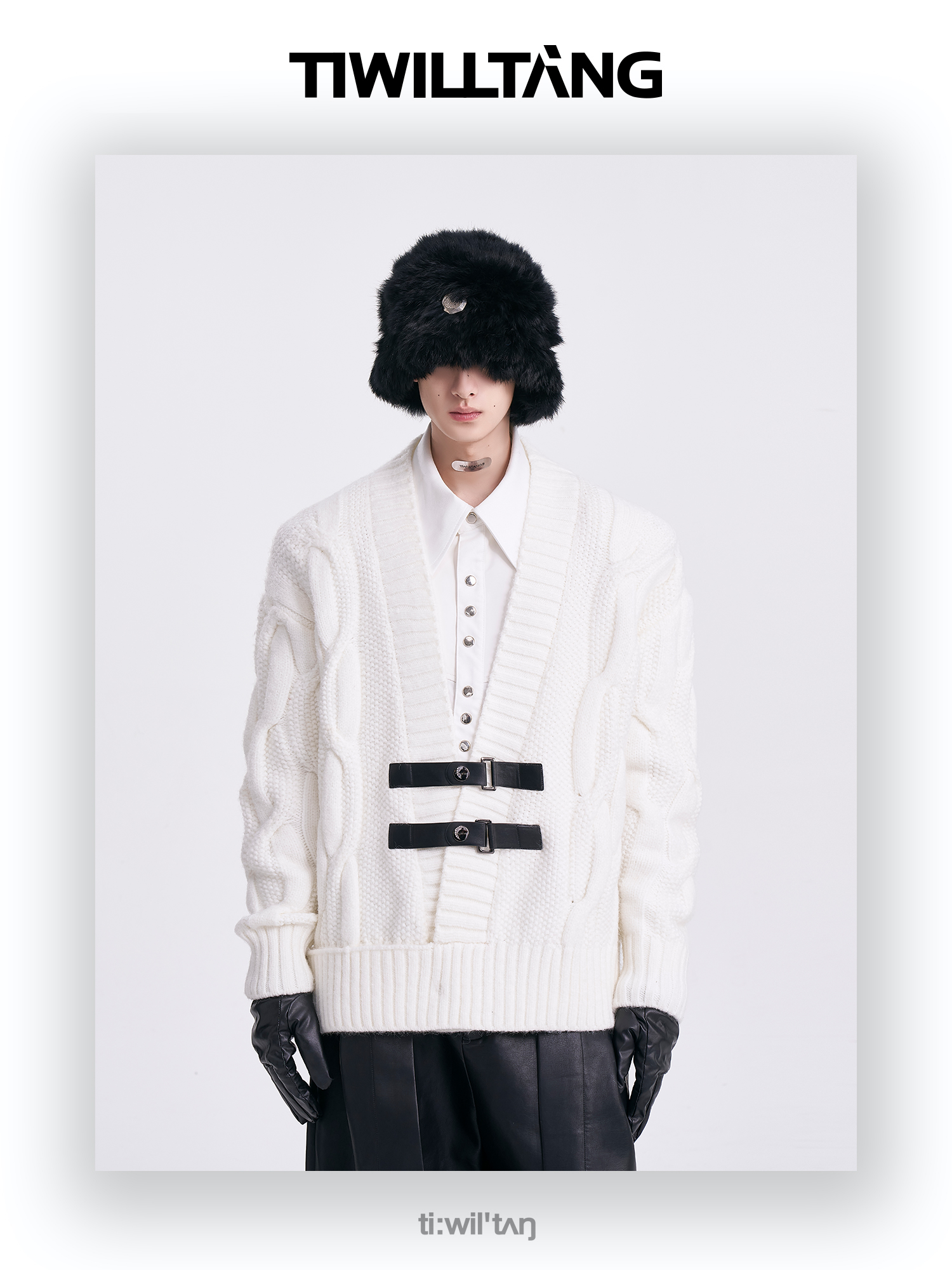 启世录TIWILLTANG“绞屿檩壑”螺纹拼接宽松廓版绞花针织皮襻开衫
