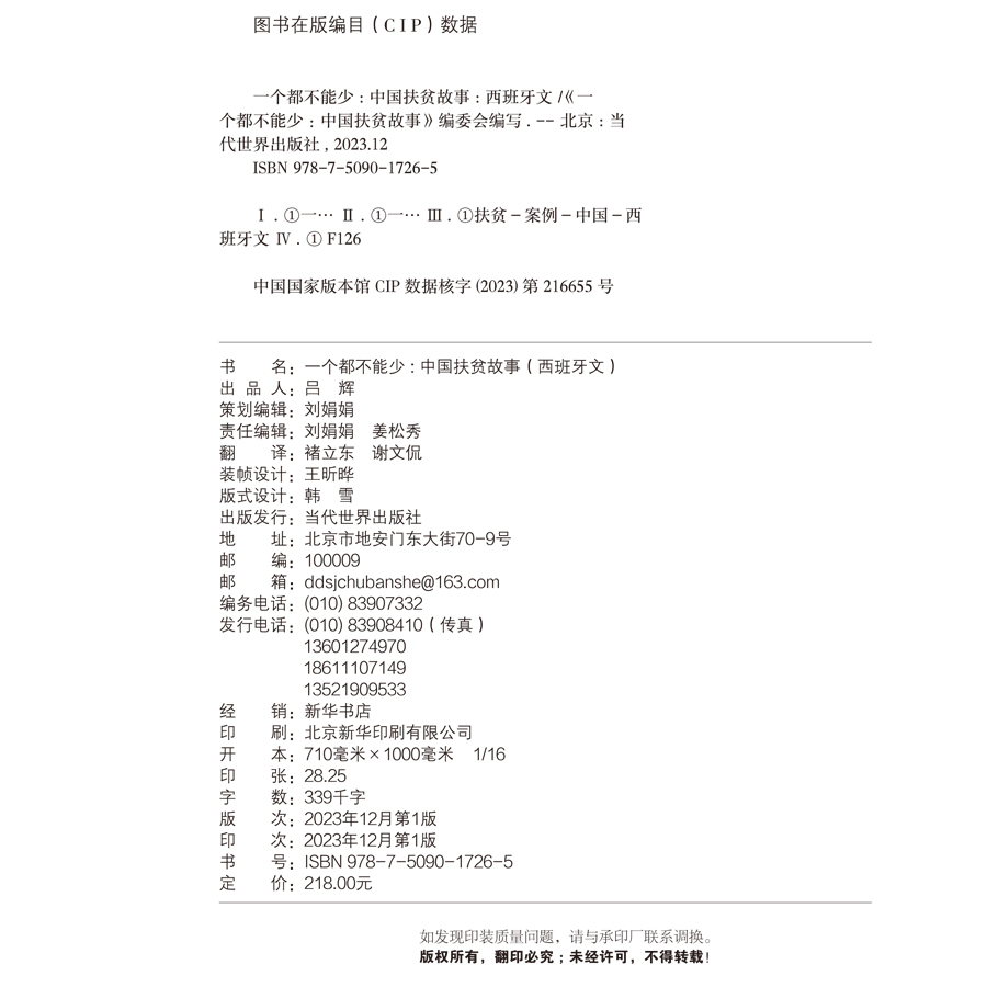 《一个都不能少:中国扶贫故事》西文版为《一个都不能少:中国扶贫故事》多语种版之一,其中文版和英文版已于2020年3月出版。本书以脱贫攻坚为主题,讲述了十八洞村、阜平县等21个地方精准扶贫的生动故事,聚焦式展示了产业扶贫、就业扶贫等中国特色扶贫模式,全景式展现了我国的大扶贫格局。西文译本的出版旨在向广大西语国家和地区分享中国特色扶贫的宝贵经验,为国际减贫事业贡献中国智慧、中国方案。